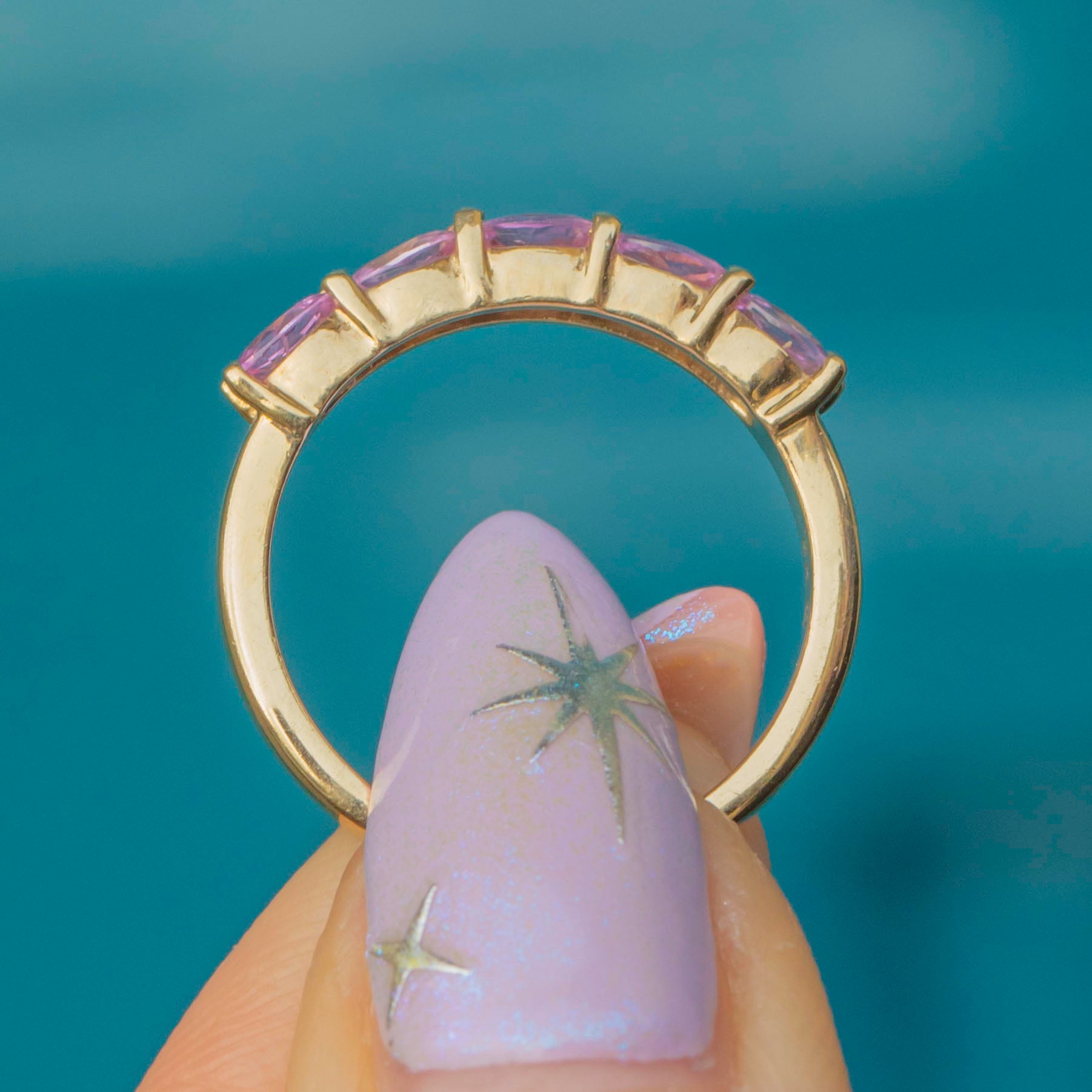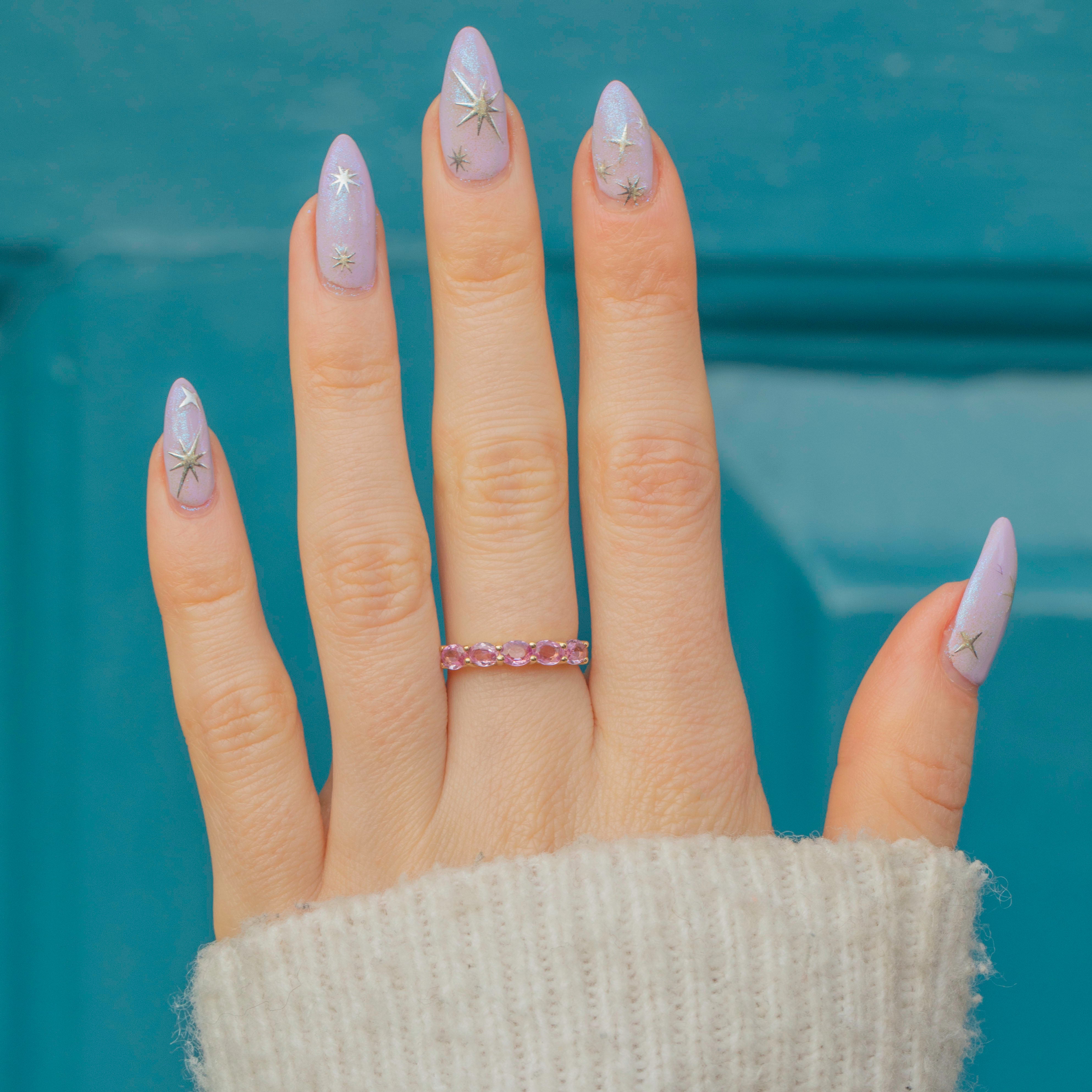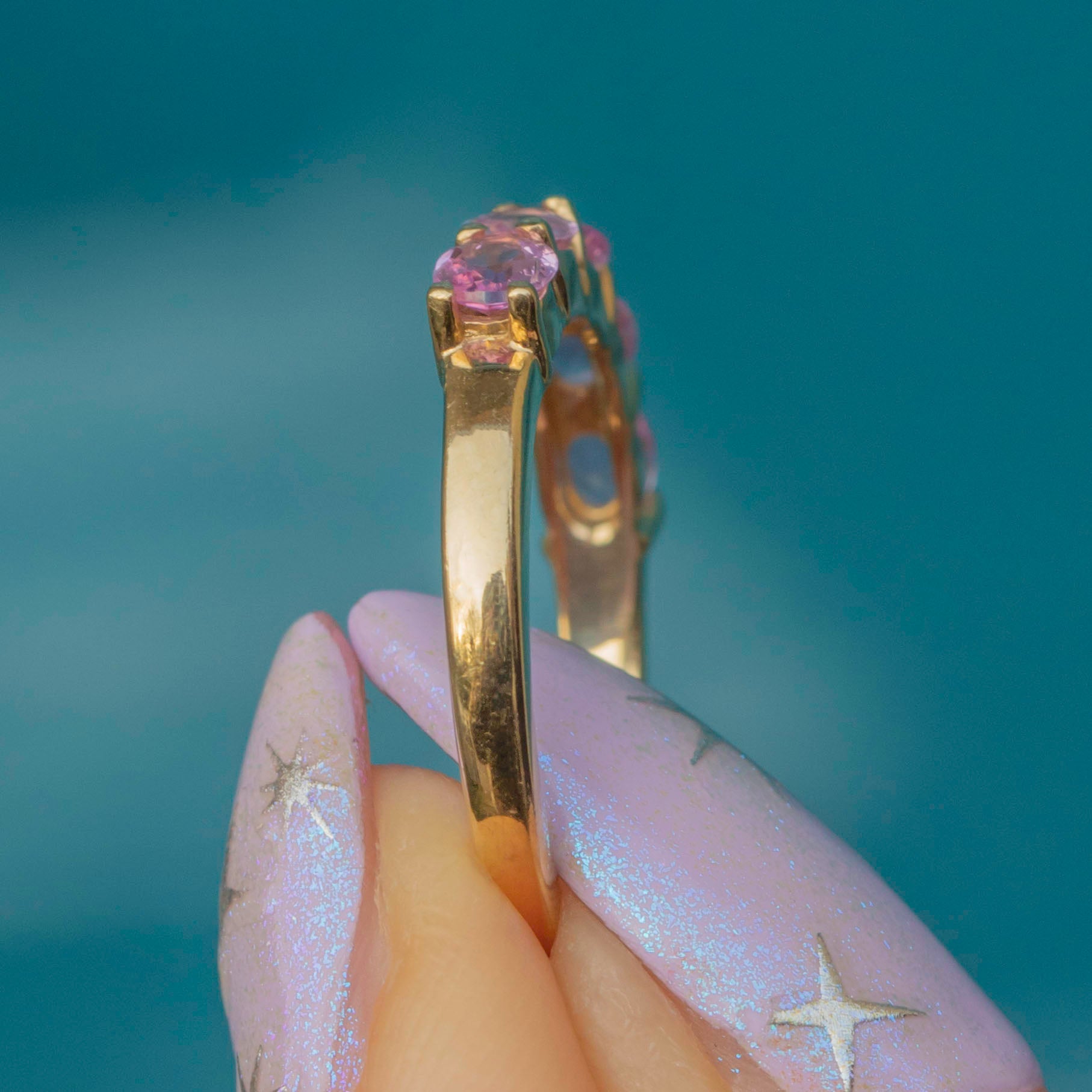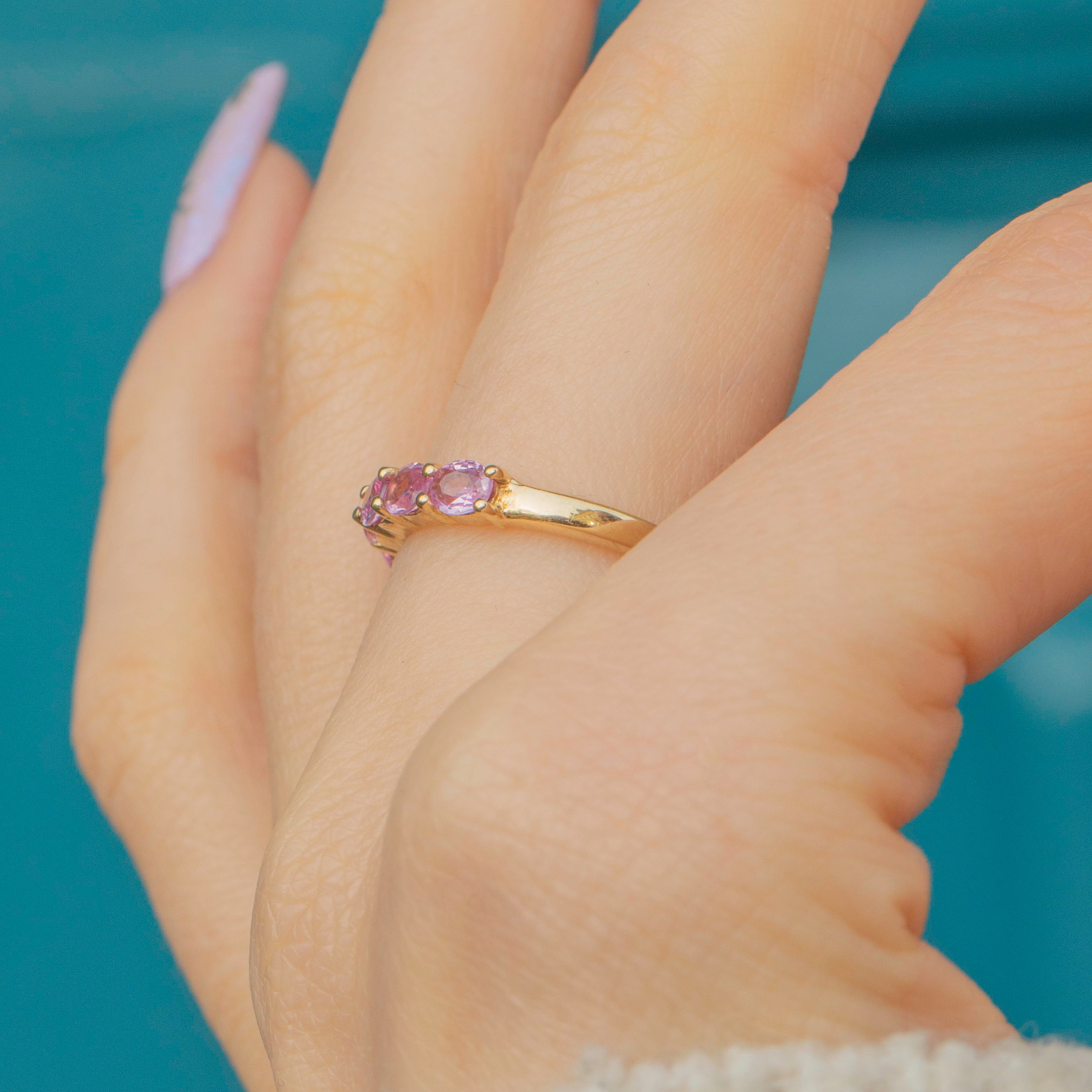 Crafted from buttery 9ct Gold, this eternity ring features five stunning pink Sapphires, each radiating soft rose hues as they catch the light. A symbol of eternal love, this Sapphire ring is the epitome of romance and is the perfect piece to add to your collection this valentines day!
