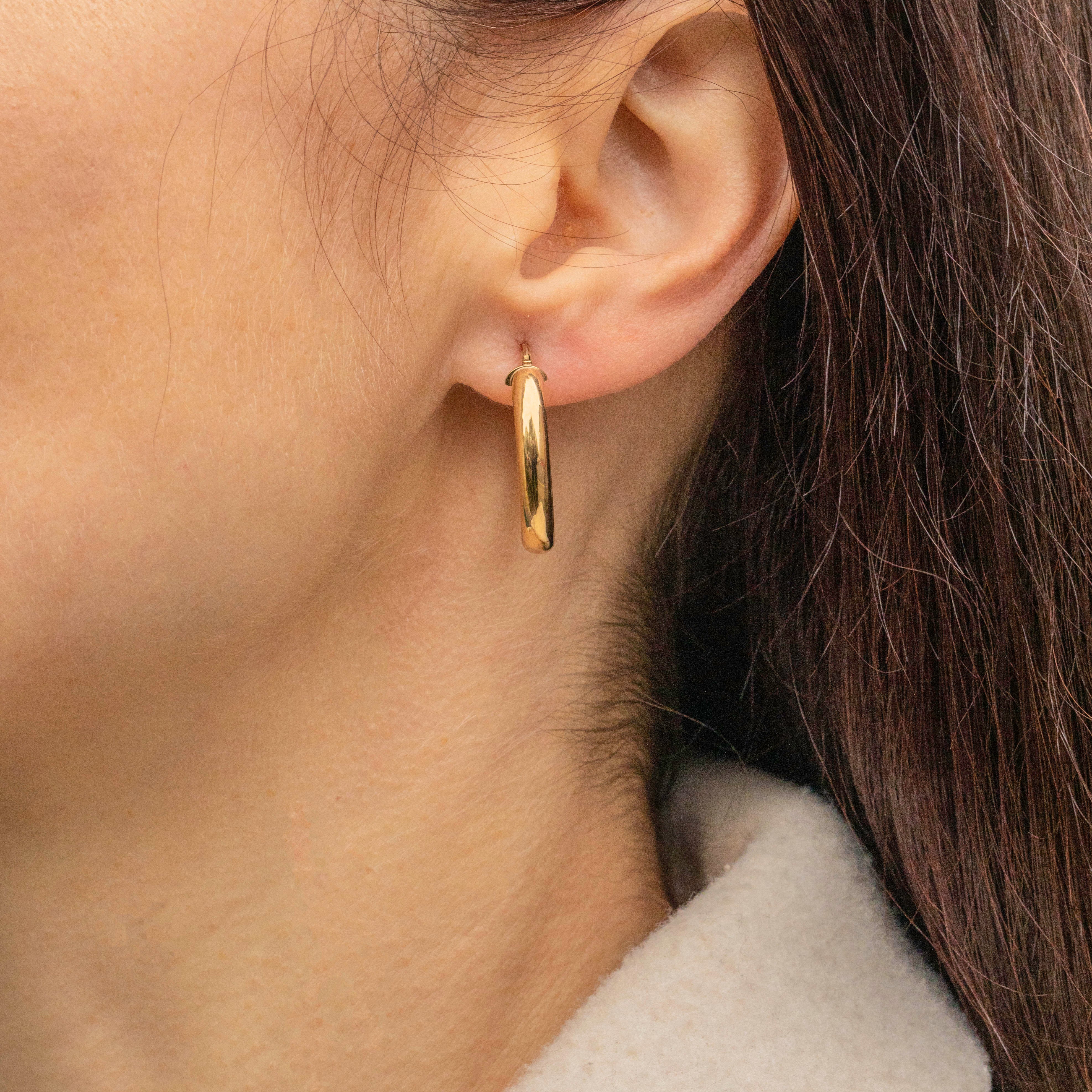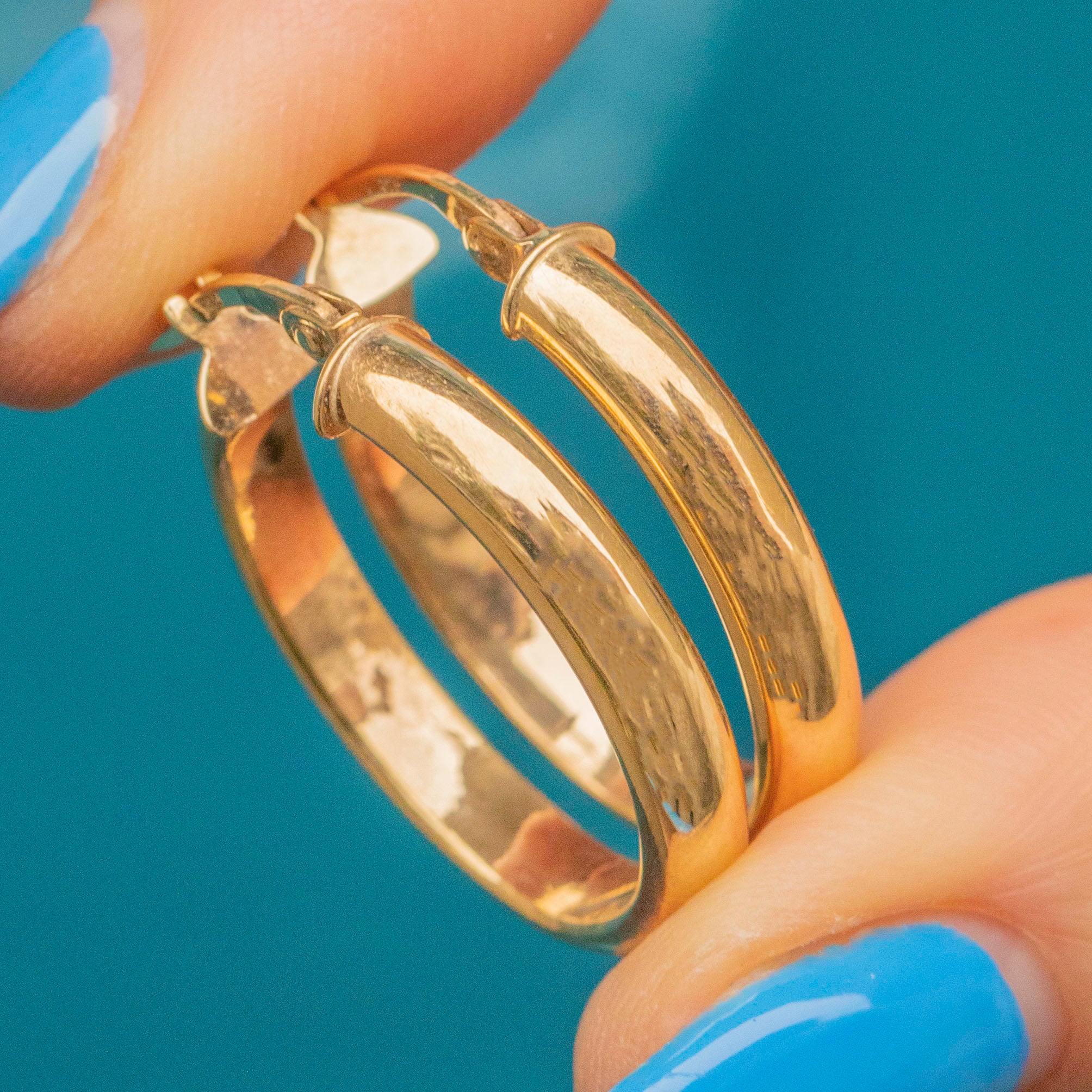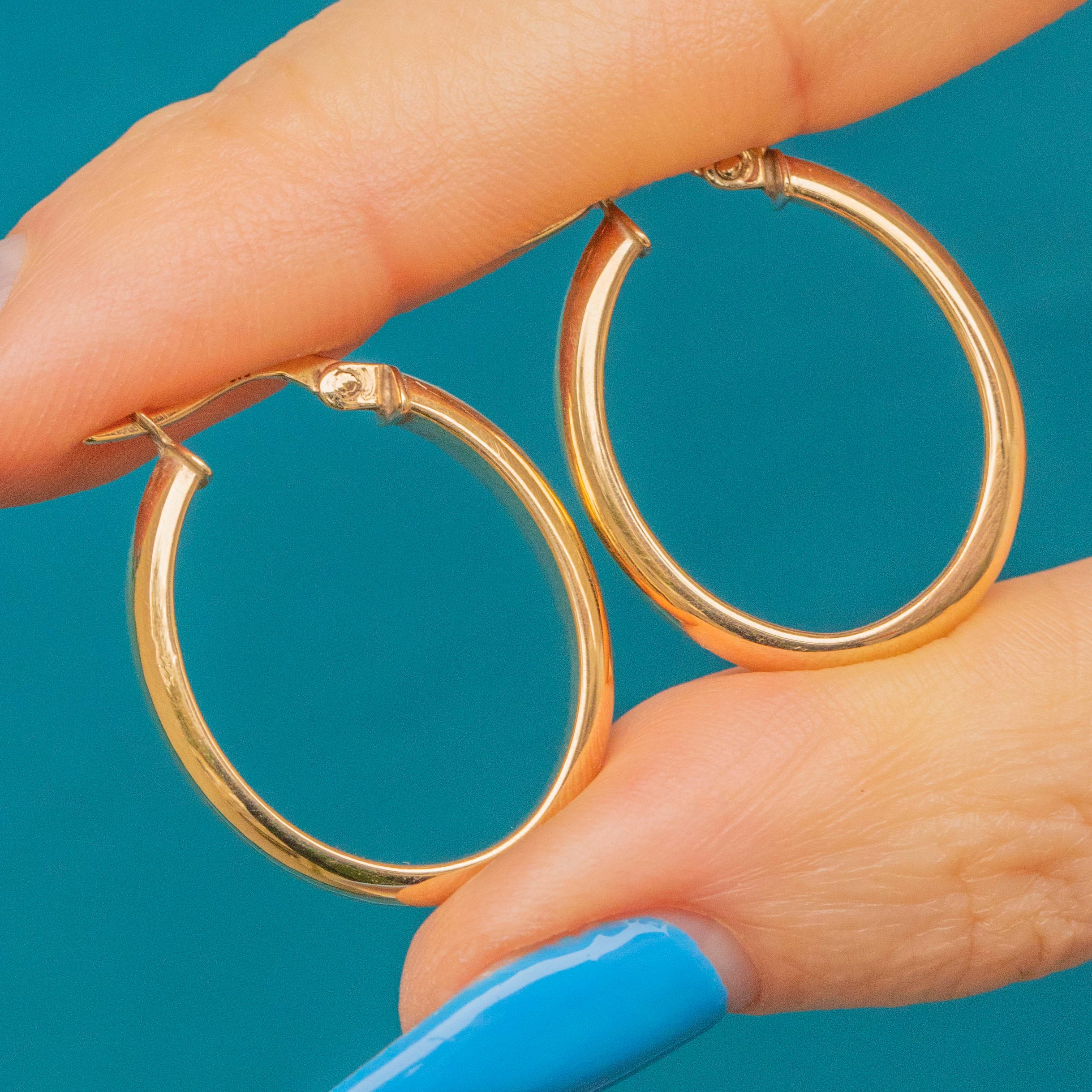 These 9ct Gold plain oval hoop earrings are the perfect understated, cool pair to add a vintage flair your look. A desirable size, these buttery 9ct hoops are subtle, sophisticated and wonderfully versatile.