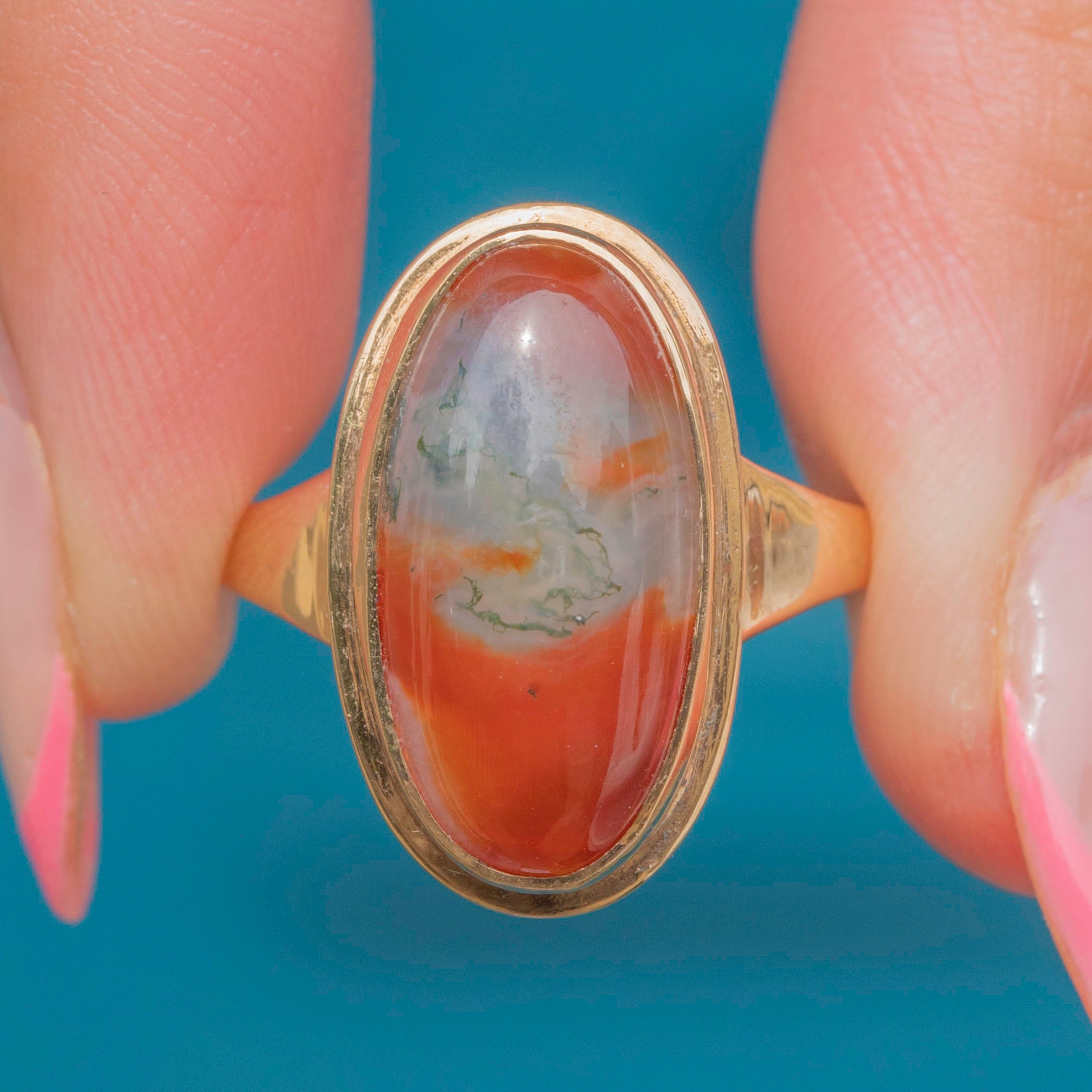 EXCELLENT: This 9ct Gold Red Moss Agate oval ring is in wonderful condition throughout! Her Red moss Agate is mesmerising, with her veins running through the entirety of her stone, having retained their deep red hue. Her Gold is glossy throughout and the ring has kept her structural integrity. You will never tire of looking at this vintage beauty!