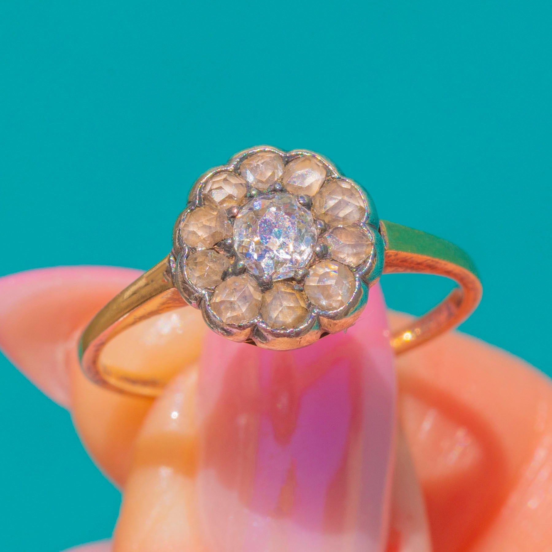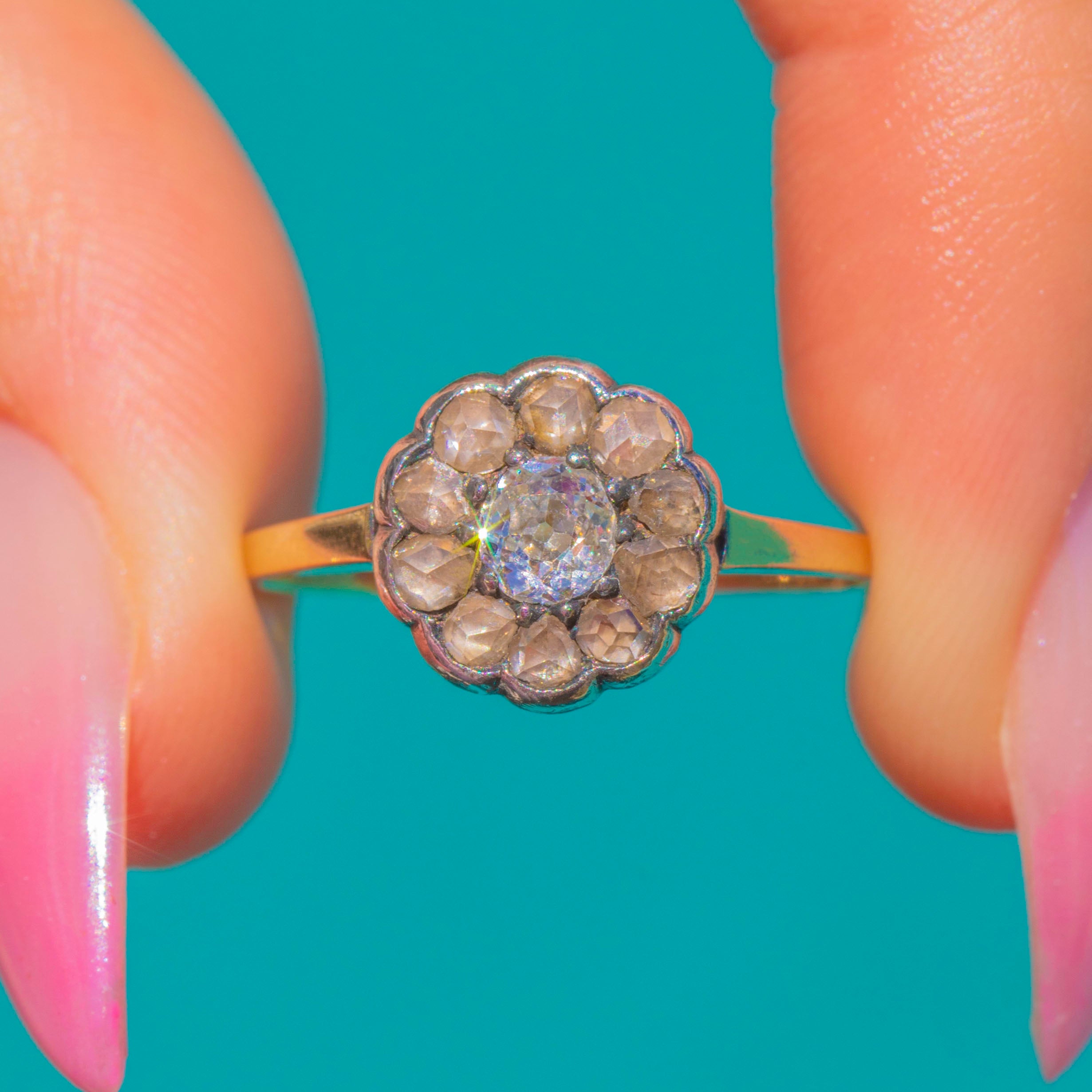 EXCELLENT: The Diamonds present brightly with no obvious chips, and the halo shows only minimal antique surface wear visible under magnification. The scalloped Silver settings and 9ct Gold shank are secure and well-preserved, with a light, even patina to the Silver that enhances the period character. No evidence of resizing or restoration noted.