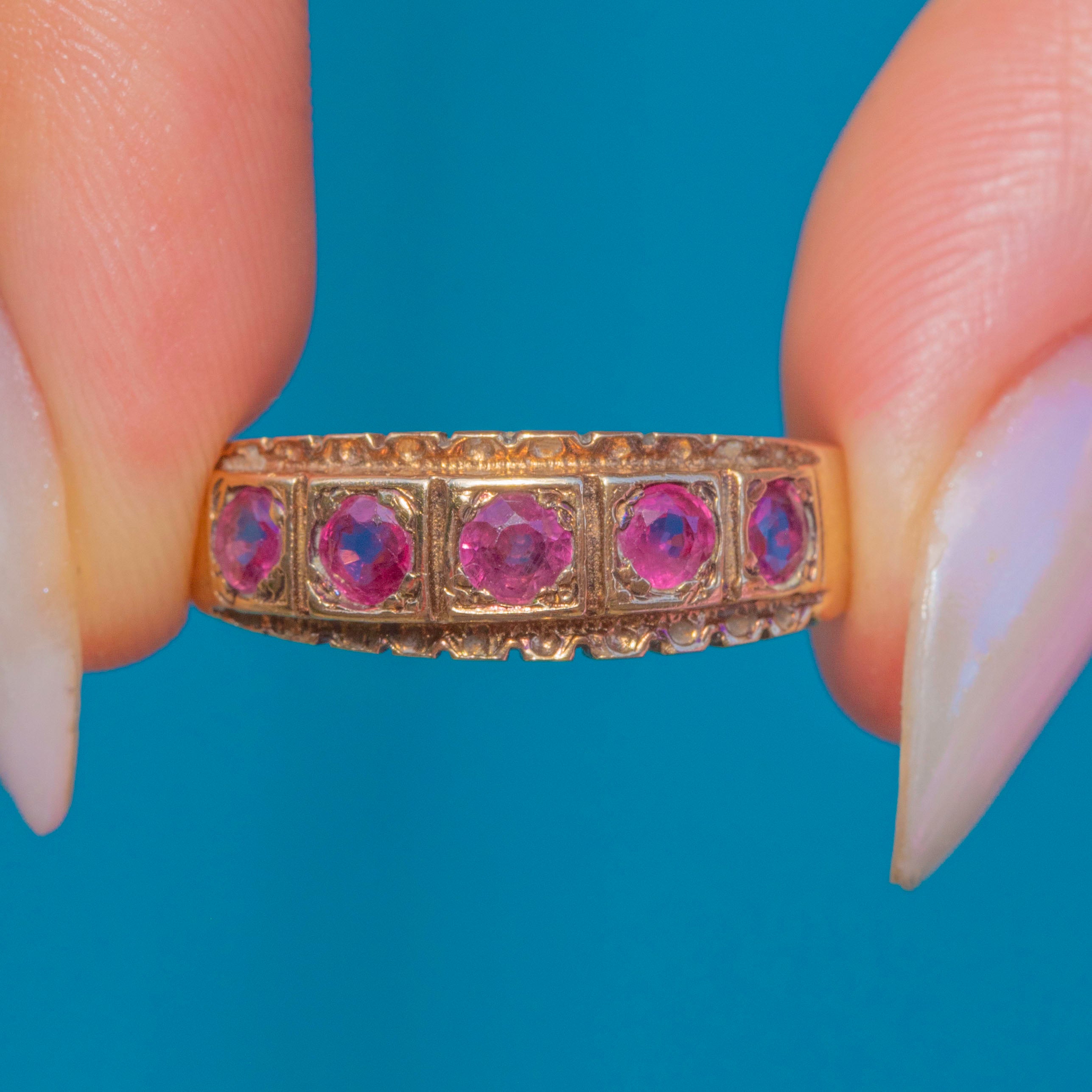 This gorgeous vintage gypsy ring has been ornately formed from solid 9ct Gold and displays five natural pink Rubies, with pretty soft raspberry undertones, that spread the width of the finger, and a flat profile that makes it perfect for everyday wear.