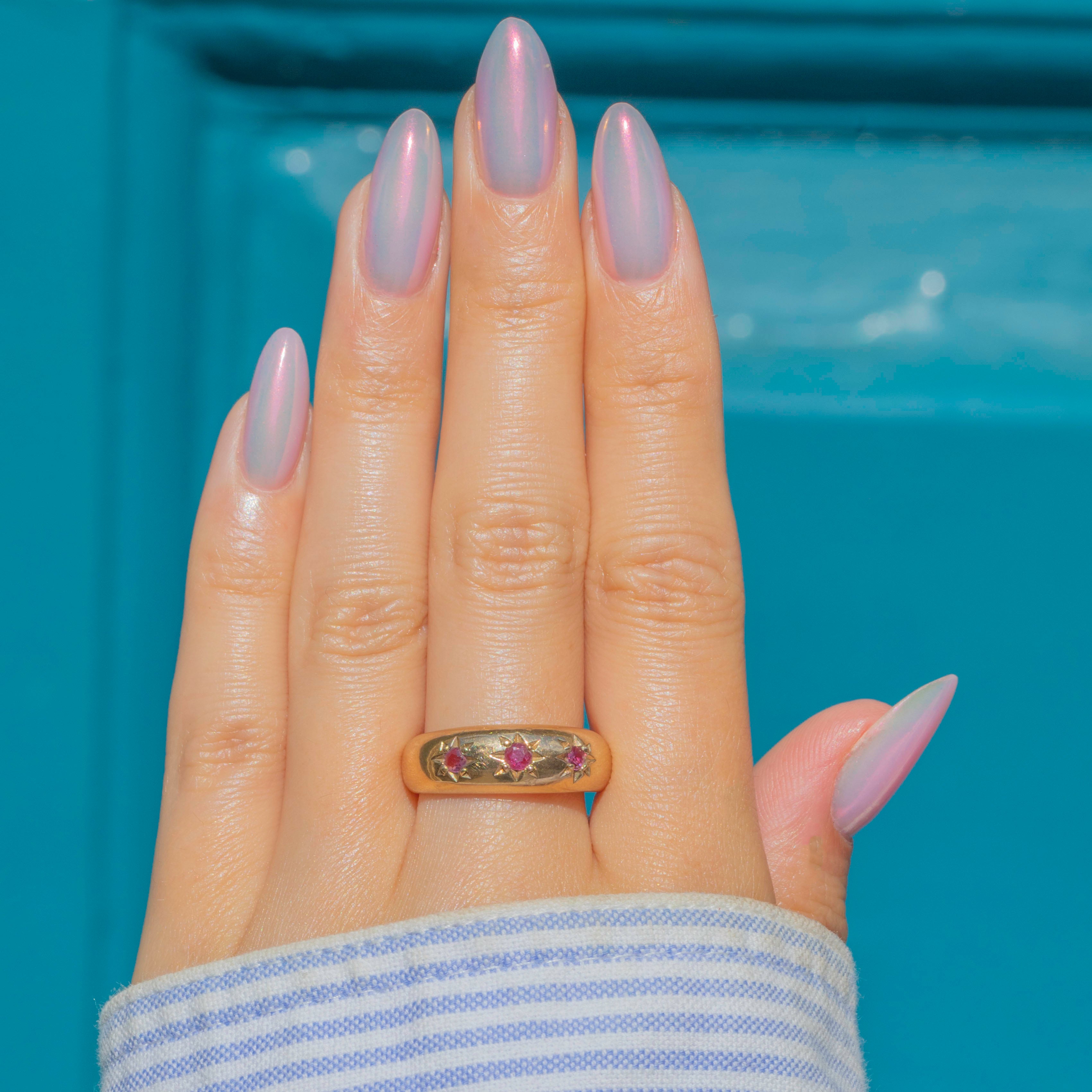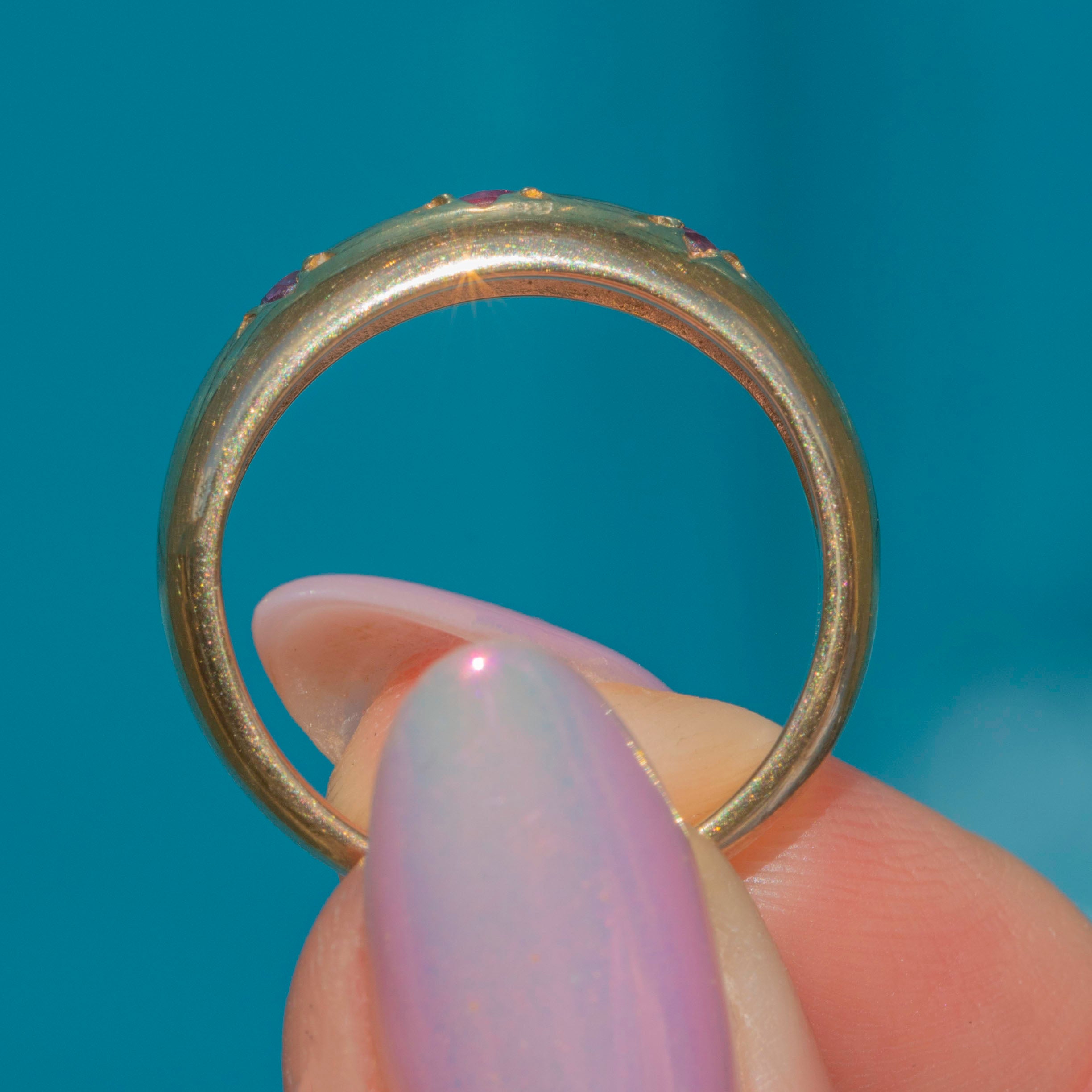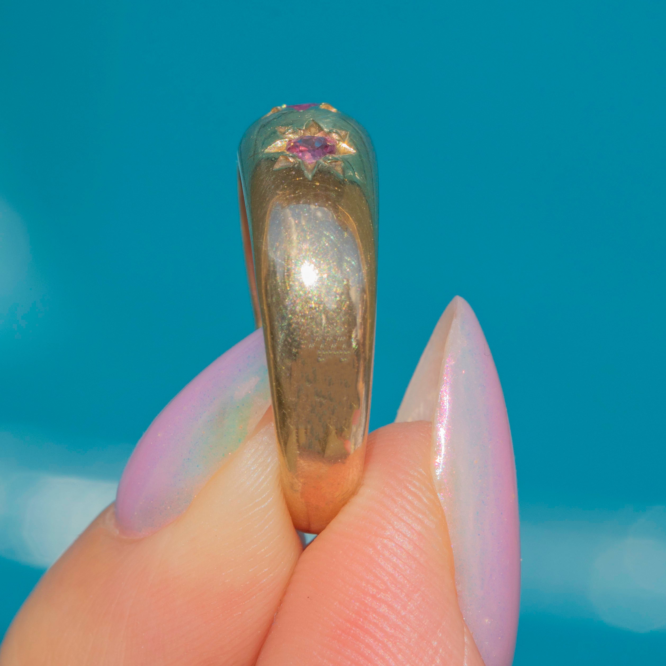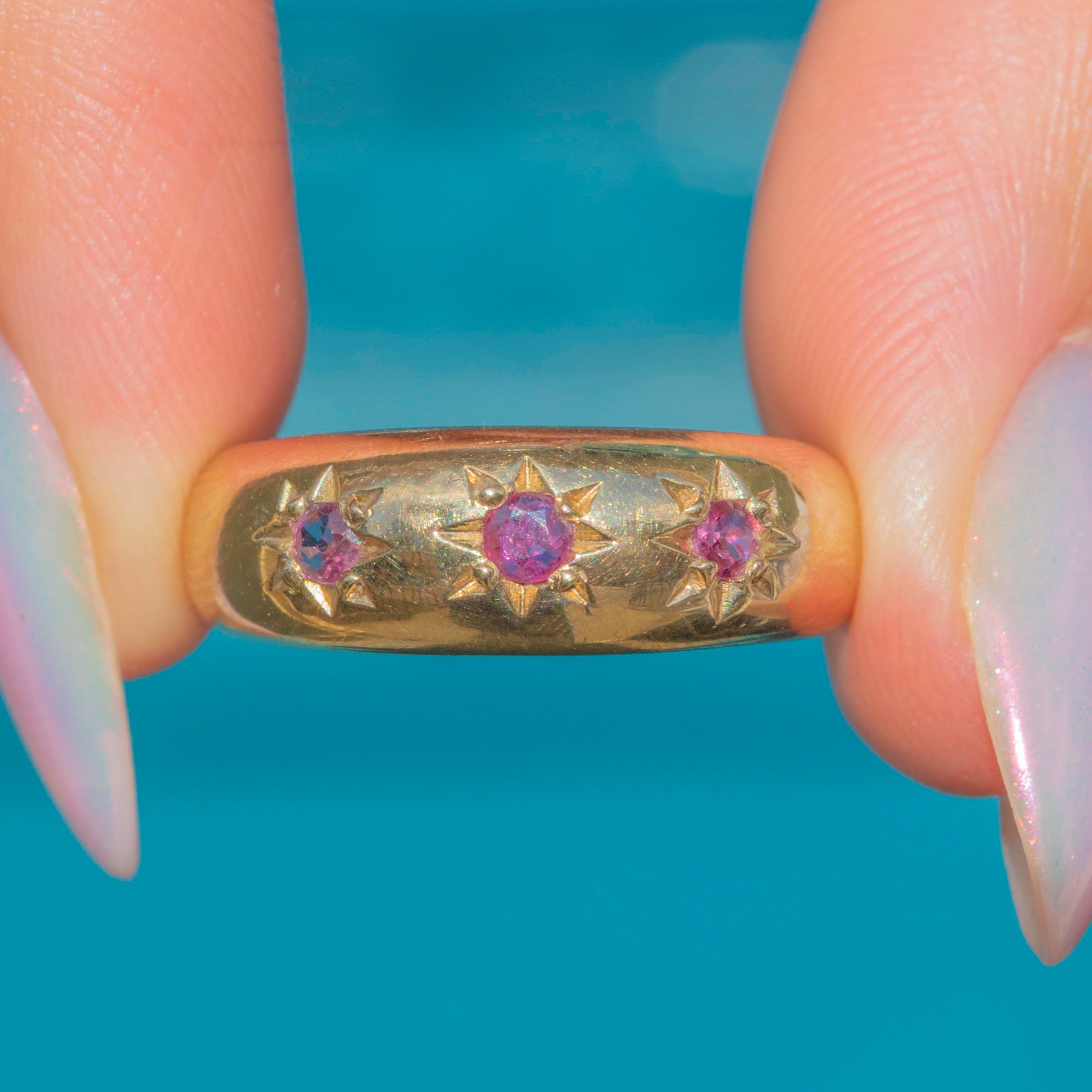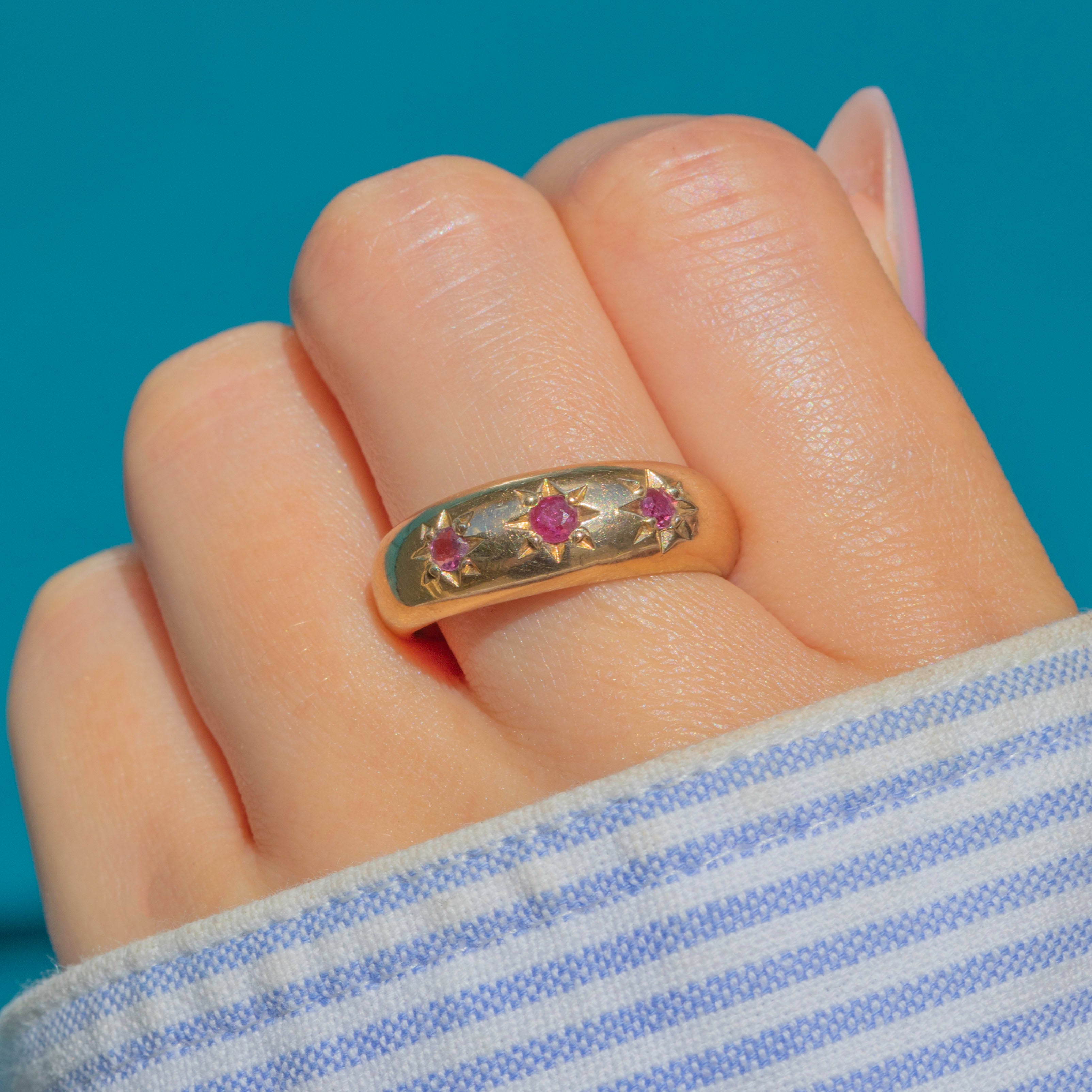 Three dainty Rubies are displayed across the ring's domed surface, each one set in bold, engraved star settings, with their light pink hues combining with the buttery Gold to create a feminine colour palette.