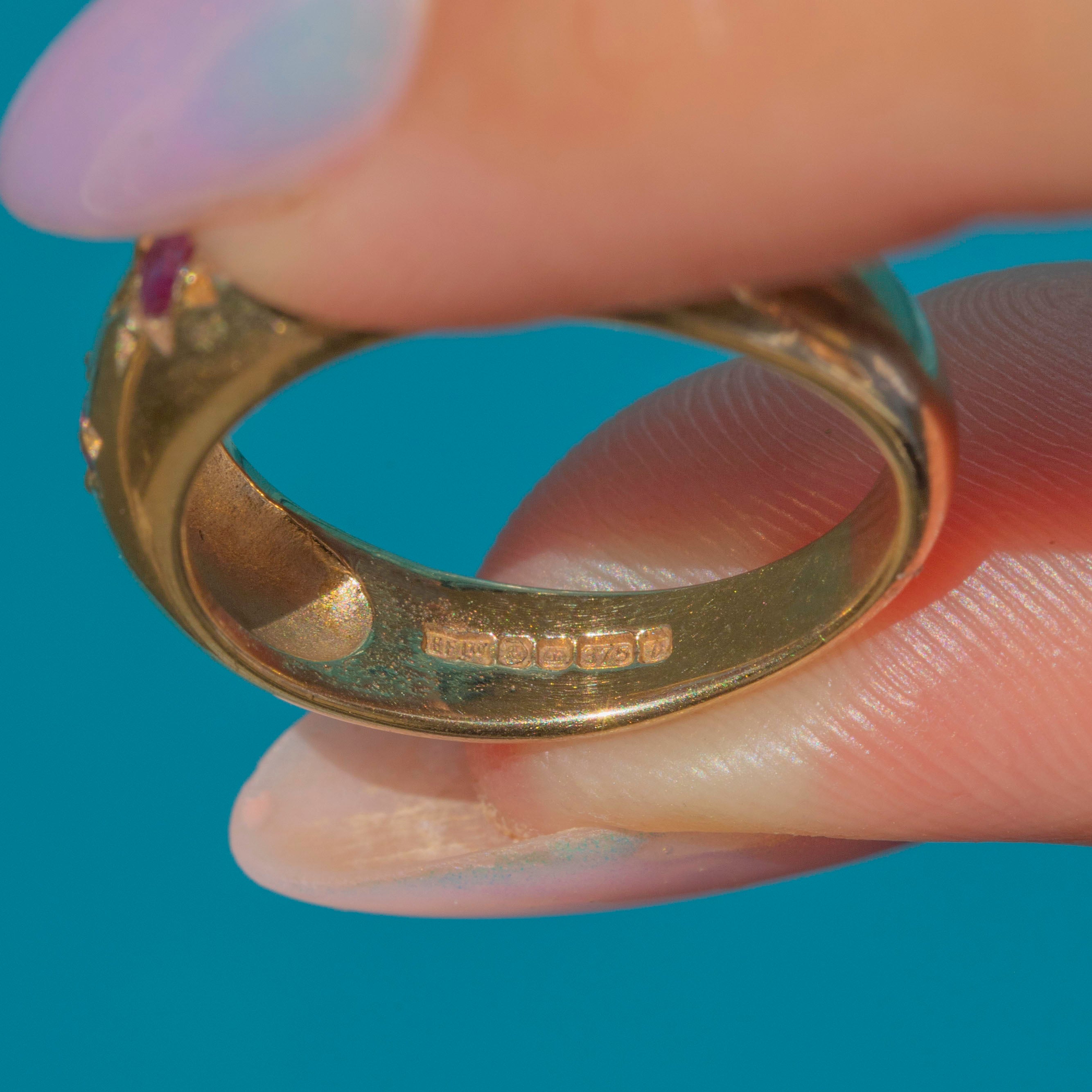 VERY GOOD-EXCELLENT: This 9ct Gold Ruby three stone star-set gypsy ring is in lovely condition. The Gold is glossy, with a gorgeous buttery hue, and a smooth band that feels comfortable to wear. One of the small Rubies has some surface wear, with a small chip and some nibbles visible under the inspection of a jeweller's loupe. The Rubies are all set securely, providing a subtle sparkling accent. There are no signs of the ring being previously resized, and the vintage hallmarks are clear, so we can accurately date this Gold gypsy ring to 1995!