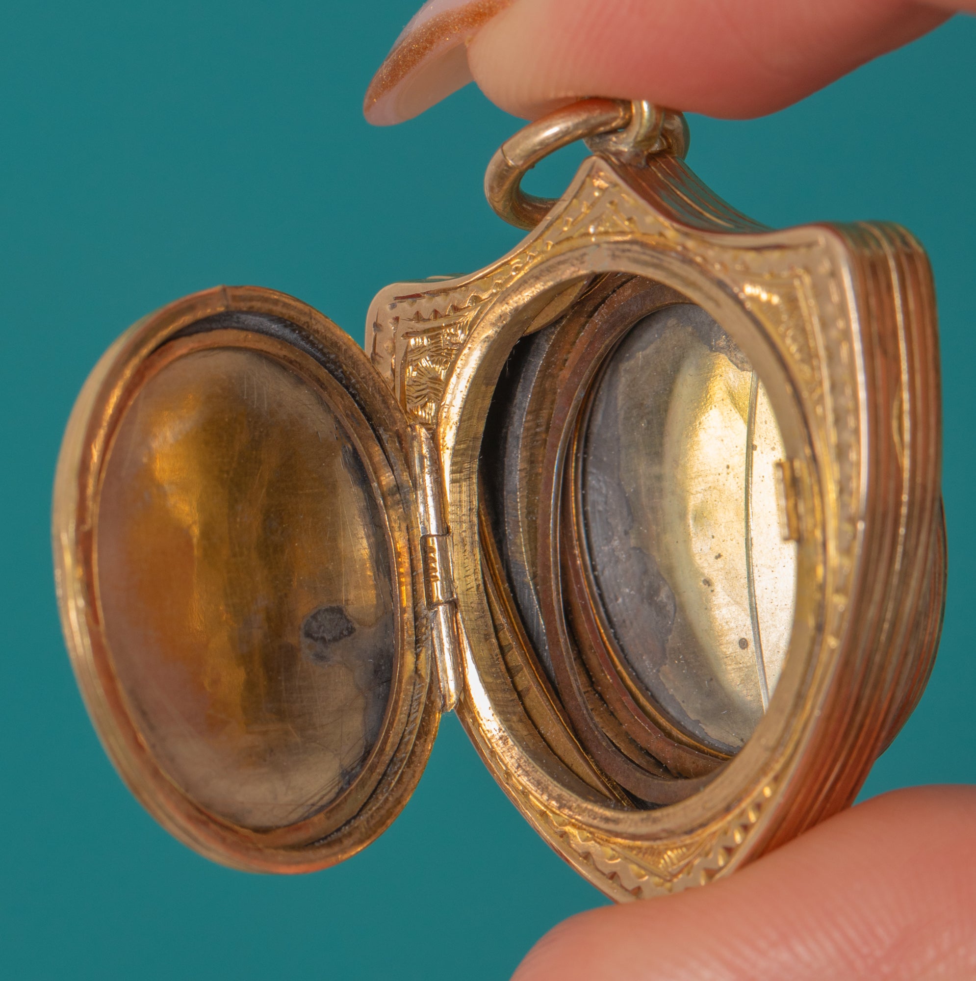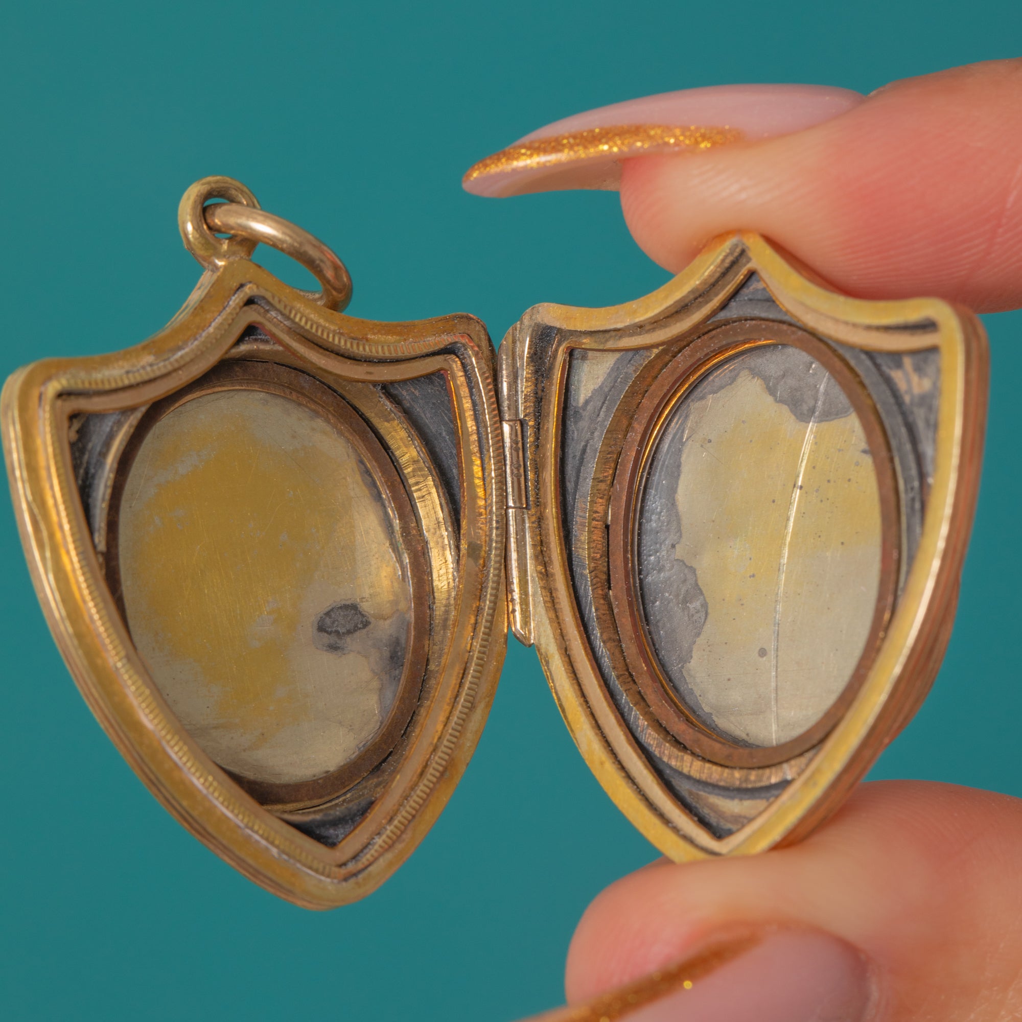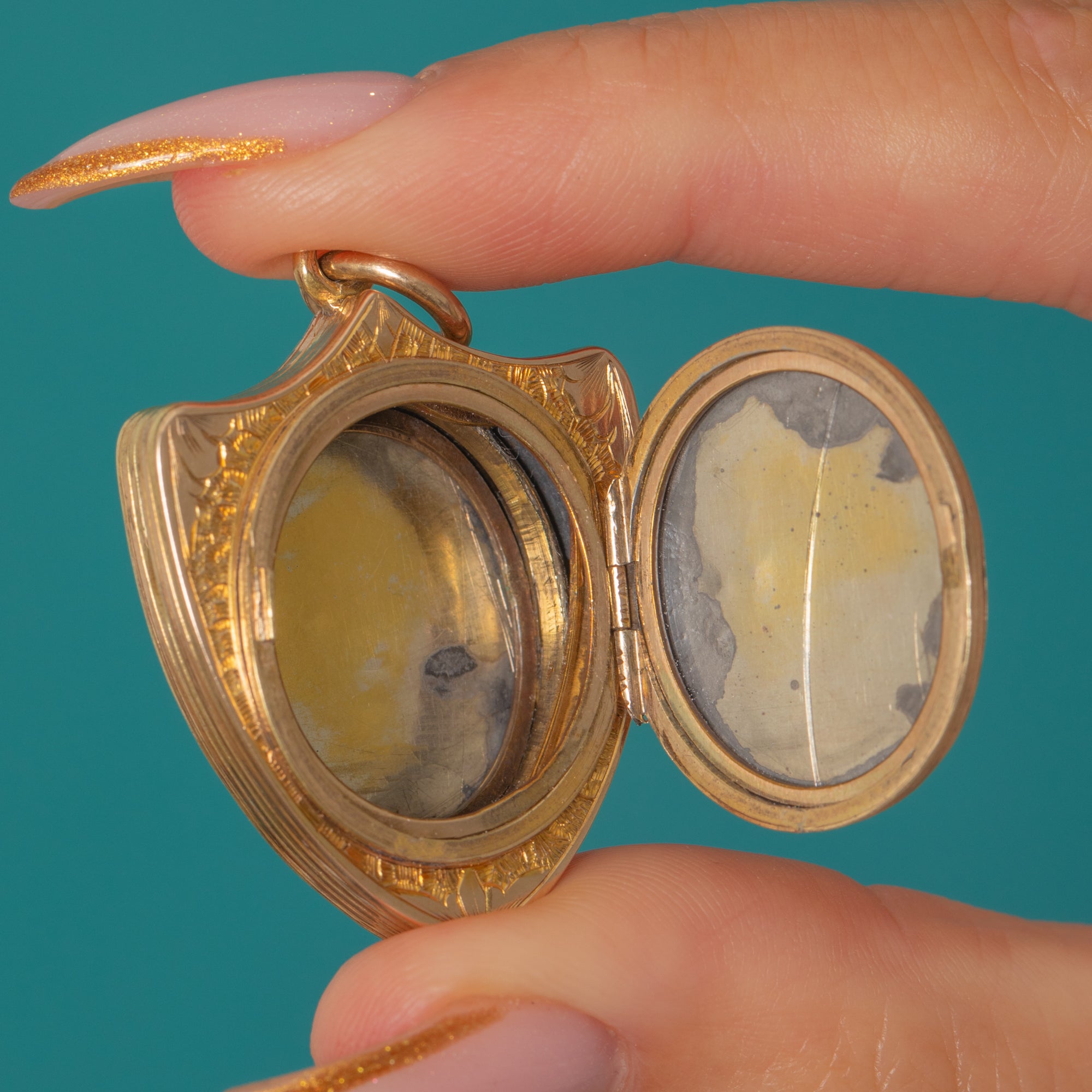 Crafted in solid 9ct Gold front and back, this substantial locket opens to reveal six internal compartments, complete with their original retainers. A wonderful example of Victorian sentimentality and artistry.
