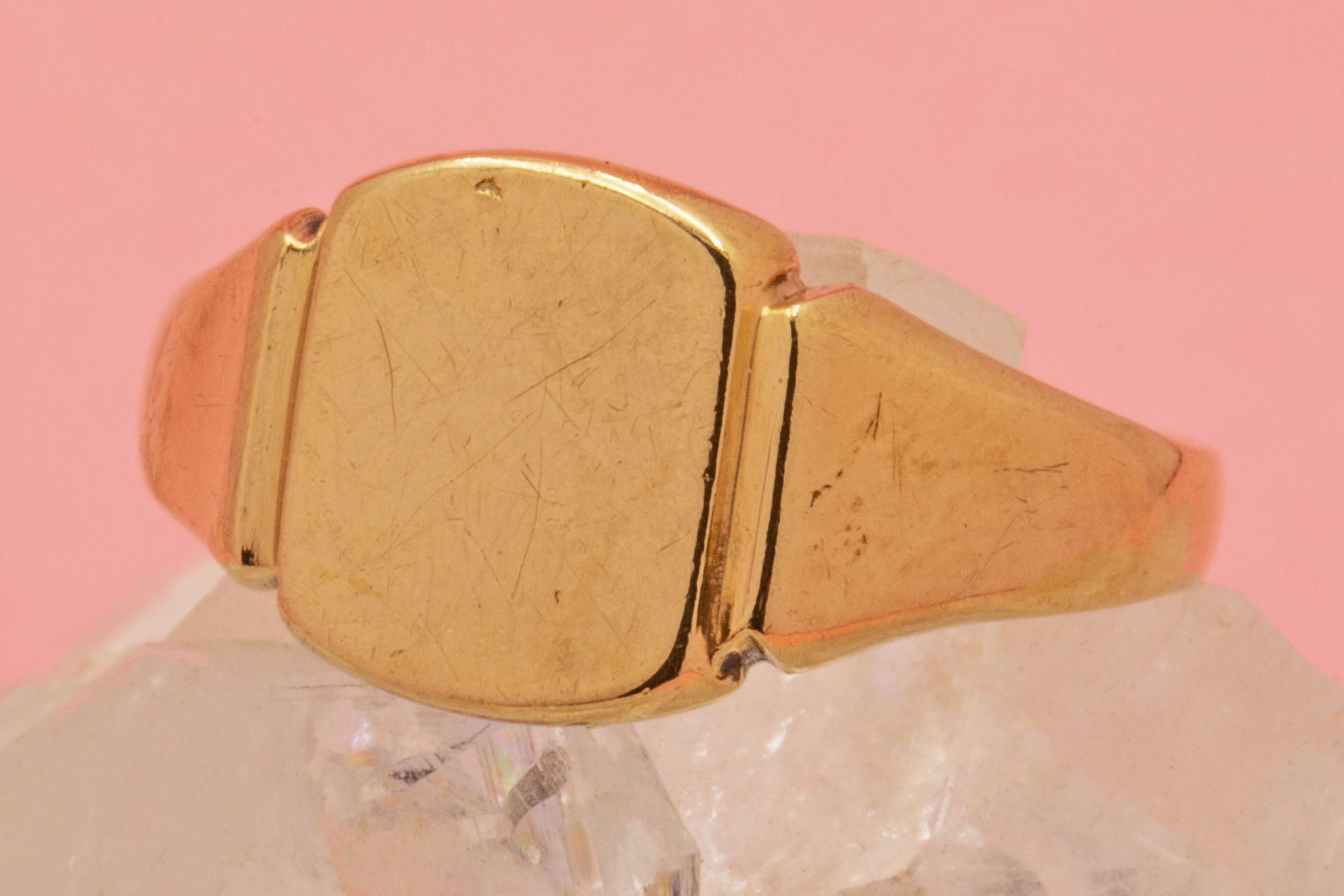 EXCELLENT. This heavy 9ct Gold signet ring is in excellent condition. The Gold remains in exquisite condition, with no dings or damage to note aside from a few scratch marks to the inside of the band. The design and structure has kept incredibly well too. Overall, a stunning vintage signet ring ready to be adored for years to come!