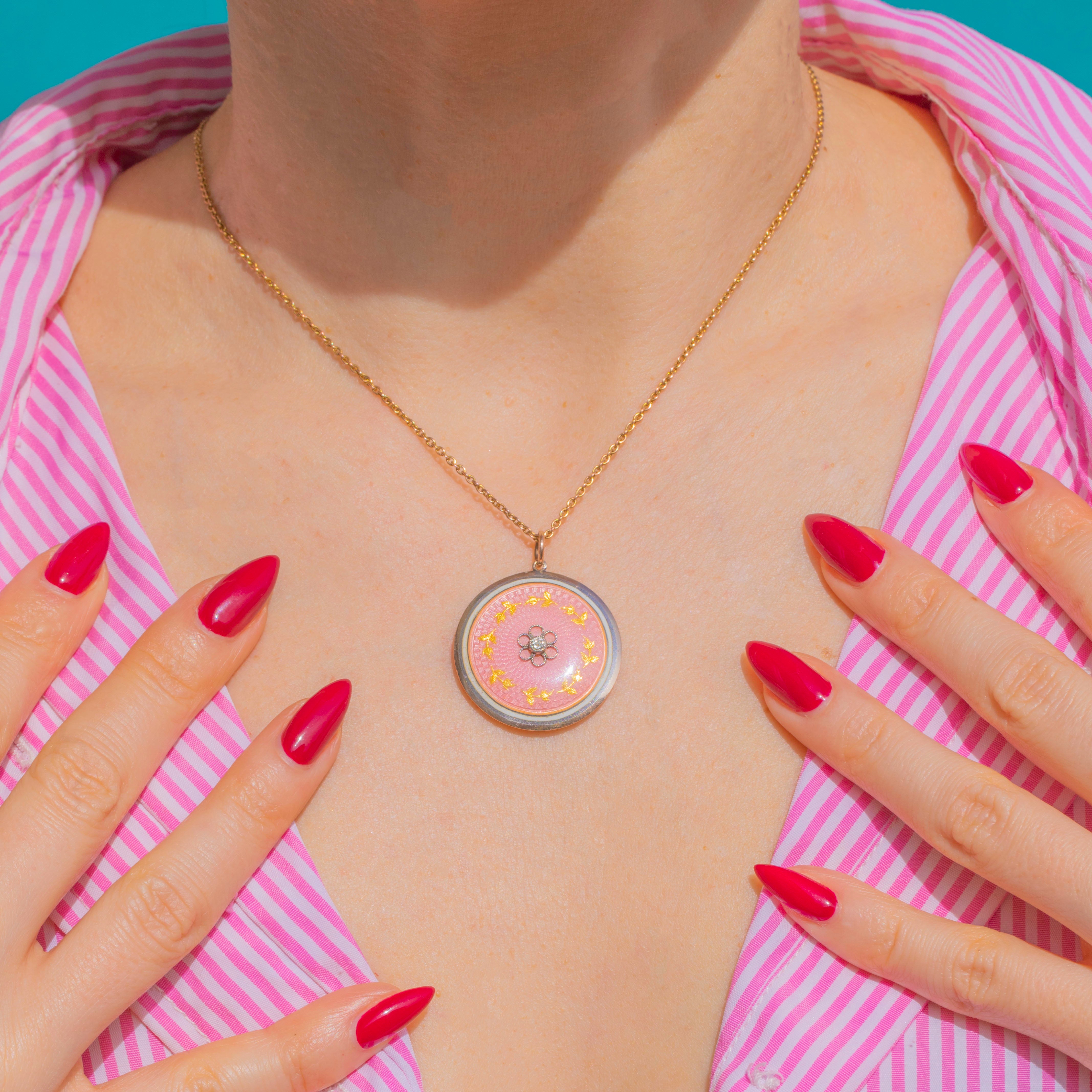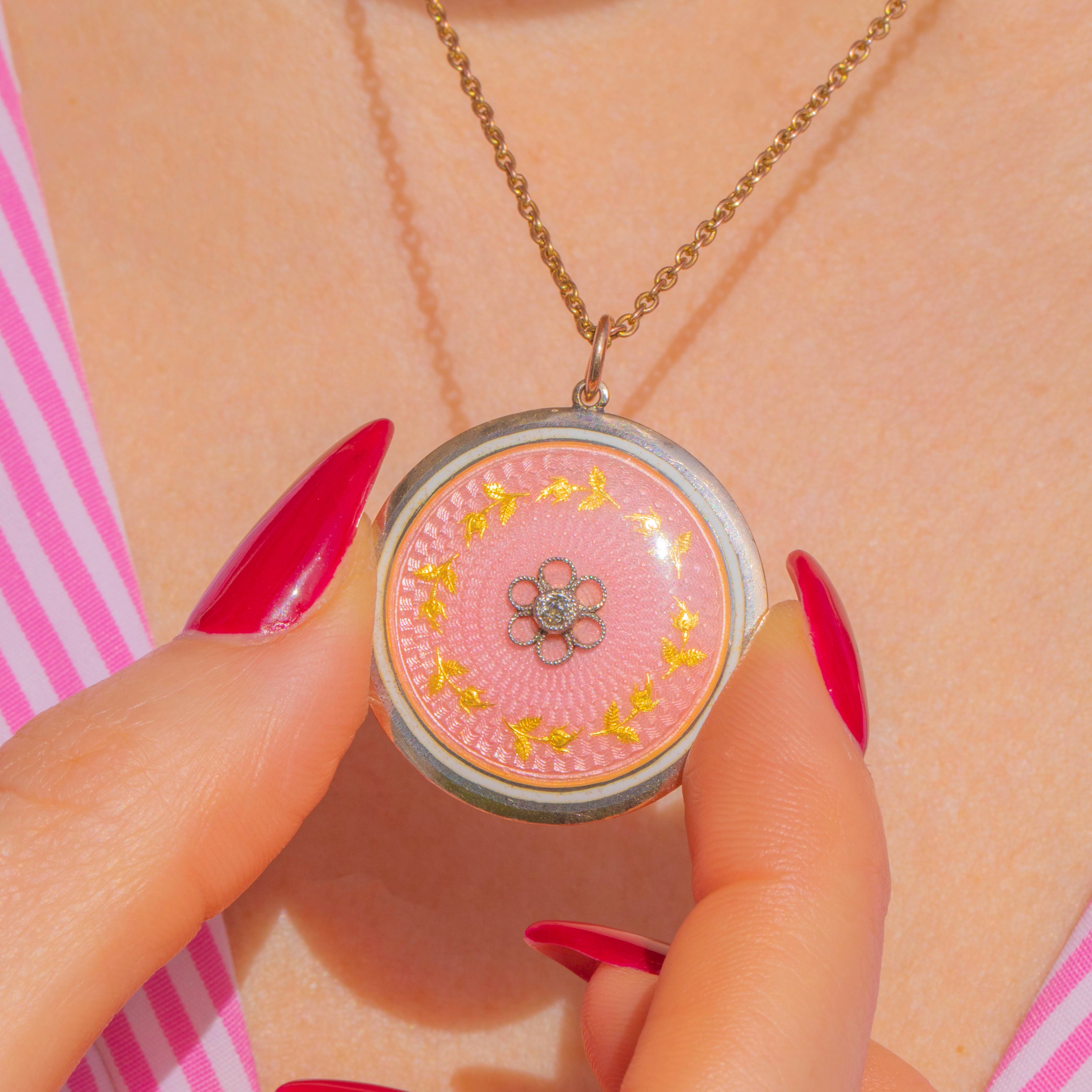 Radiant with Edwardian elegance, this round locket pairs warm 9ct Gold with cool Silver for a refined two‑tone finish. A softly domed panel of blush pink guilloché Enamel shimmers with engine‑turned detail, centred by a petite Diamond set within a floral rosette and encircled by a delicate laurel wreath.