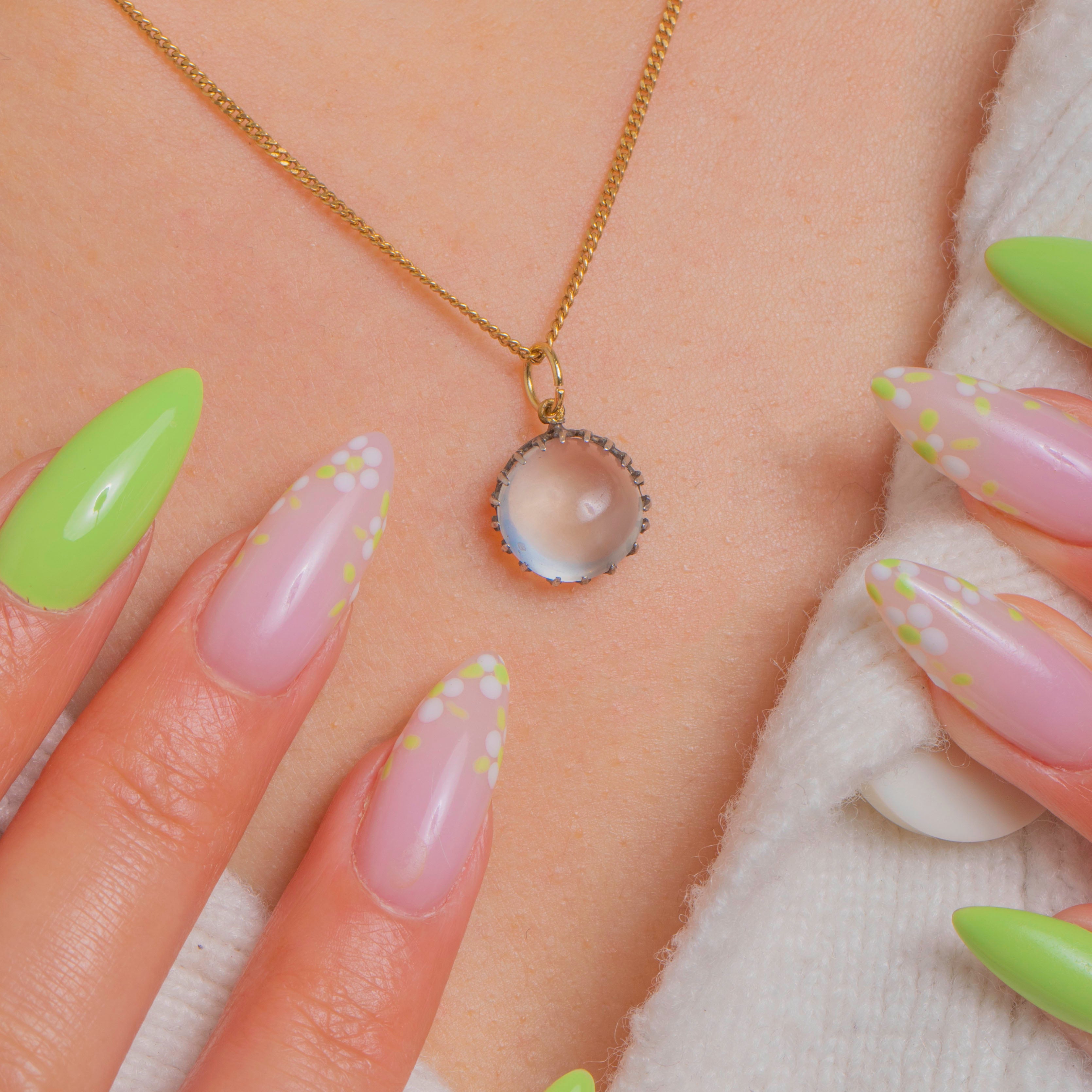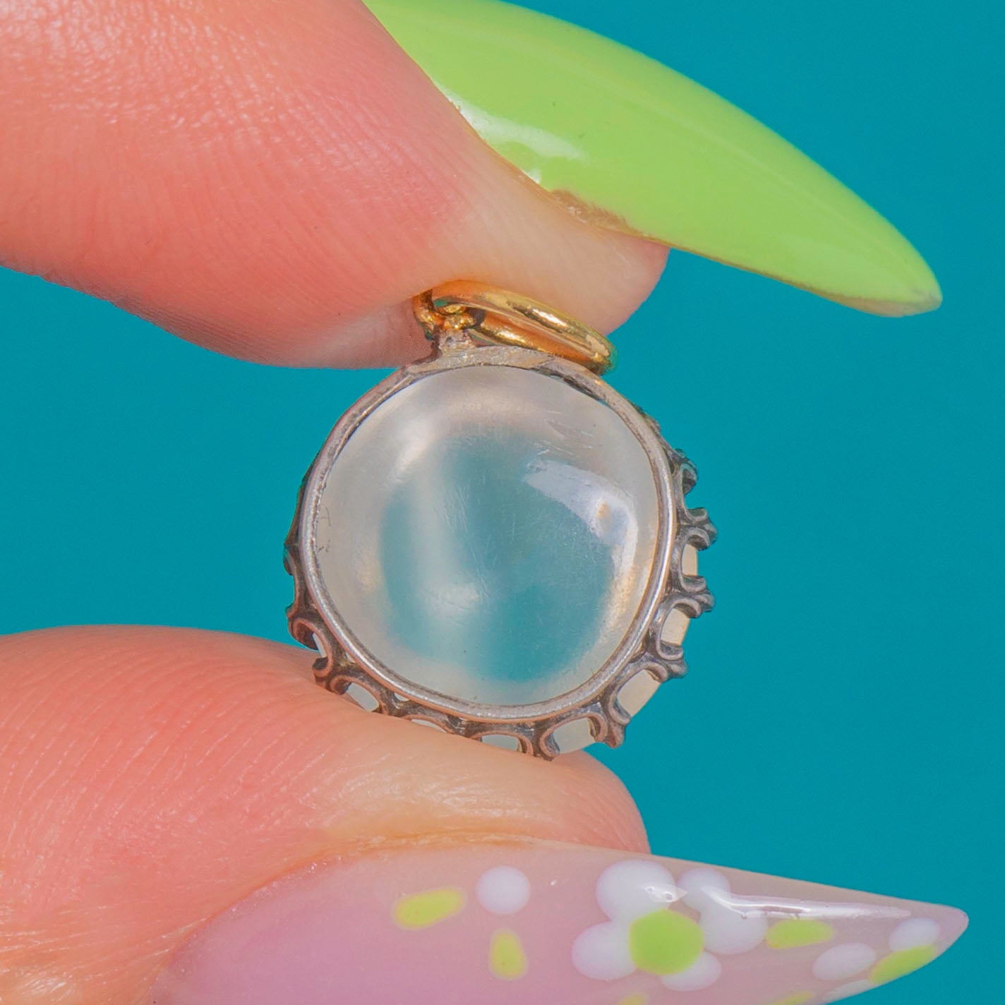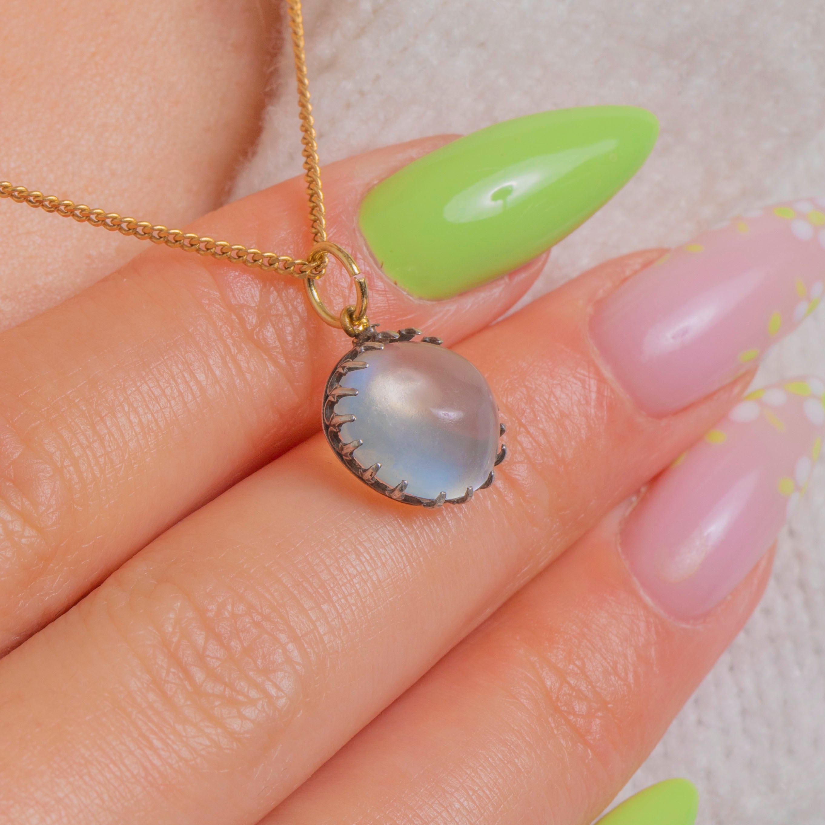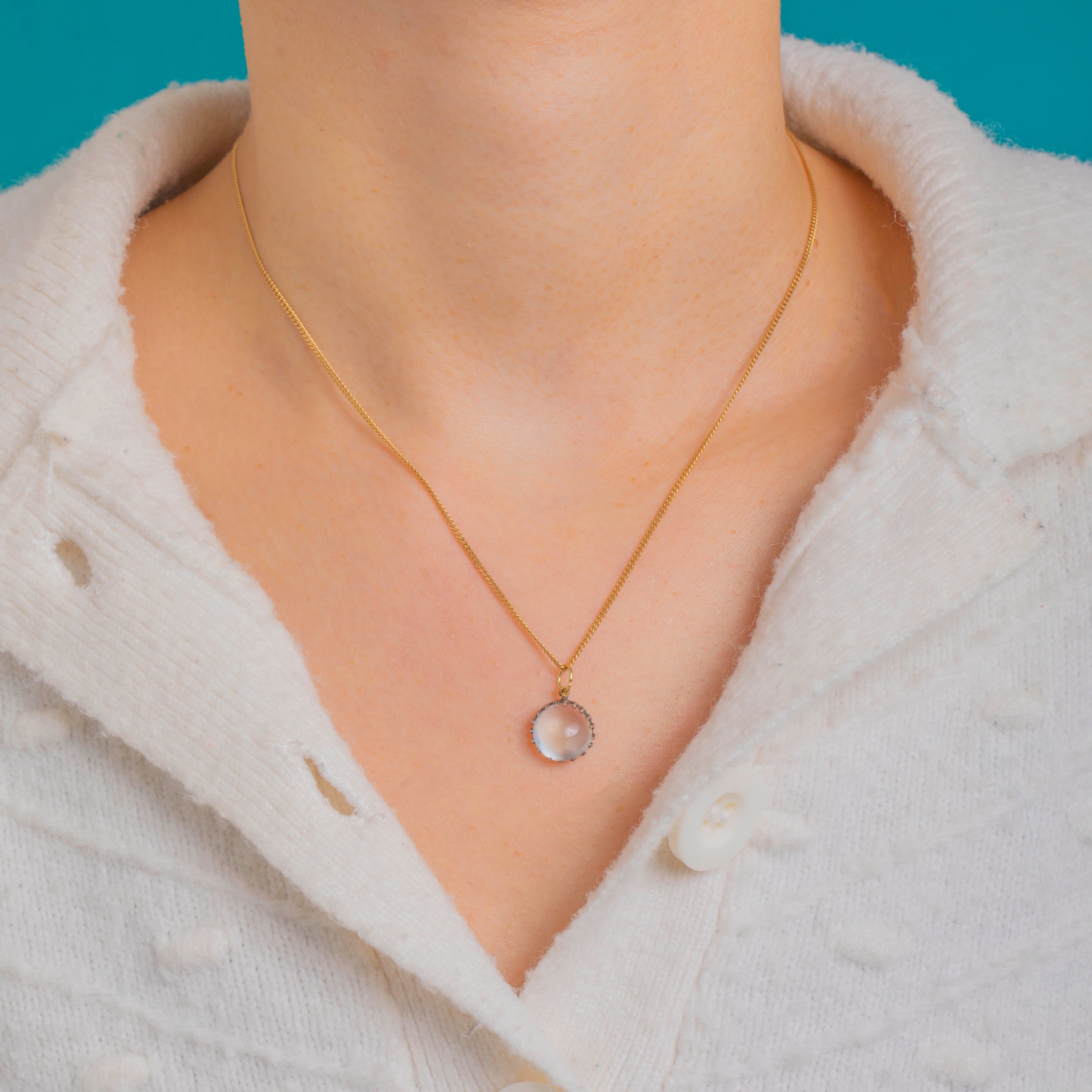 A dreamy Edwardian Moonstone charm with that ethereal, bluish adularescent glow we adore. The high-domed round cabochon is cradled in a crown-style Silver setting with a pretty open scalloped gallery, giving the stone a light, airy presence. A 9ct Gold jump ring adds a refined contrast and makes it effortless to wear on your favourite chain or charm bracelet.