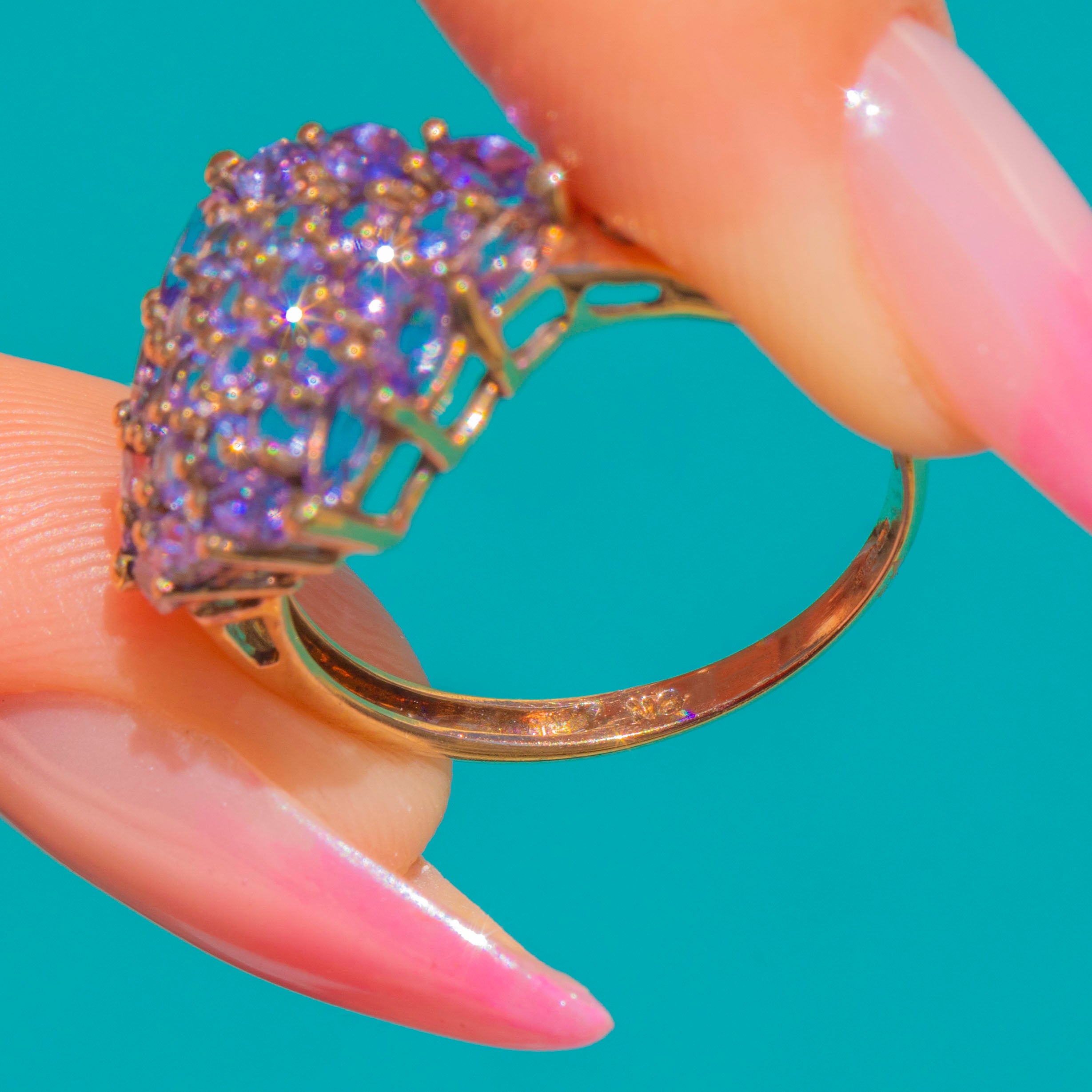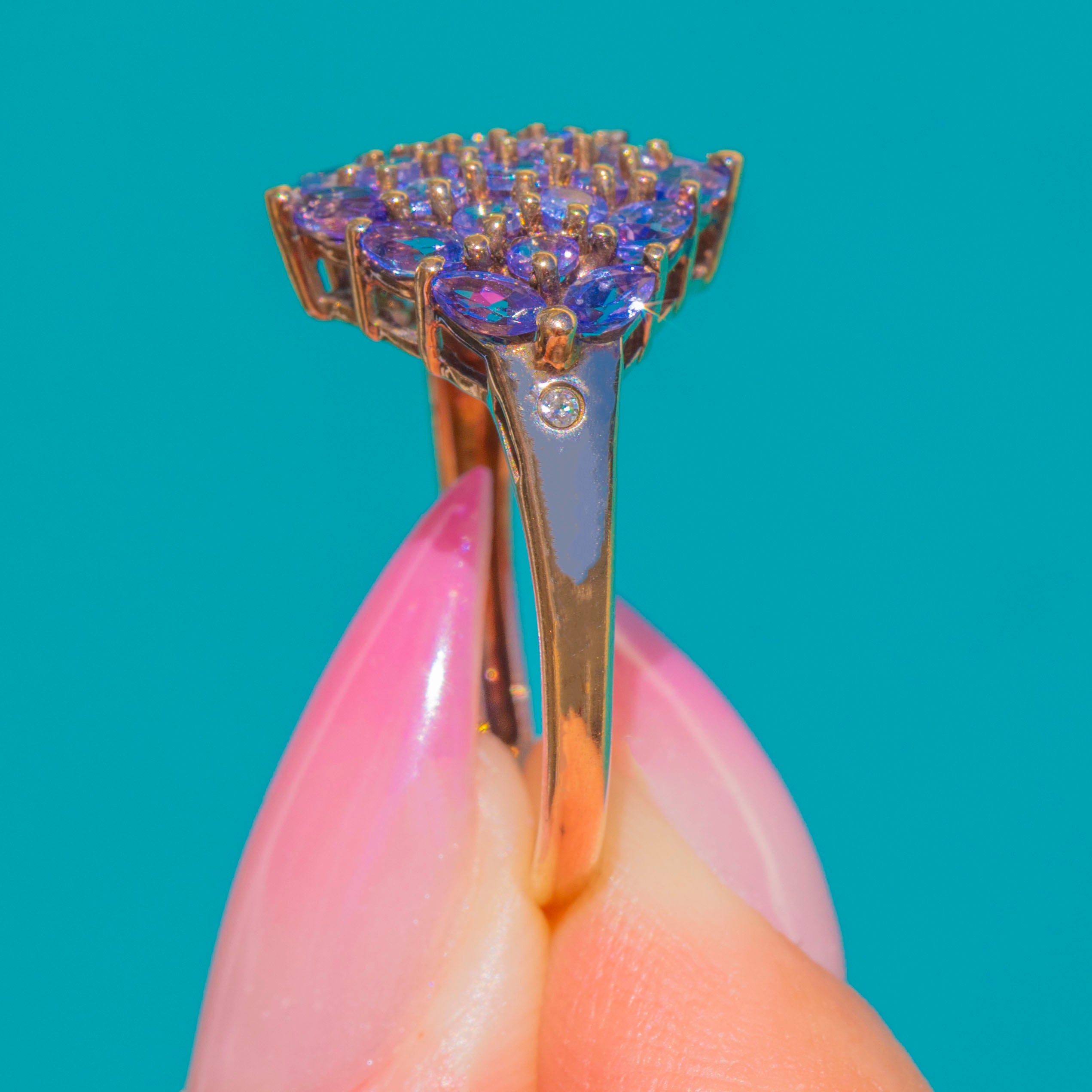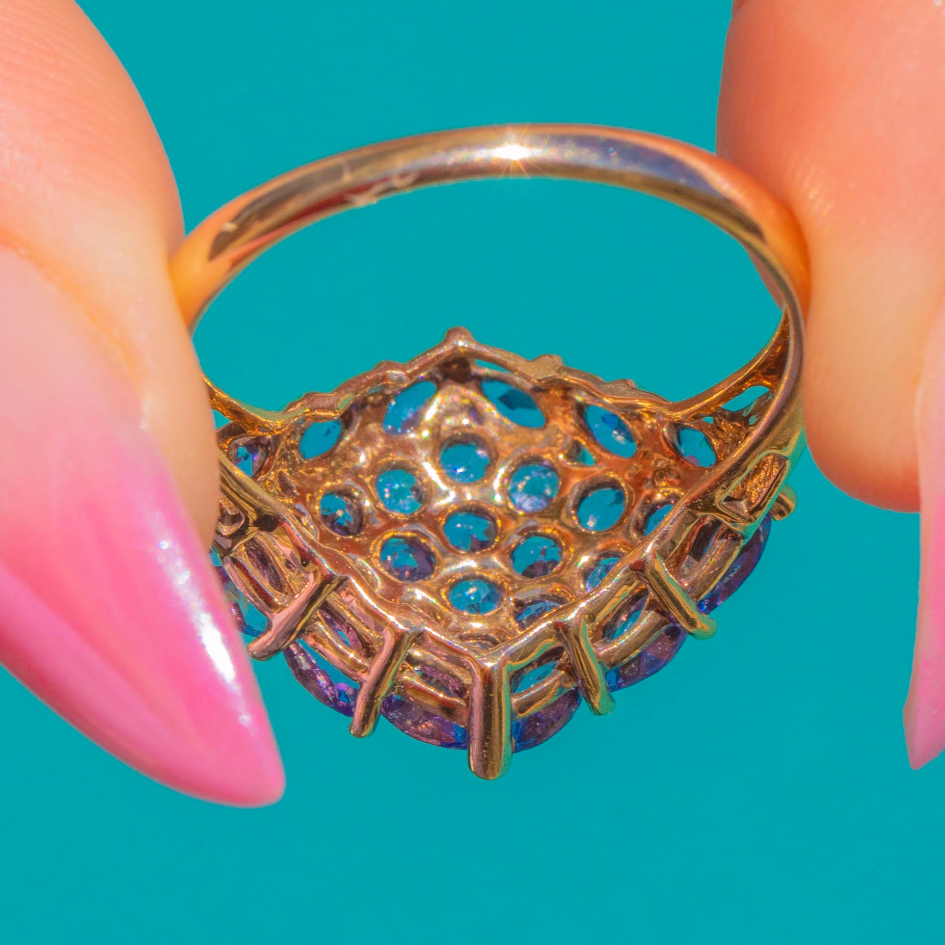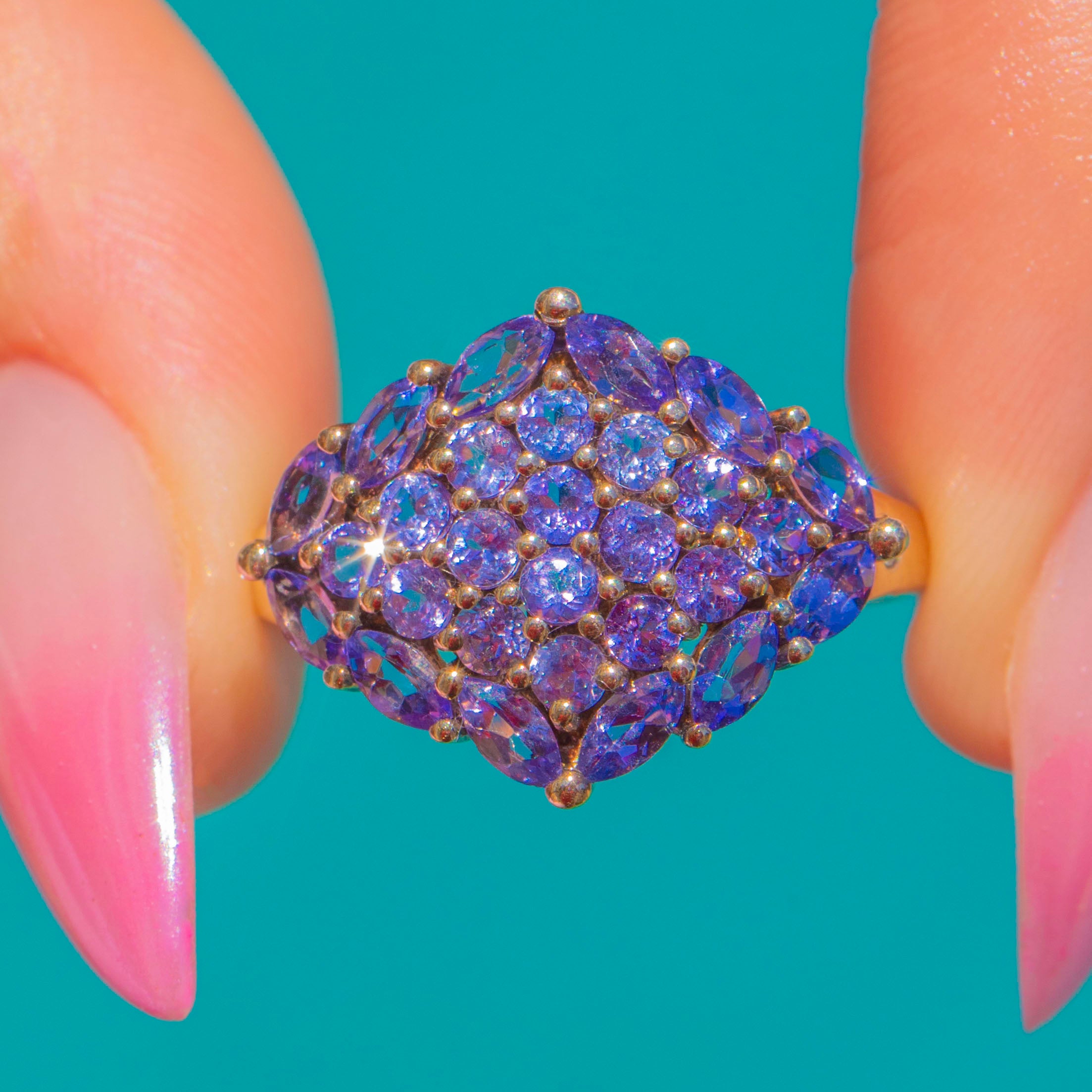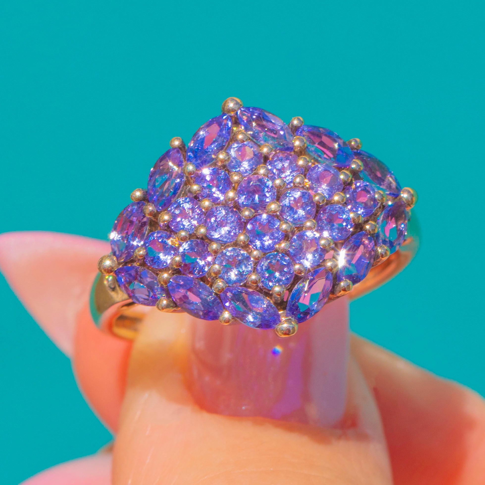 A dazzling dome of Tanzanite takes centre stage in this Vintage 9ct Gold cocktail ring. The floral rosette profile blooms with a pavé of round Tanzanites at the heart, encircled by a gleaming halo of marquise-cut stones that read like delicate petals. Their violet-blue hues dance from lilac to indigo as the light moves, creating a mesmerising wash of colour and sparkle.