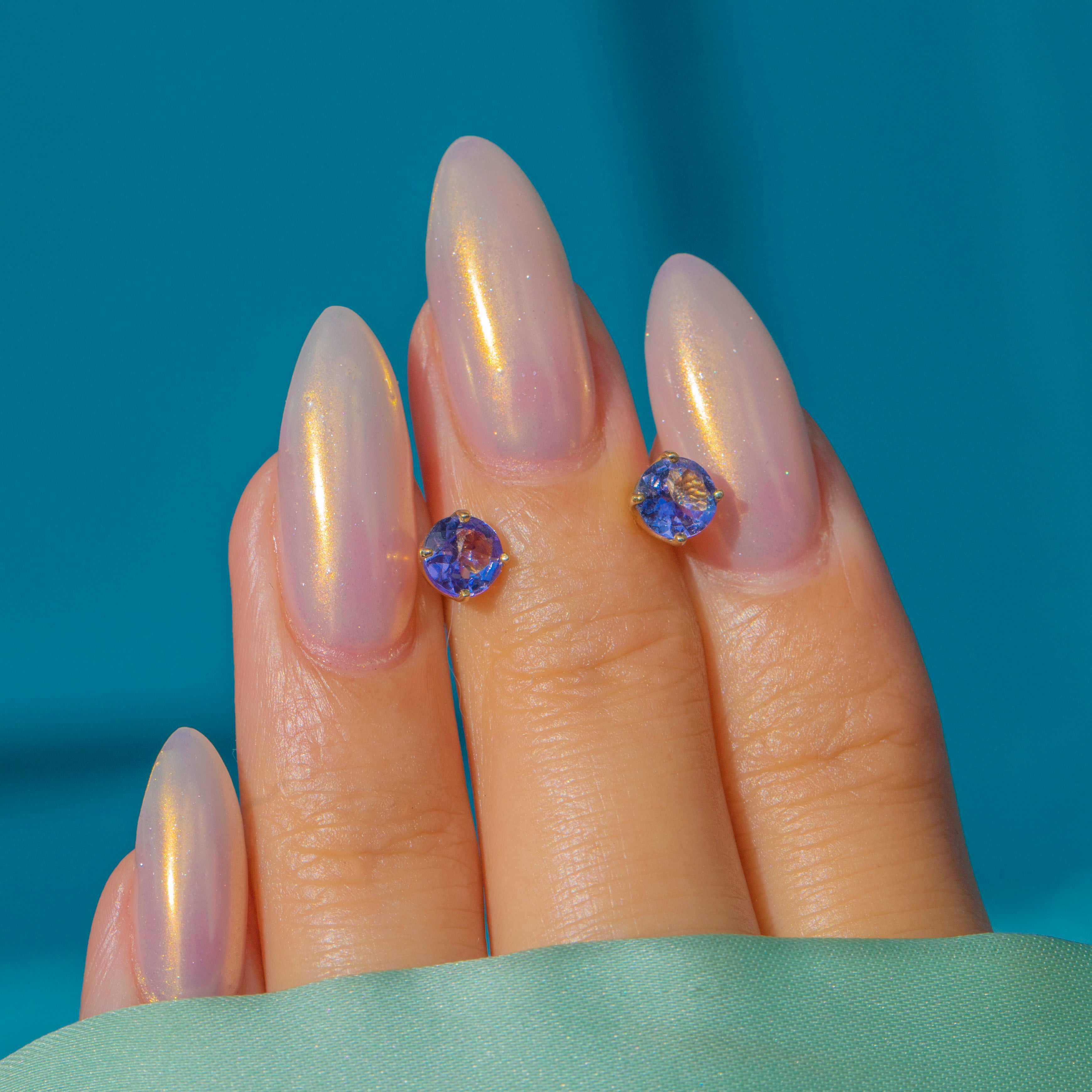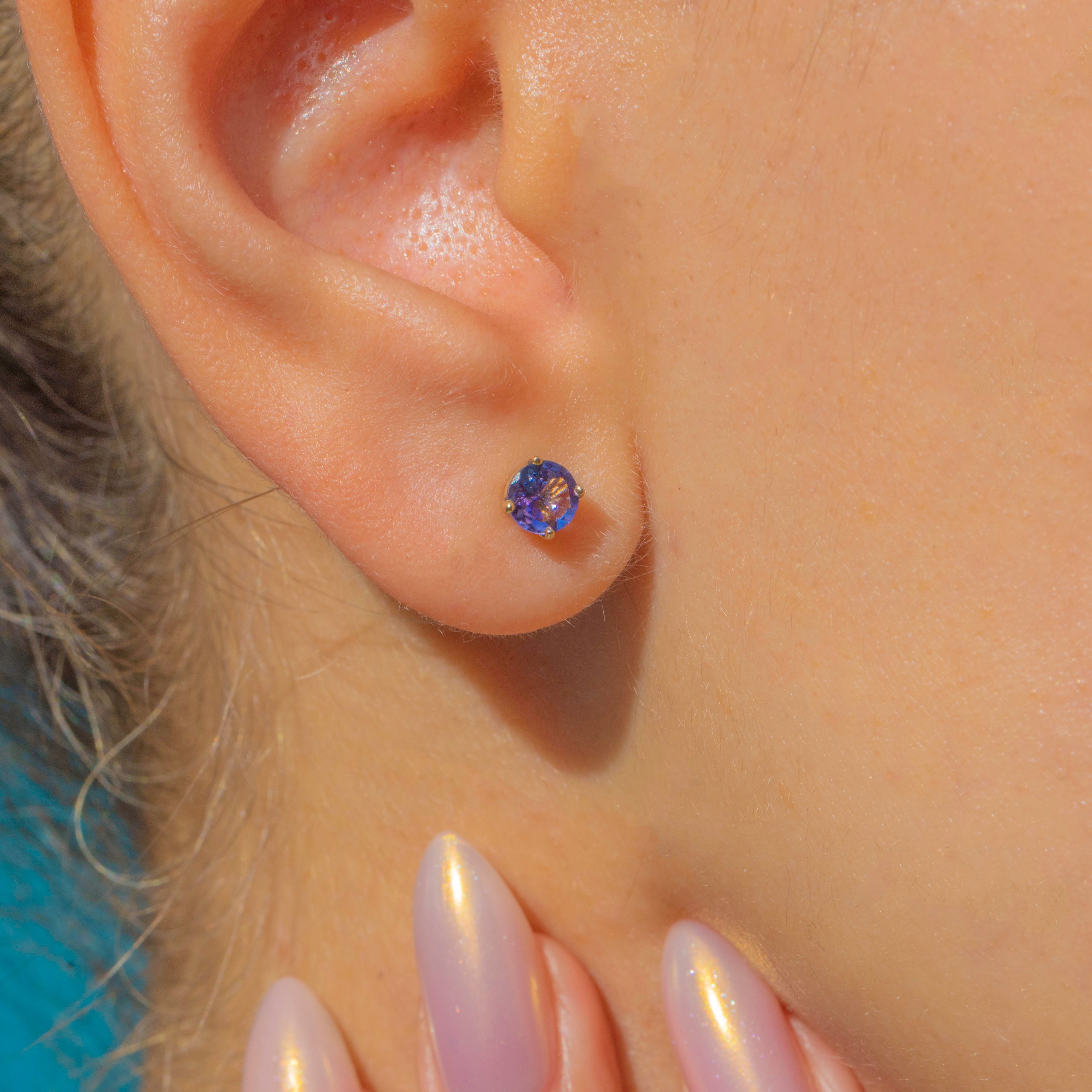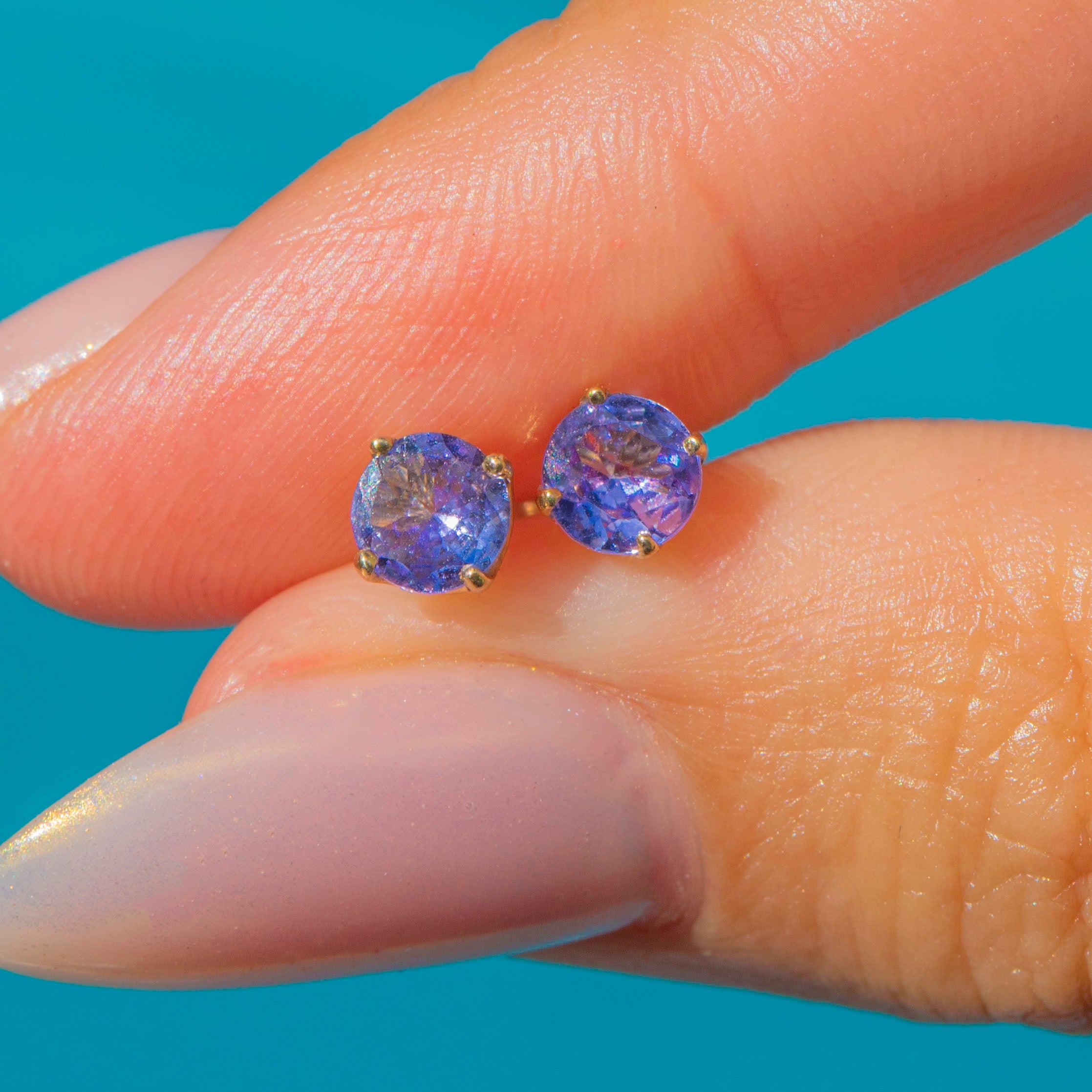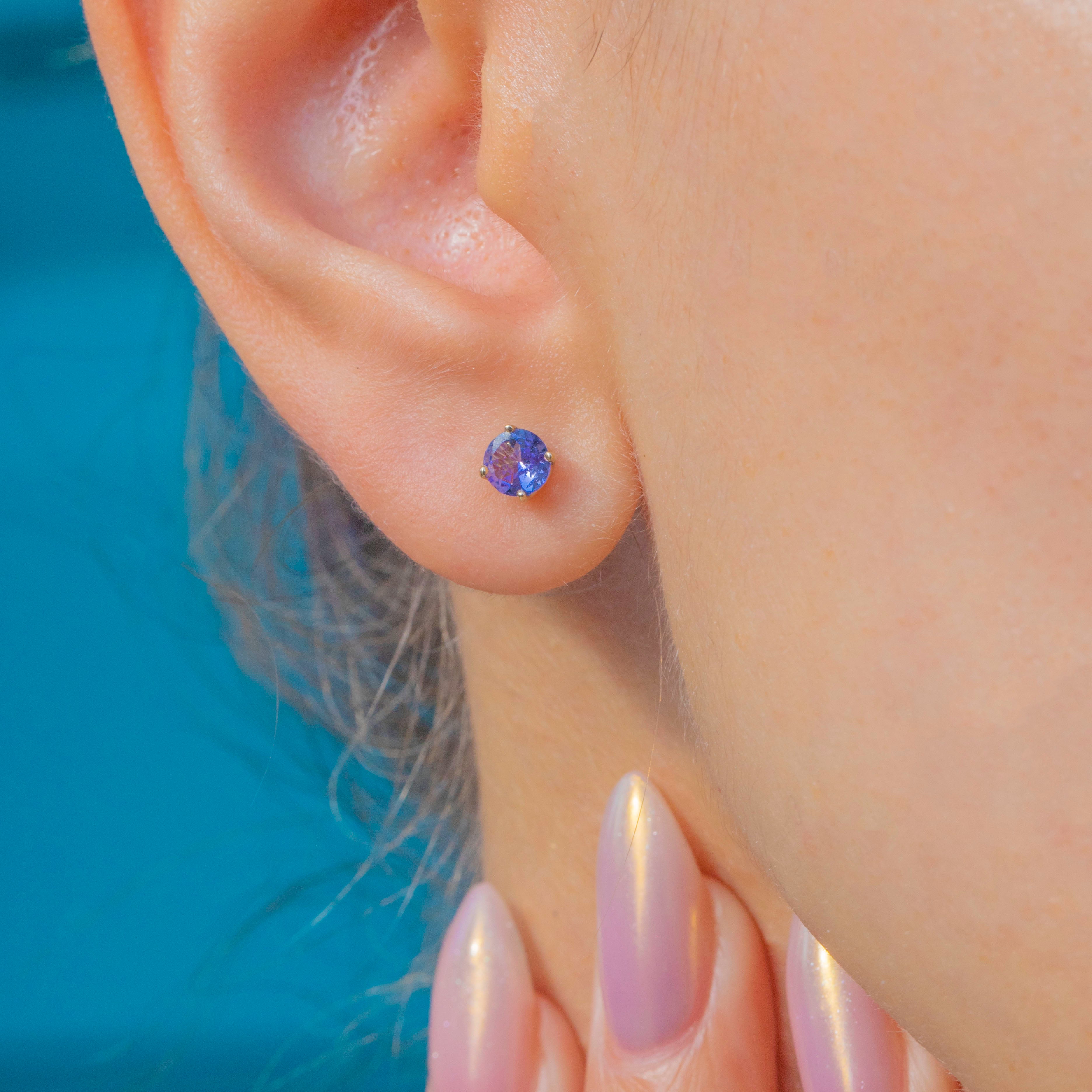 Chic Vintage Tanzanite stud earrings in 9ct Gold, claw set to let the vivid violet-blue stones shine. Each Tanzanite measures 4.5mm, with a combined weight of approximately 0.70ct, displaying the enchanting flashes of purple and blue the gem is prized for.
