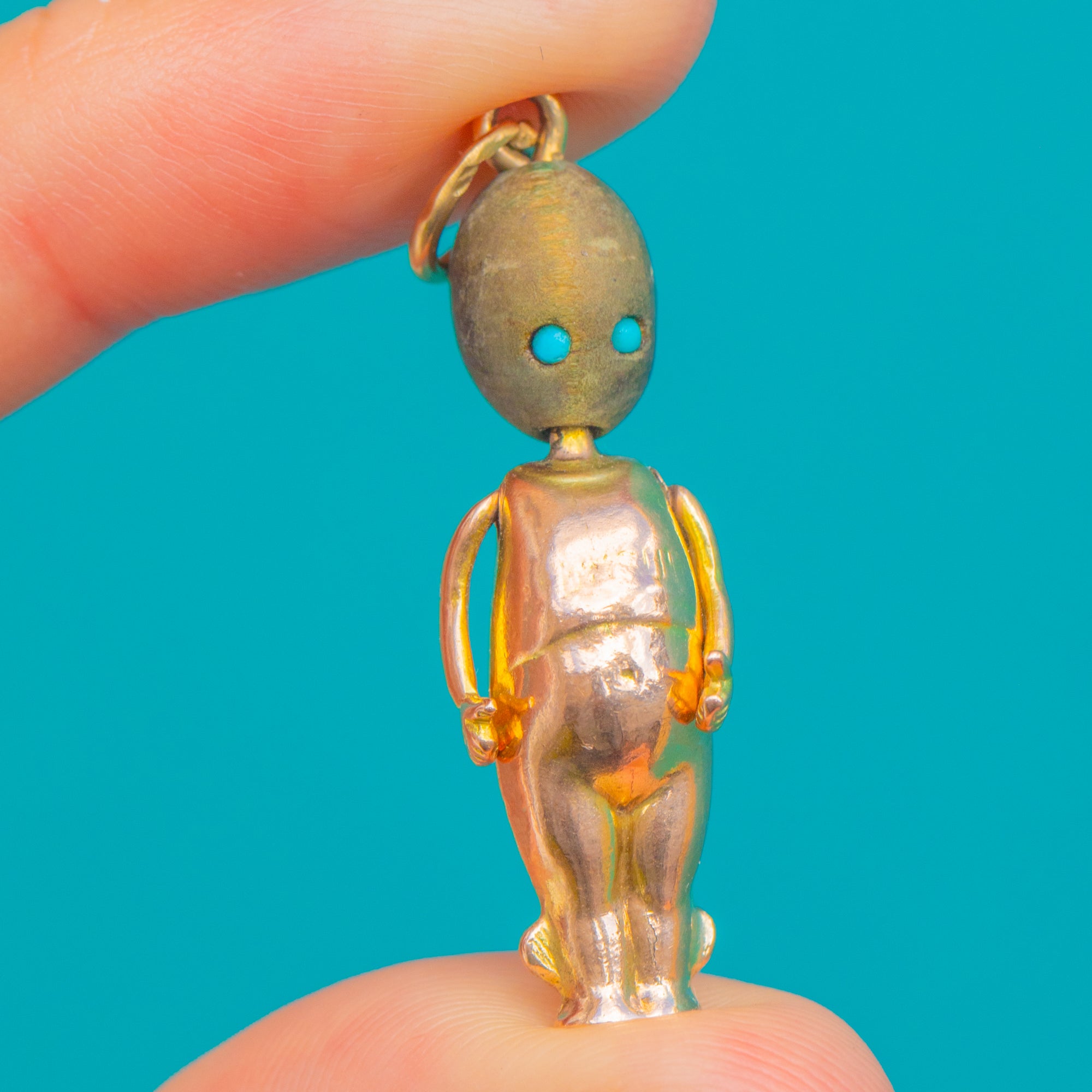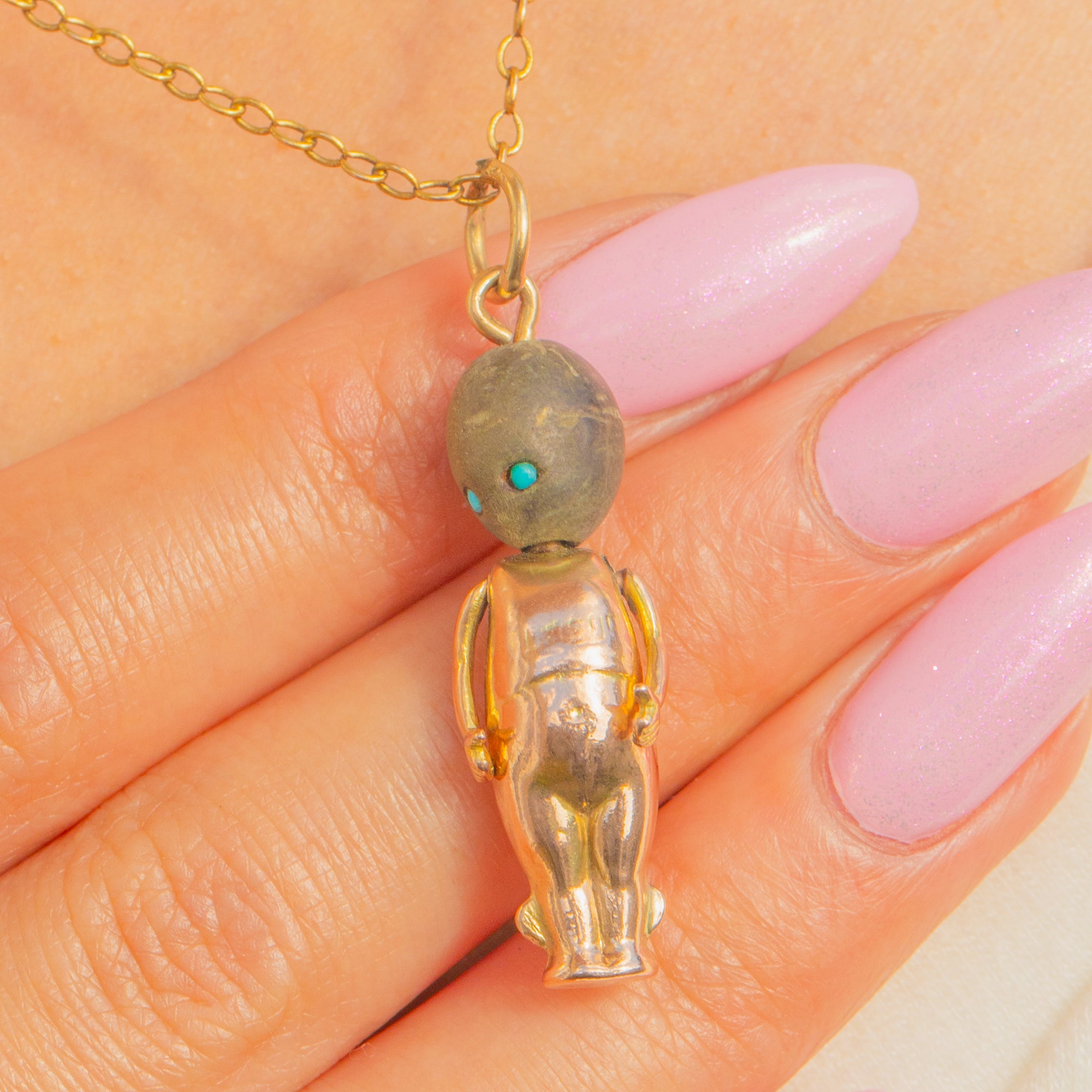 This example pairs a warm, sculptural Gold figure with a contrasting wooden head, its natural patina enhancing the whimsy and folklore appeal. Delicate Turquoise accents bring the face to life, while subtle articulation at the shoulders and a top jump ring make it effortlessly ready to wear on your favourite chain.