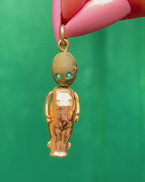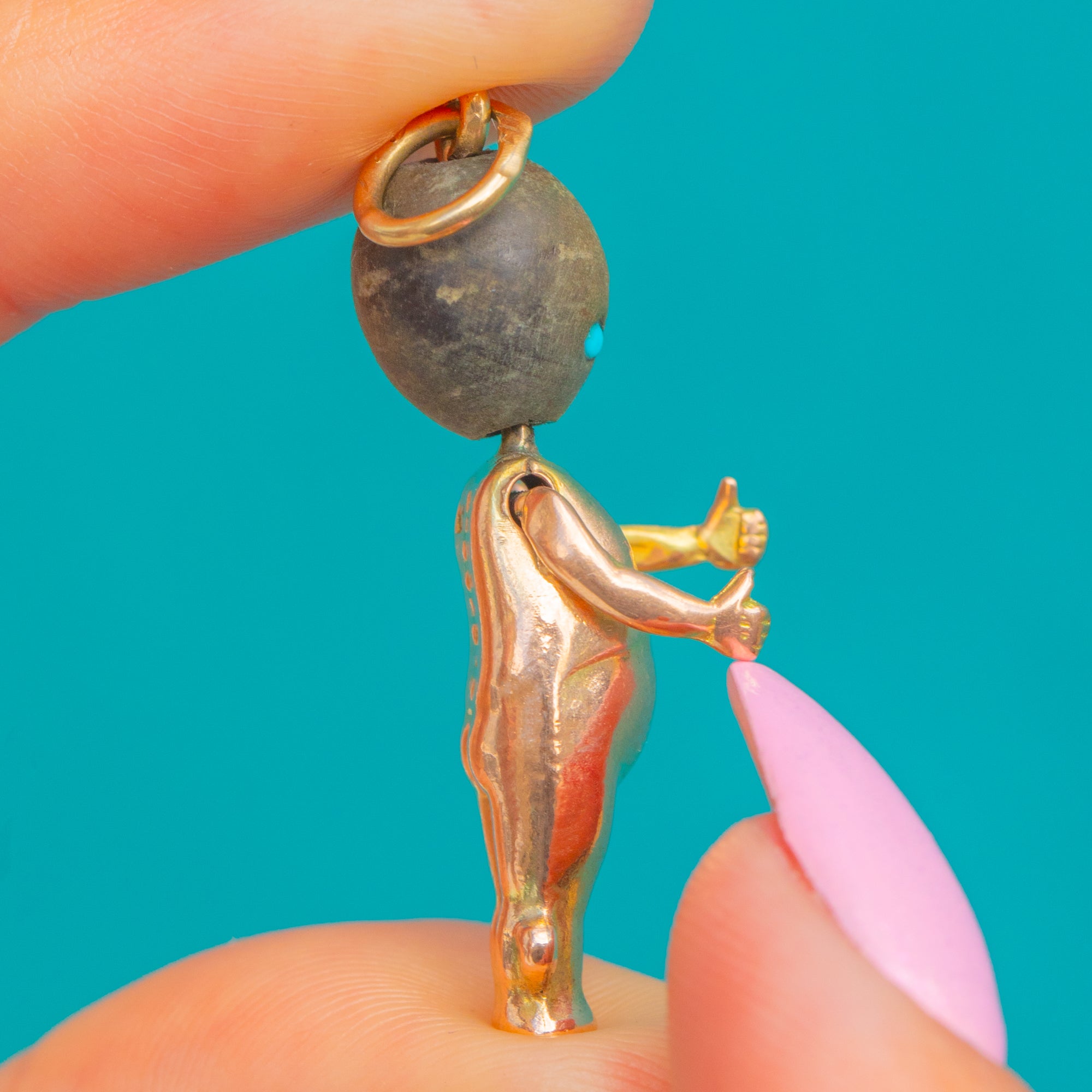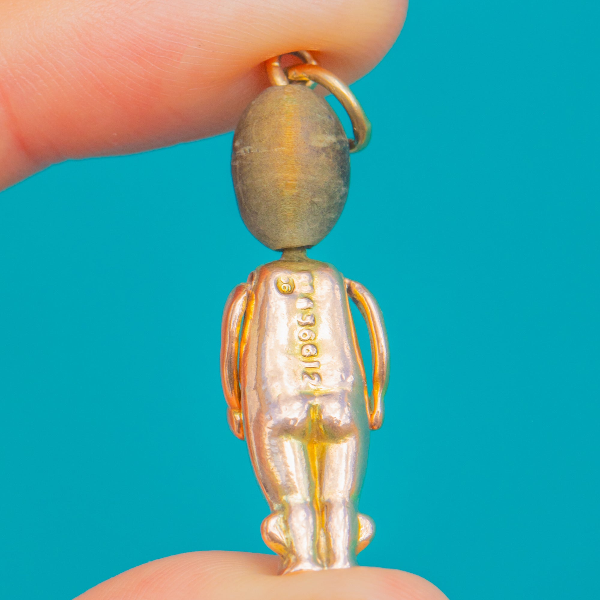 EXCELLENT: Turquoise eyes are bright and intact with no chips or losses visible under magnification. The 9ct Gold figure is crisp with minimal surface wear; connections and jump ring are secure. The wooden head is smooth with only light, age-consistent wear, and no signs of repair.