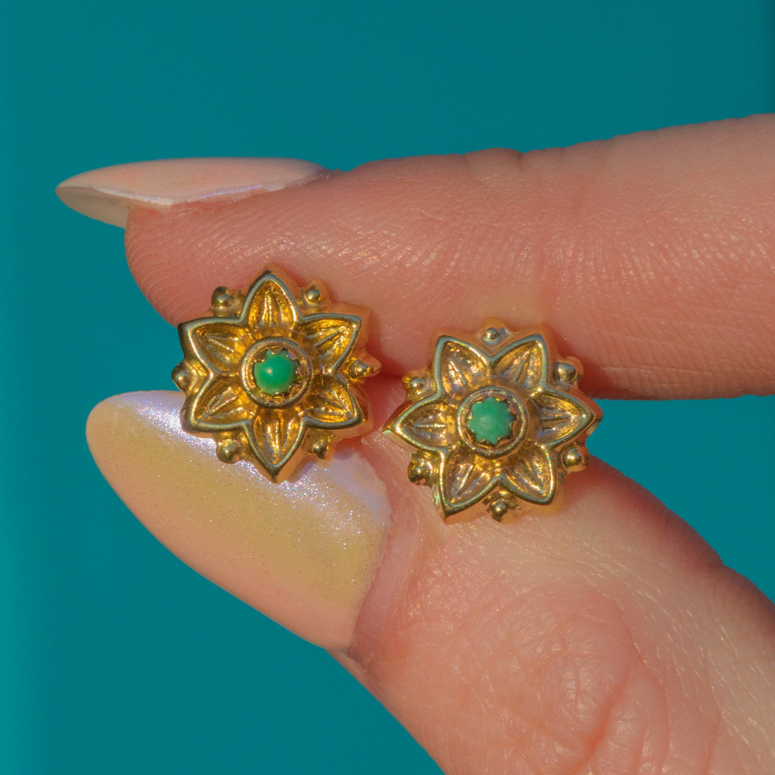 Crafted from buttery 9ct Gold, each earring features a vibrant Turquoise stone in her centre. Each Turquoise is set within an intricately detailed floral setting, wonderfully crafted, giving each vintage stud added texture and depth.
