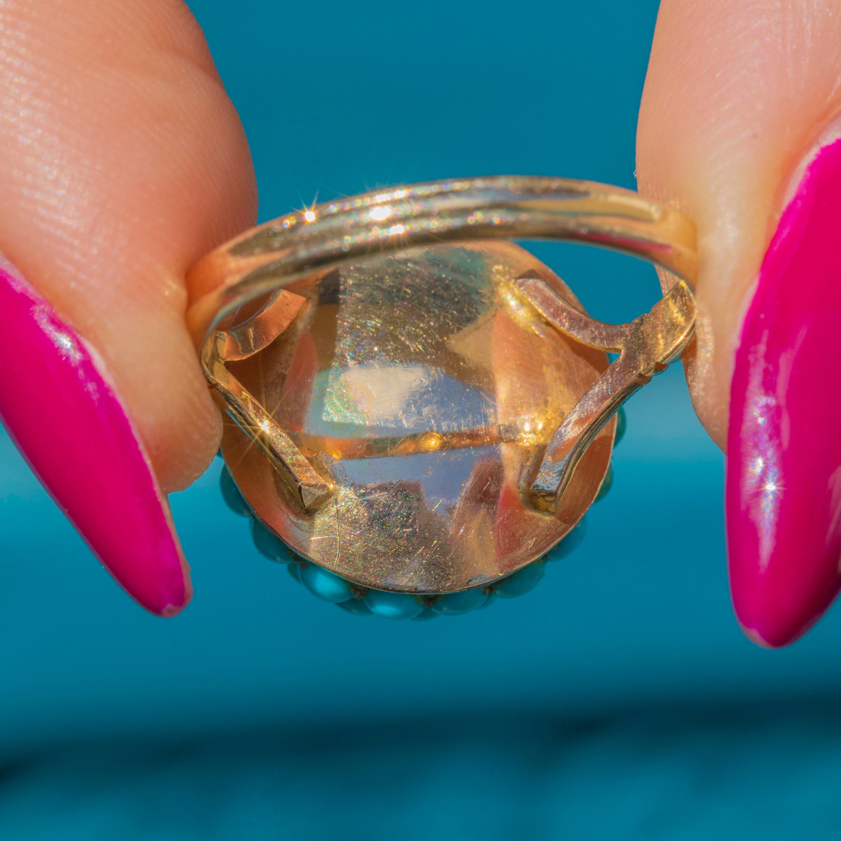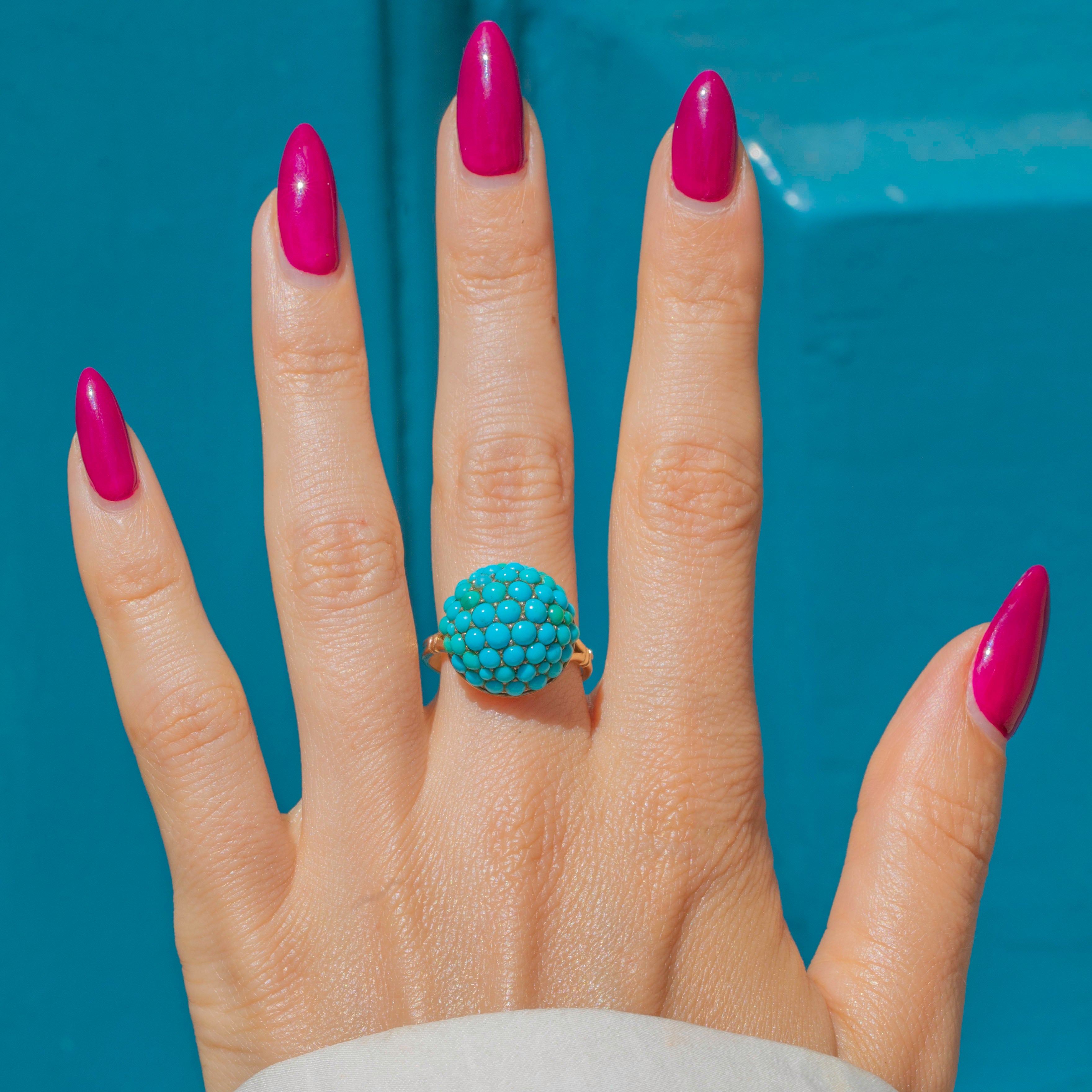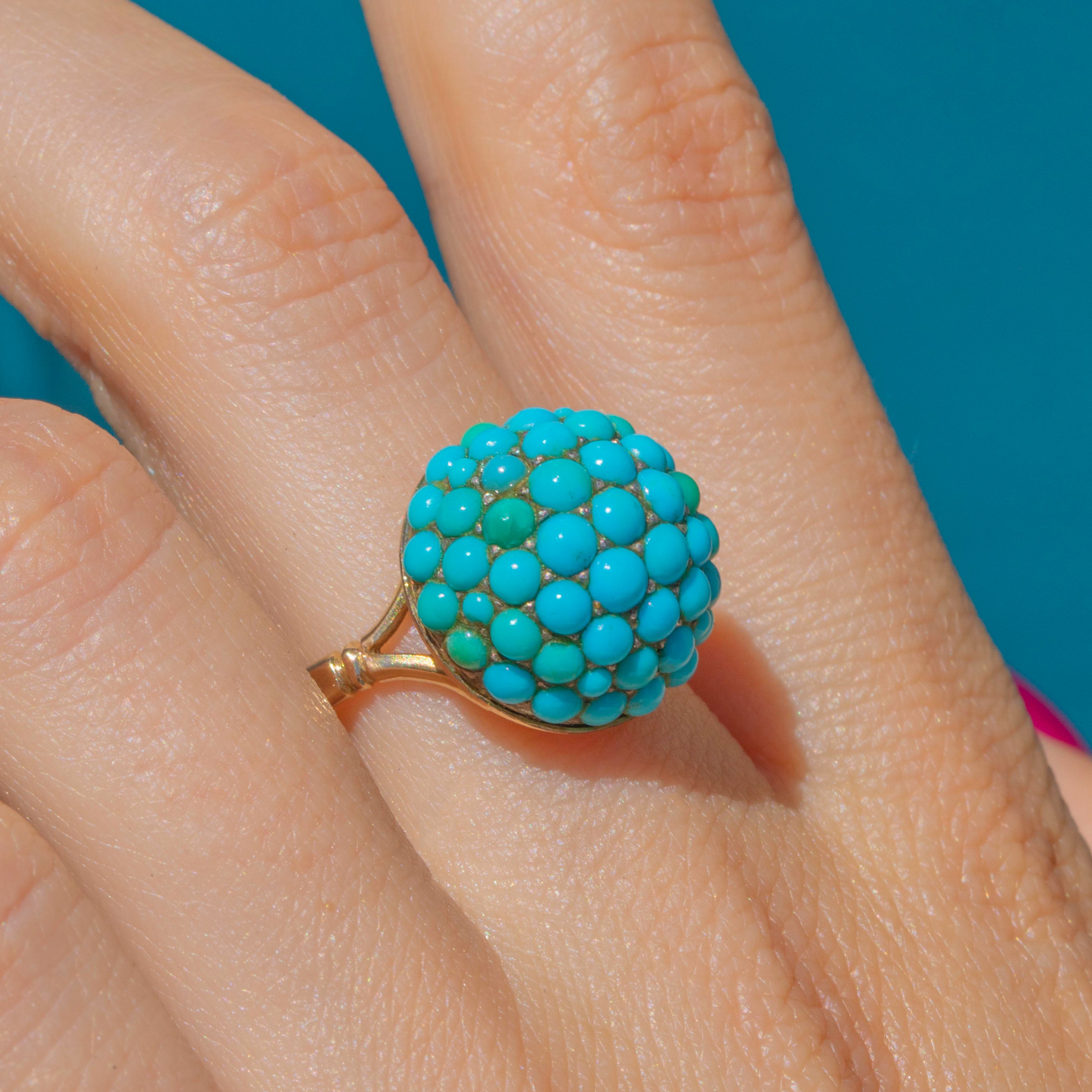 This antique Turquoise bombe ring is a tantalising treat! The curvaceous ring face is completely covered in dainty pavé-set Turquoise cabochons, their varying blue and green hues combining to create a visually striking effect.