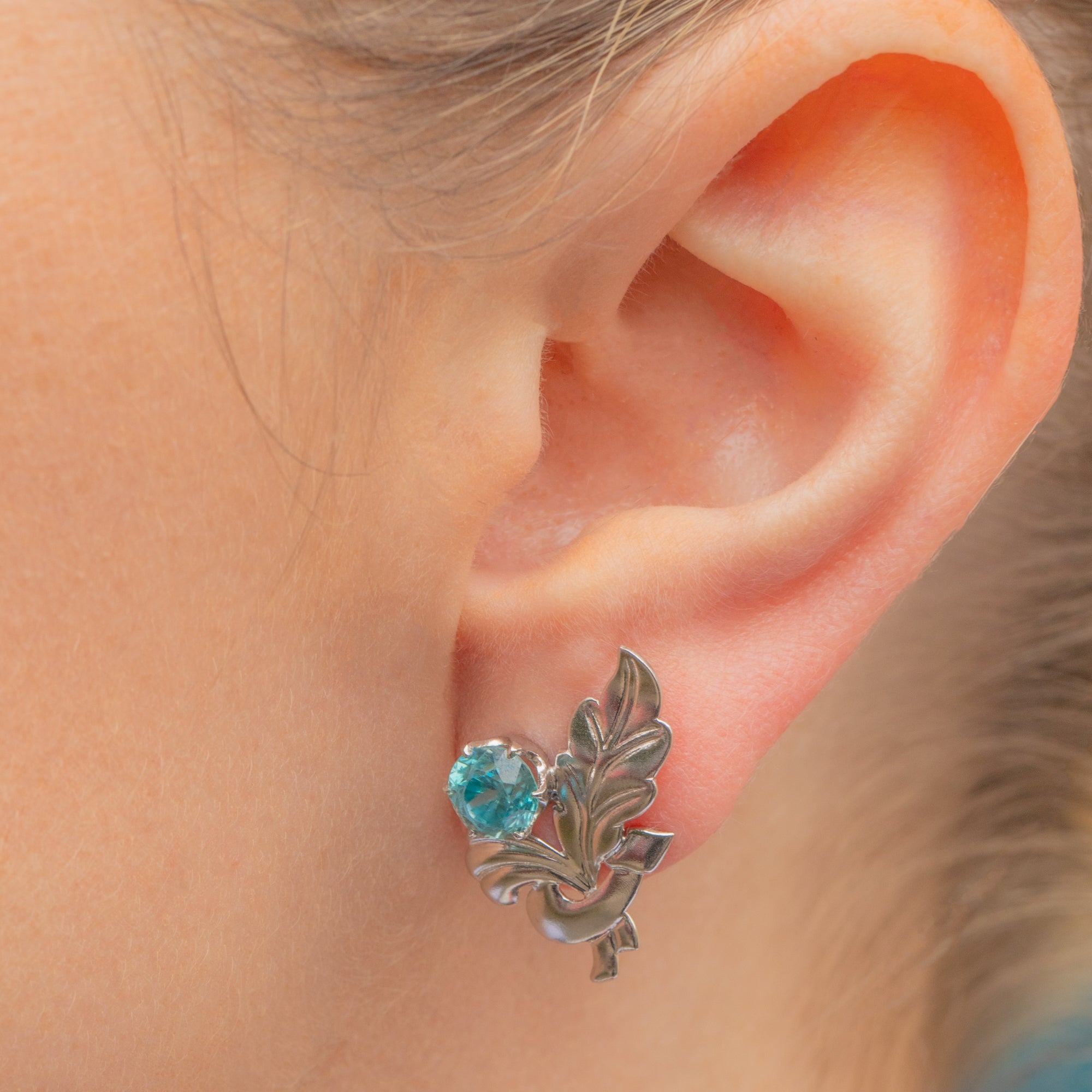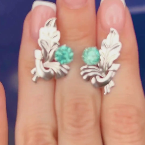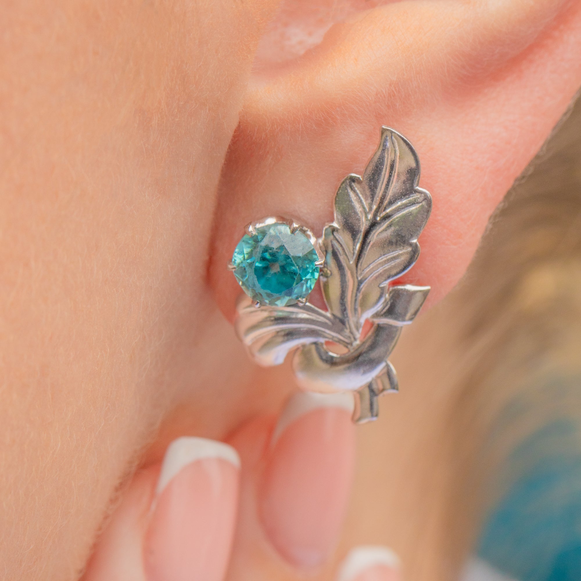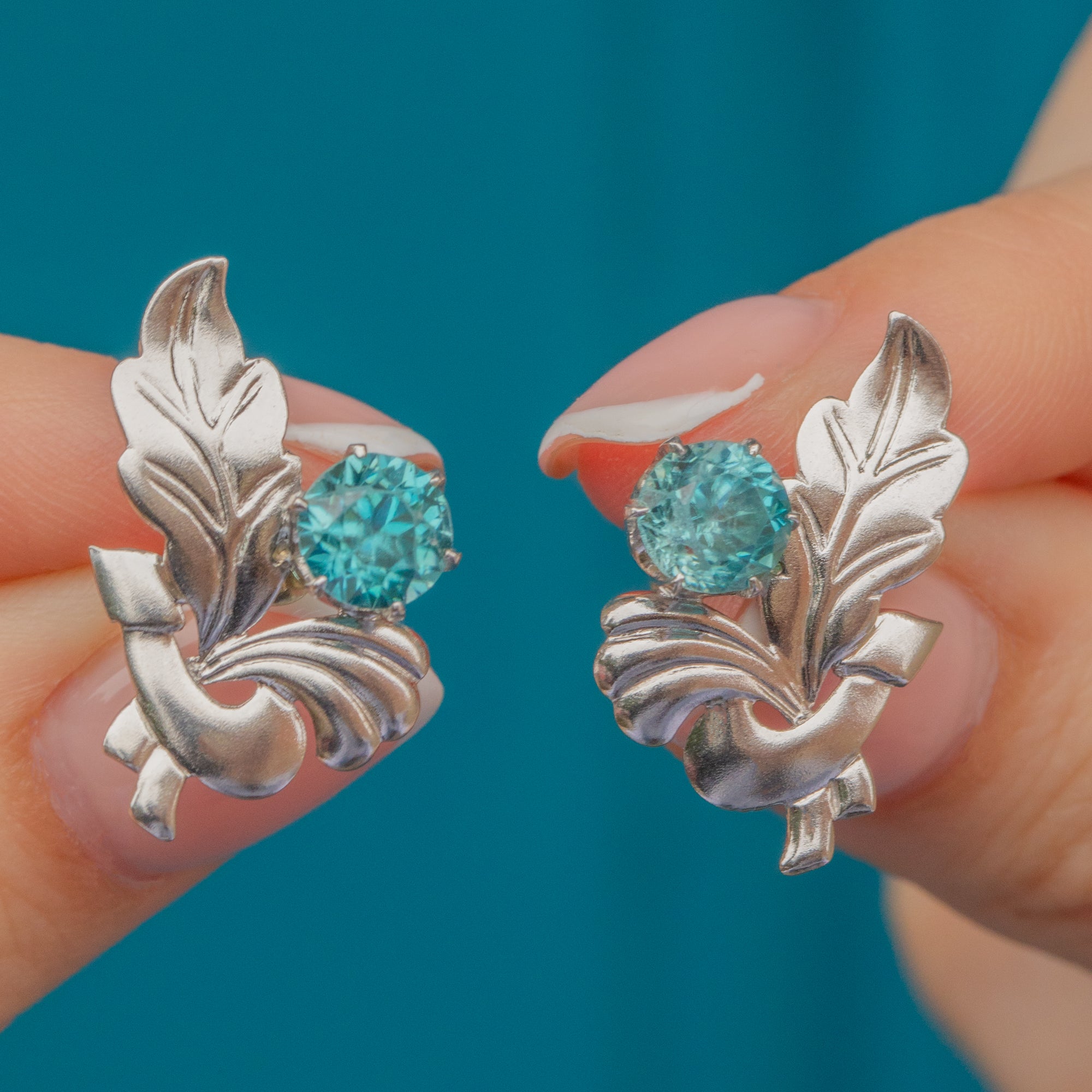 These Vintage Zircon studs are cast in a gorgeously smooth 9ct White Gold that provides a lustrous, sleek appearance, pairing effortlessly with any style. We adore the leaf detail adding a delicate and natural touch that beautifully enhances the overall charm of the piece. Perfect for both everyday wear and special occasions, these earrings offer a timeless elegance that complements any outfit.