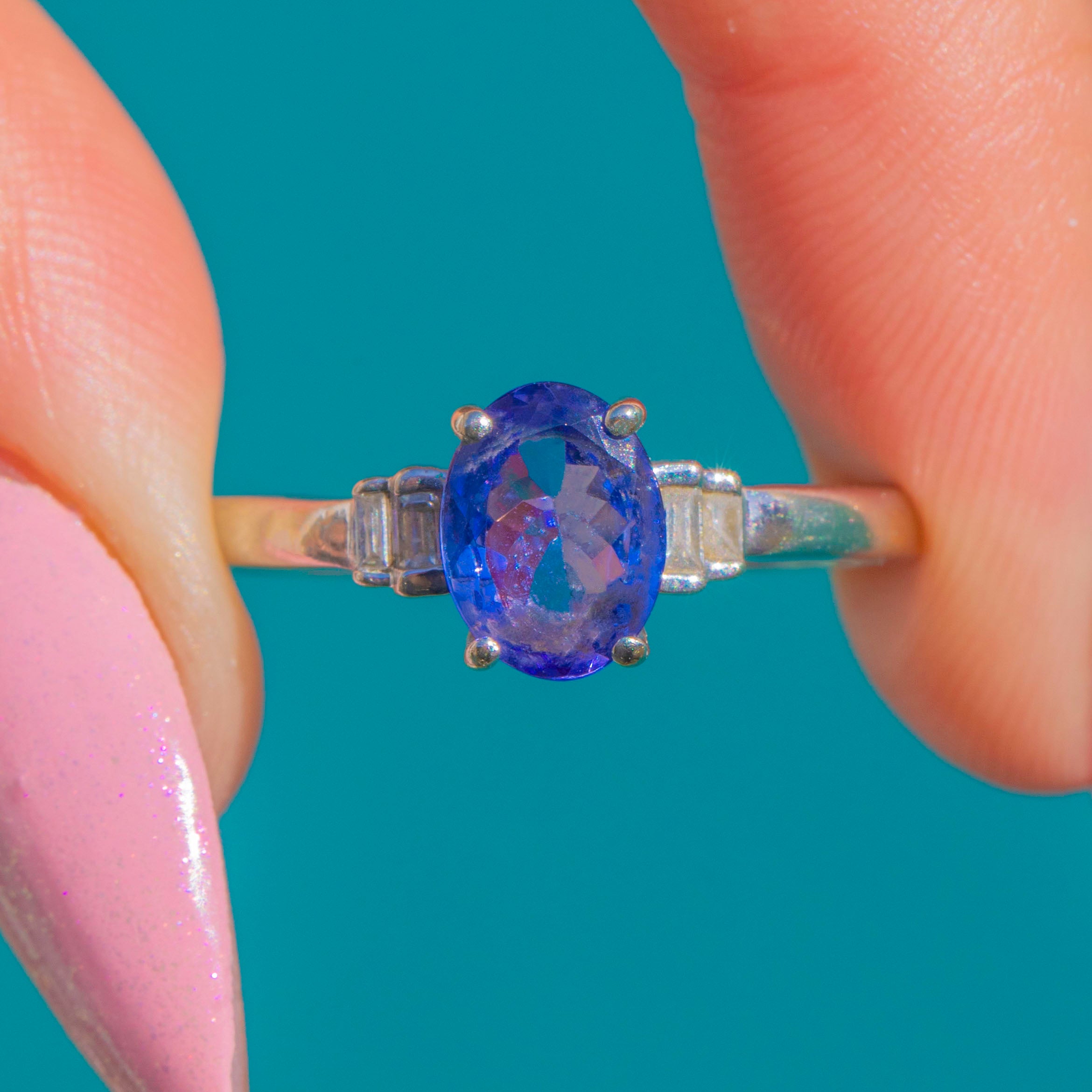 Sleek and architectural, this pre-loved three-stone ring pairs a vivid blue-violet Tanzanite with crisp tapered baguette Diamonds in bright 9ct White Gold. The elongated oval centre is cradled in a refined four-claw open basket, while stepped shoulders and clean lines nod elegantly to Art Deco geometry.