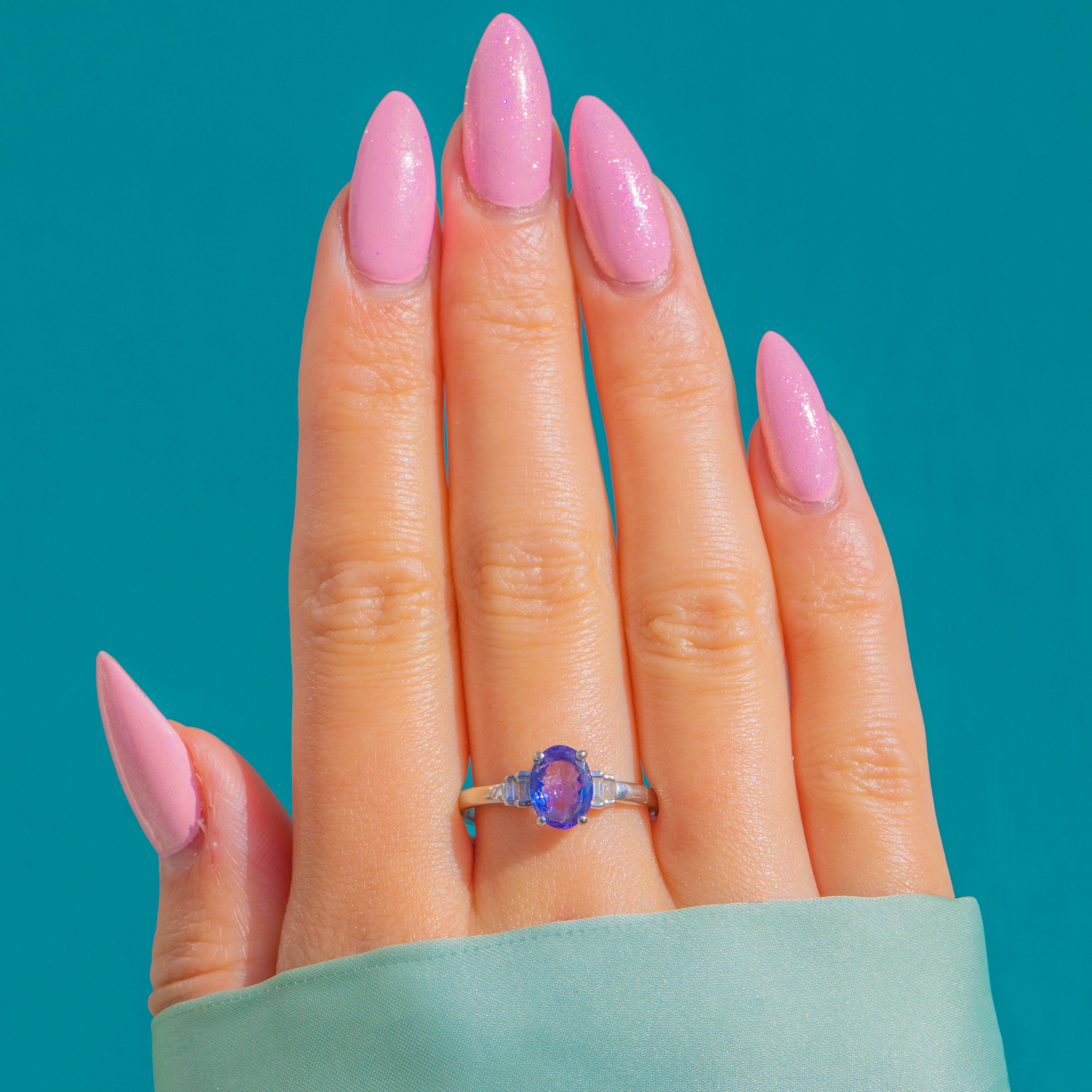Hallmarked for 2019, it’s a chic, modern classic with beautiful presence. The Tanzanite, approximately 0.85ct, glows with velvety colour, complemented by ice-bright Diamond accents that add a precise, linear sparkle. A polished shank completes the look—effortless, refined, and made to be worn and adored.