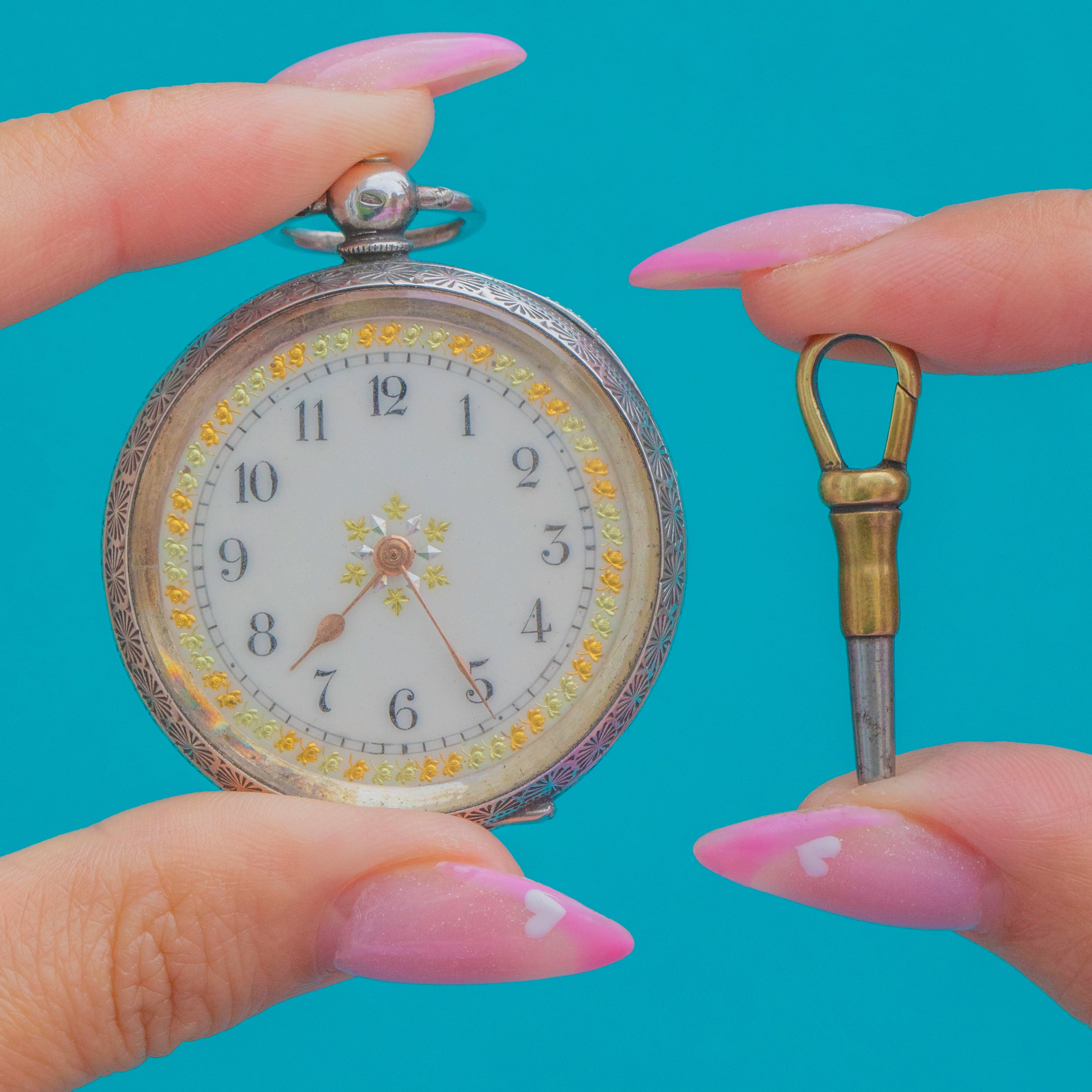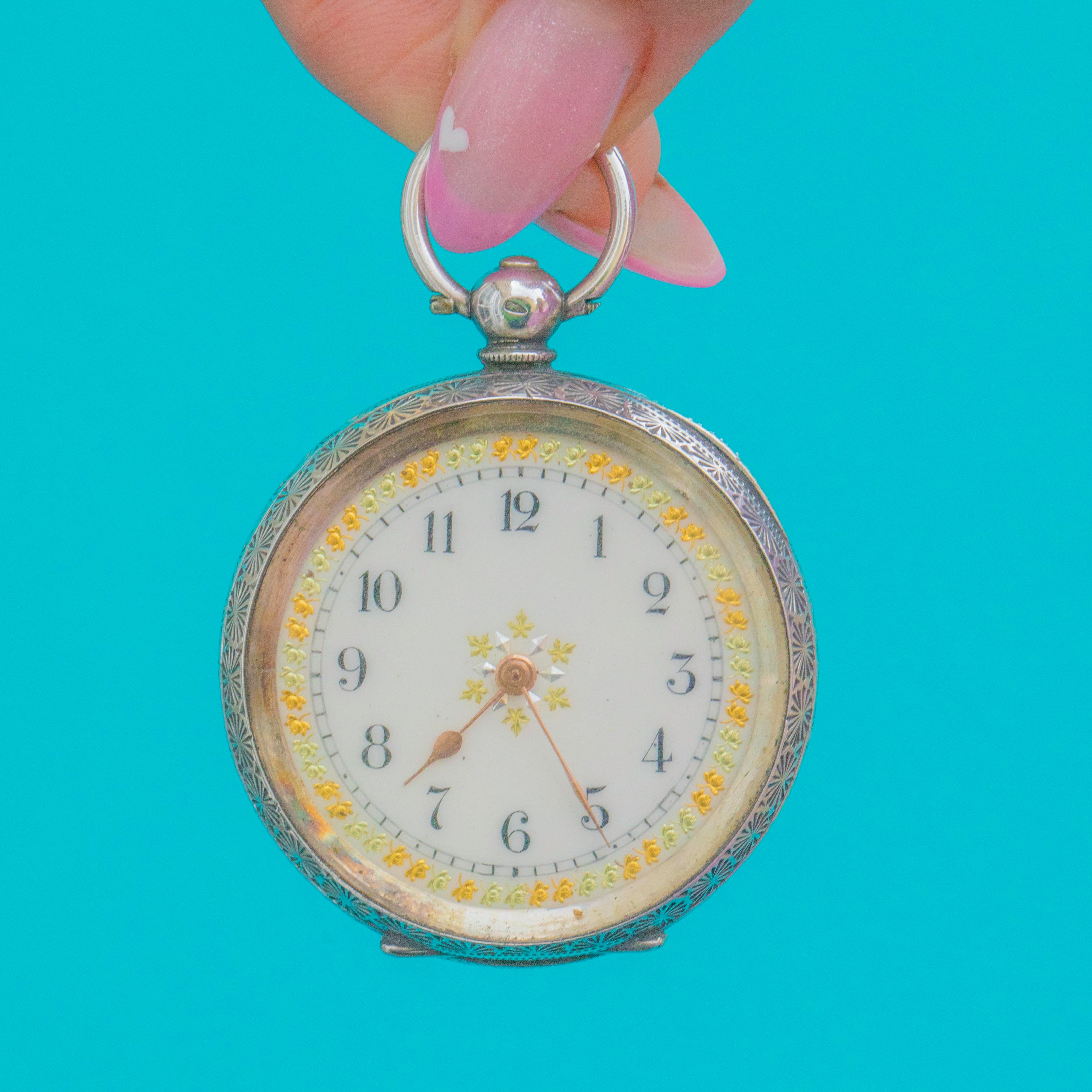Aesthetic Antique Silver Swiss Ladies Pocket Watch, Working with Key. Era Edwardian, 1907.