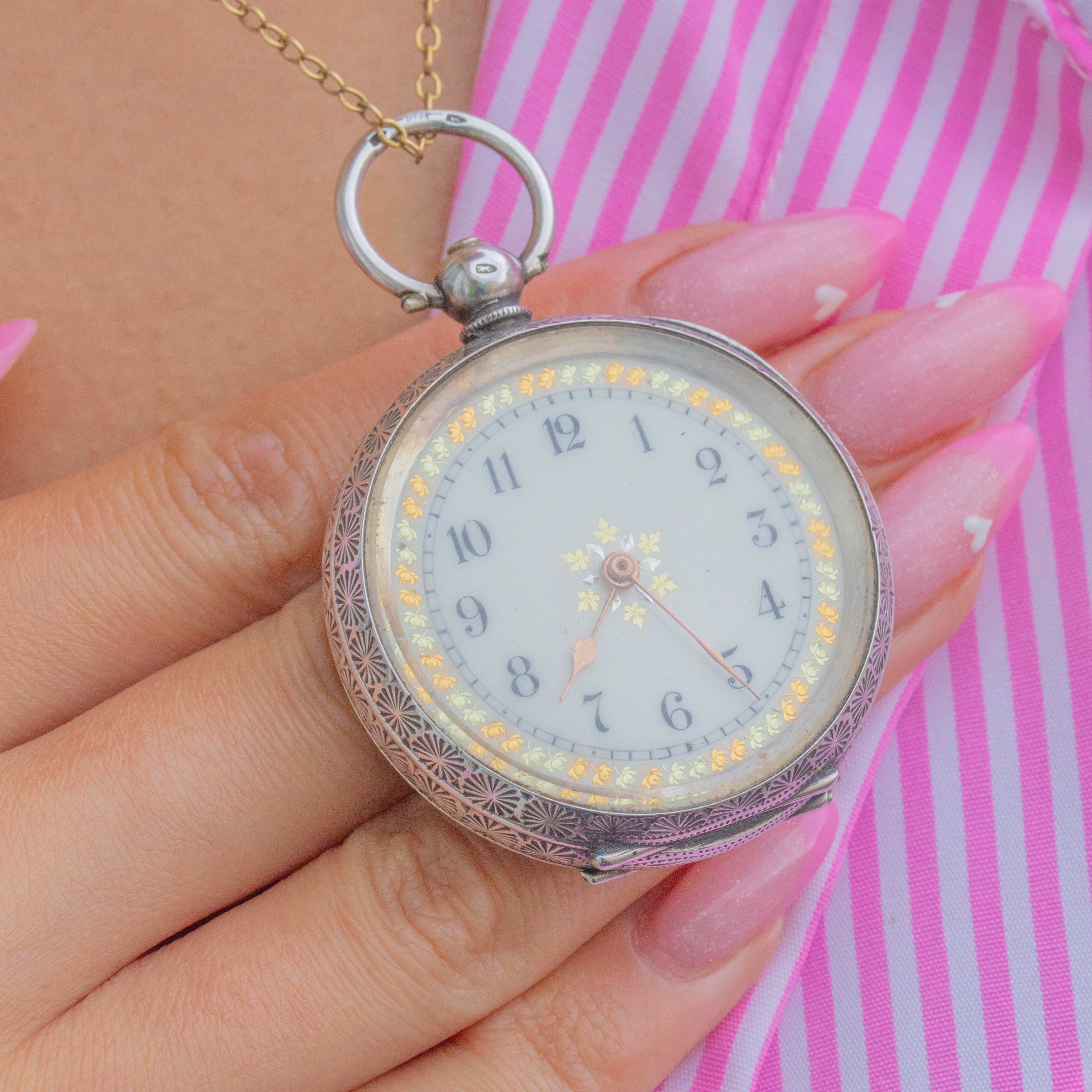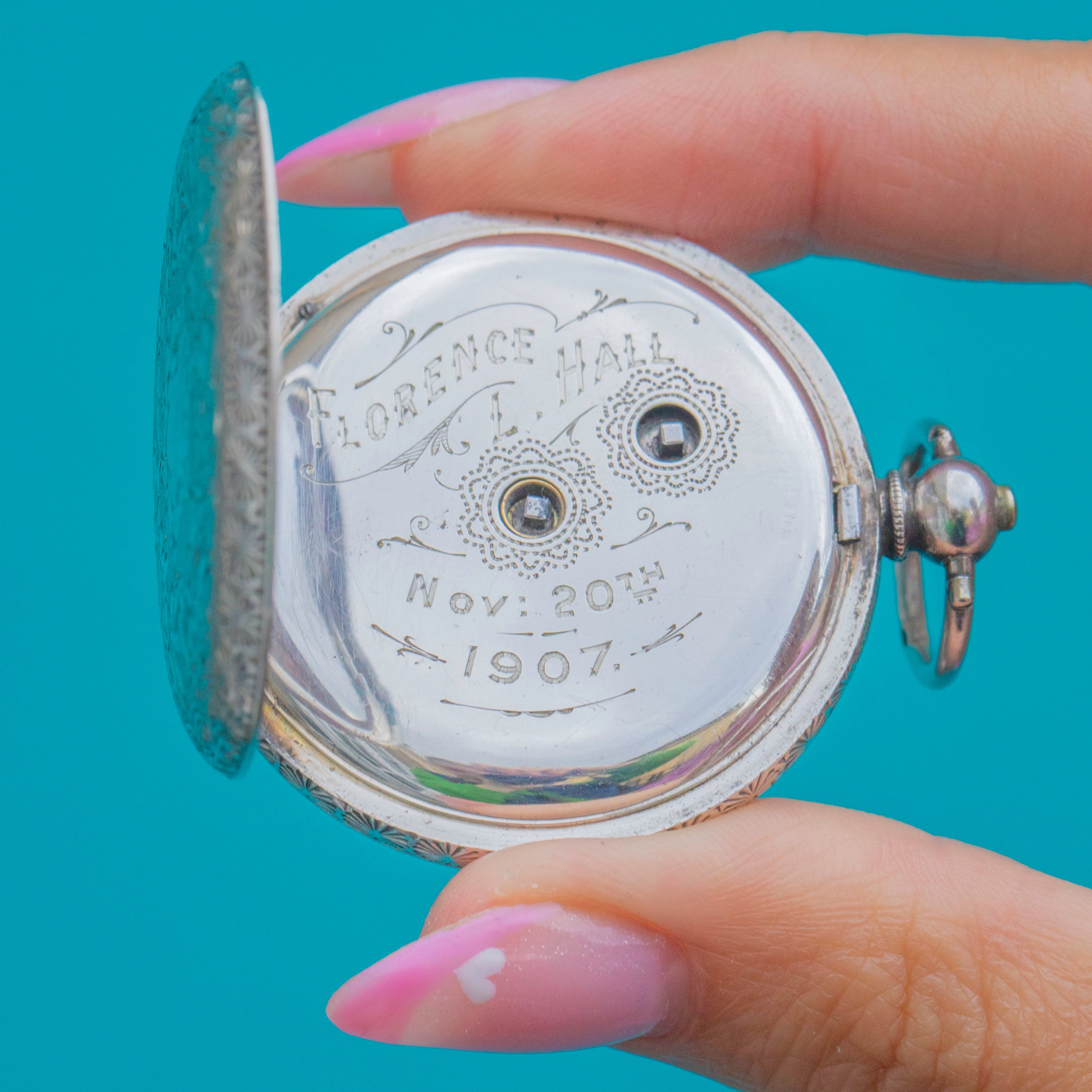 This beautiful Edwardian ladies’ pocket watch embodies the grace and artistry of the early 20th century. Crafted in fine Swiss 935 Silver, it features ornate Aesthetic engravings to both sides of the case and a charming hand-engraved inscription inside reading “Florence L. Hall, Nov 20th 1907.”