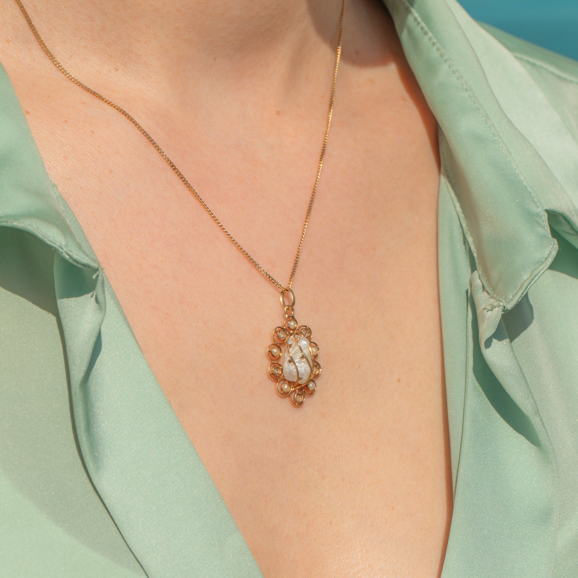 Delicate circles of 14ct Gold halo the Baroque Pearl, dotted with alternating Seed Pearls and rose-cut Diamonds that glint in the light. Simply suspend this Victorian pendant from a fine Gold chain to add a touch of whimsical charm to your attire!