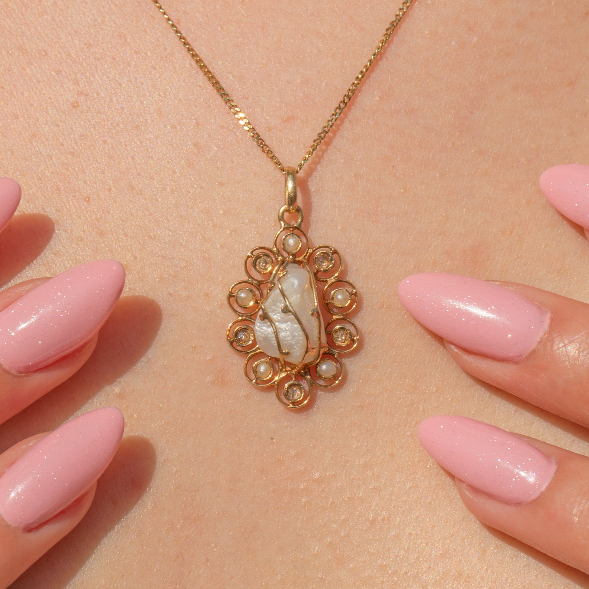 This antique 14ct Gold Baroque Pearl Diamond pendant is a unique piece for your collection! A shimmering Baroque Pearl sits centrestage, its natural form wrapped in Gold wire to create a distinctive design.
