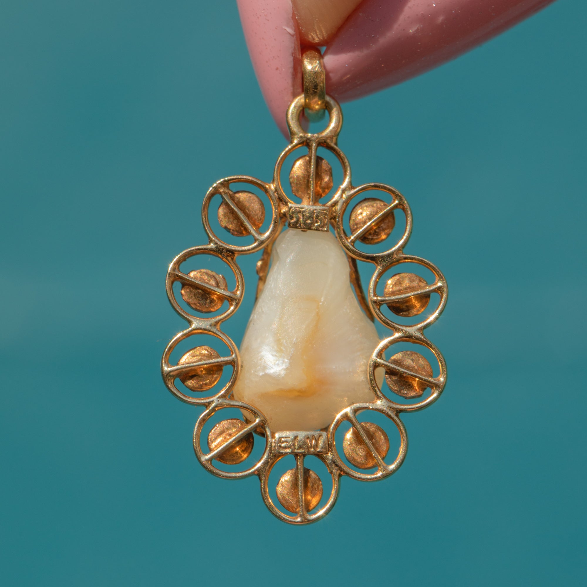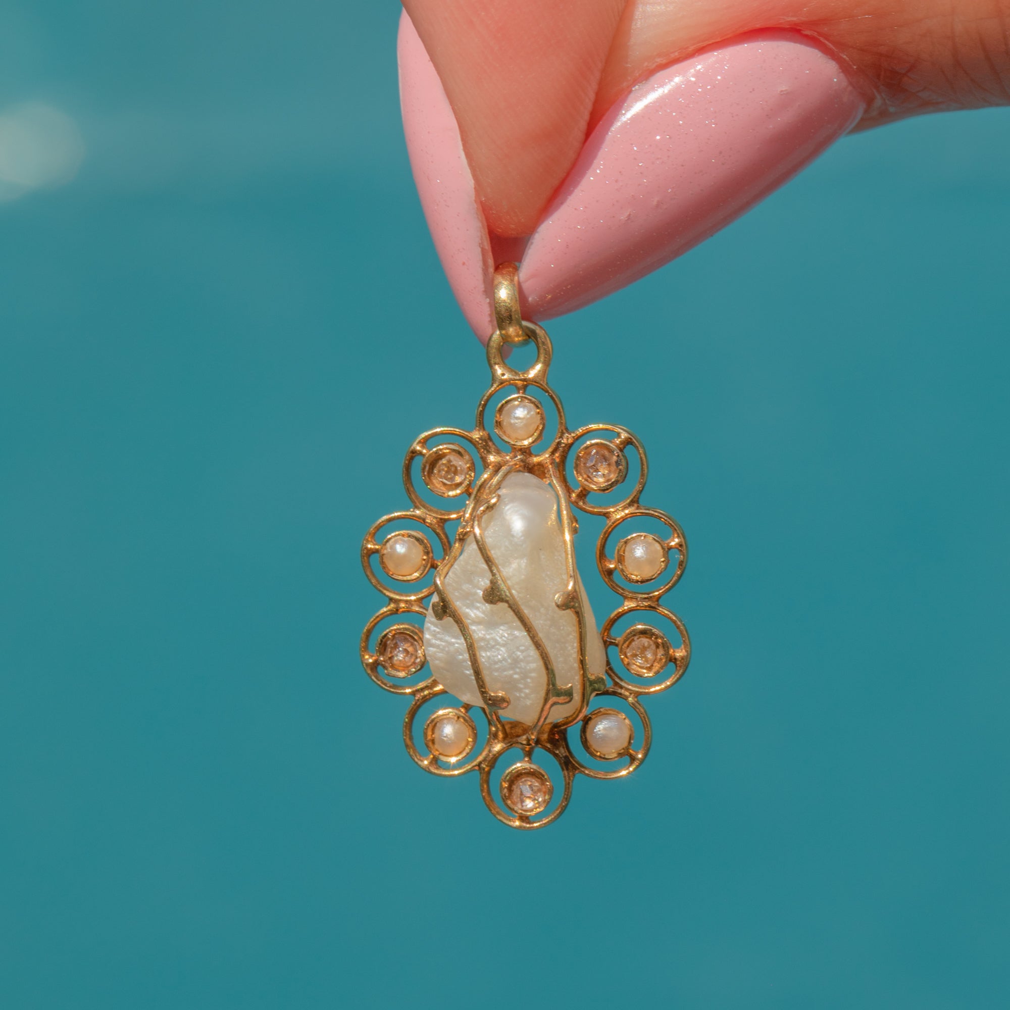 Antique 14ct Gold Baroque Pearl Diamond Pendant