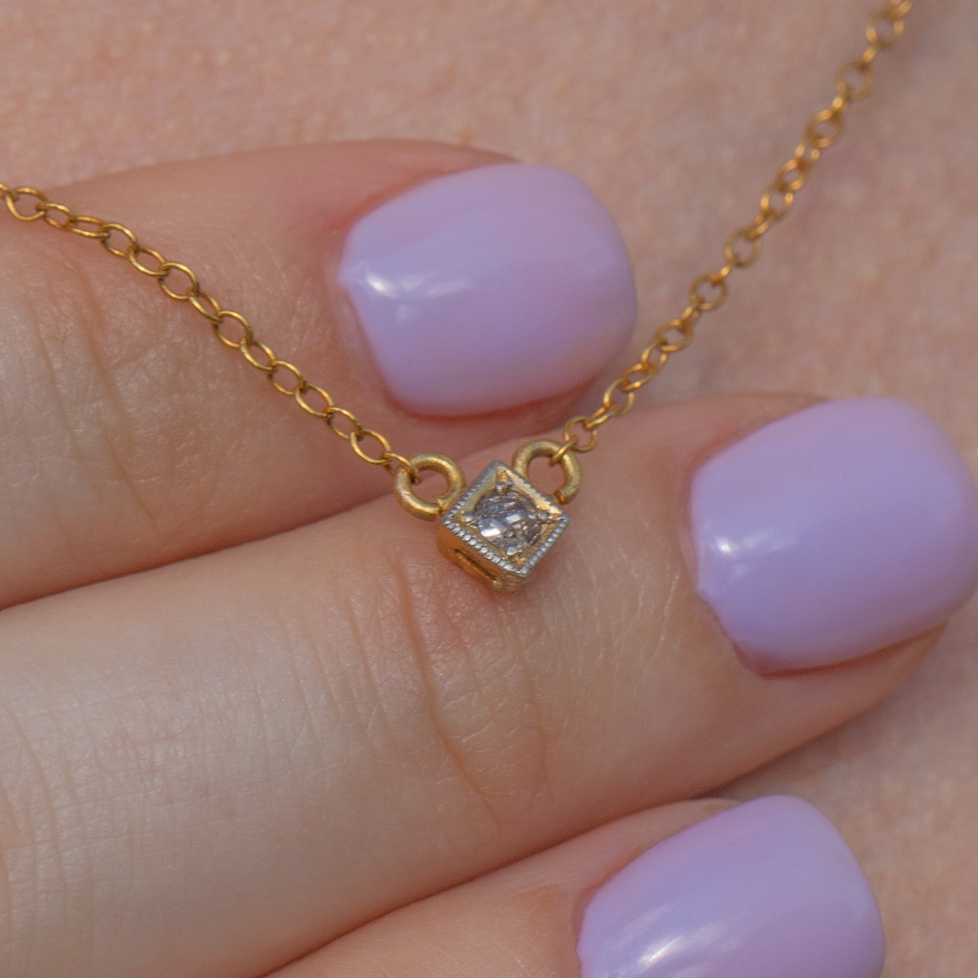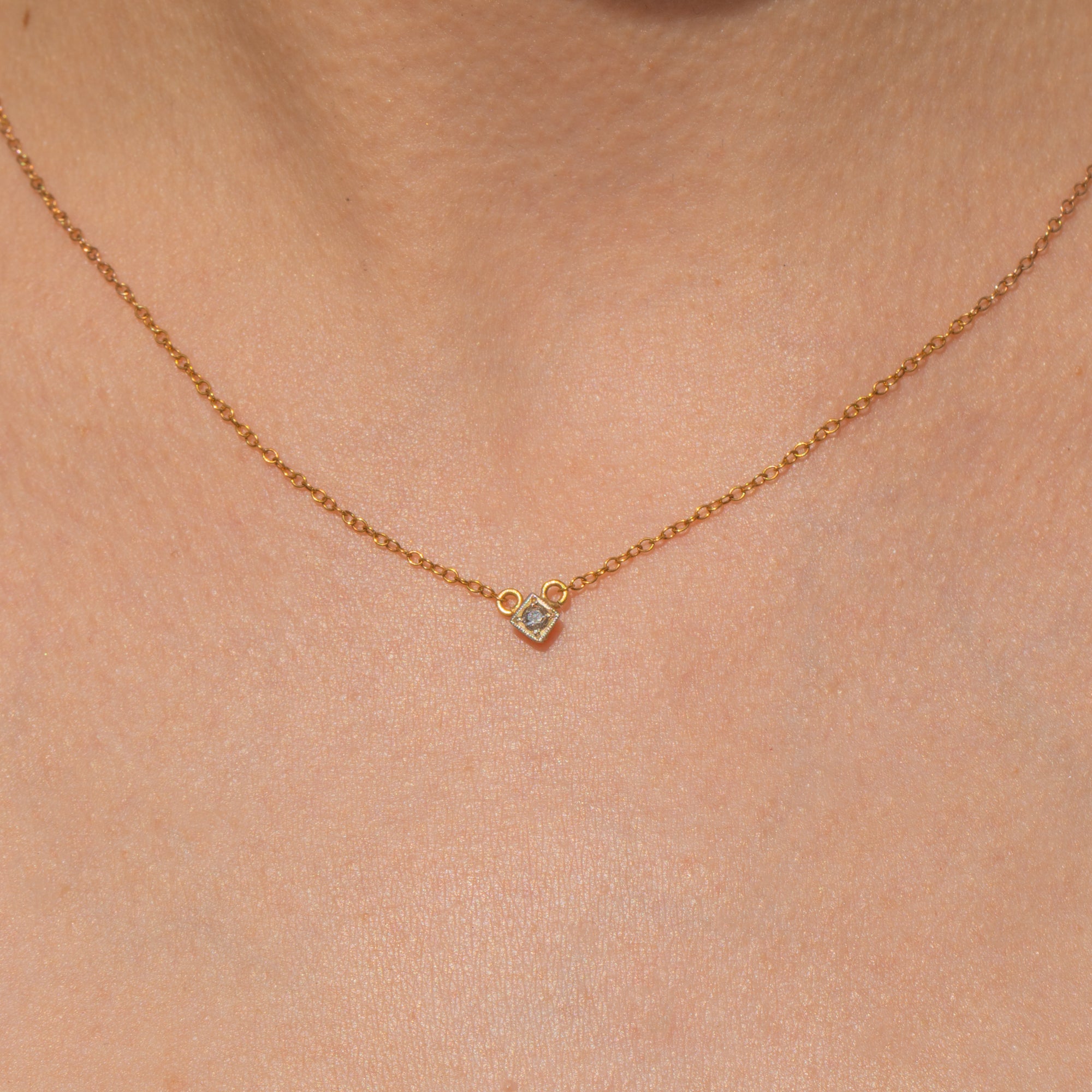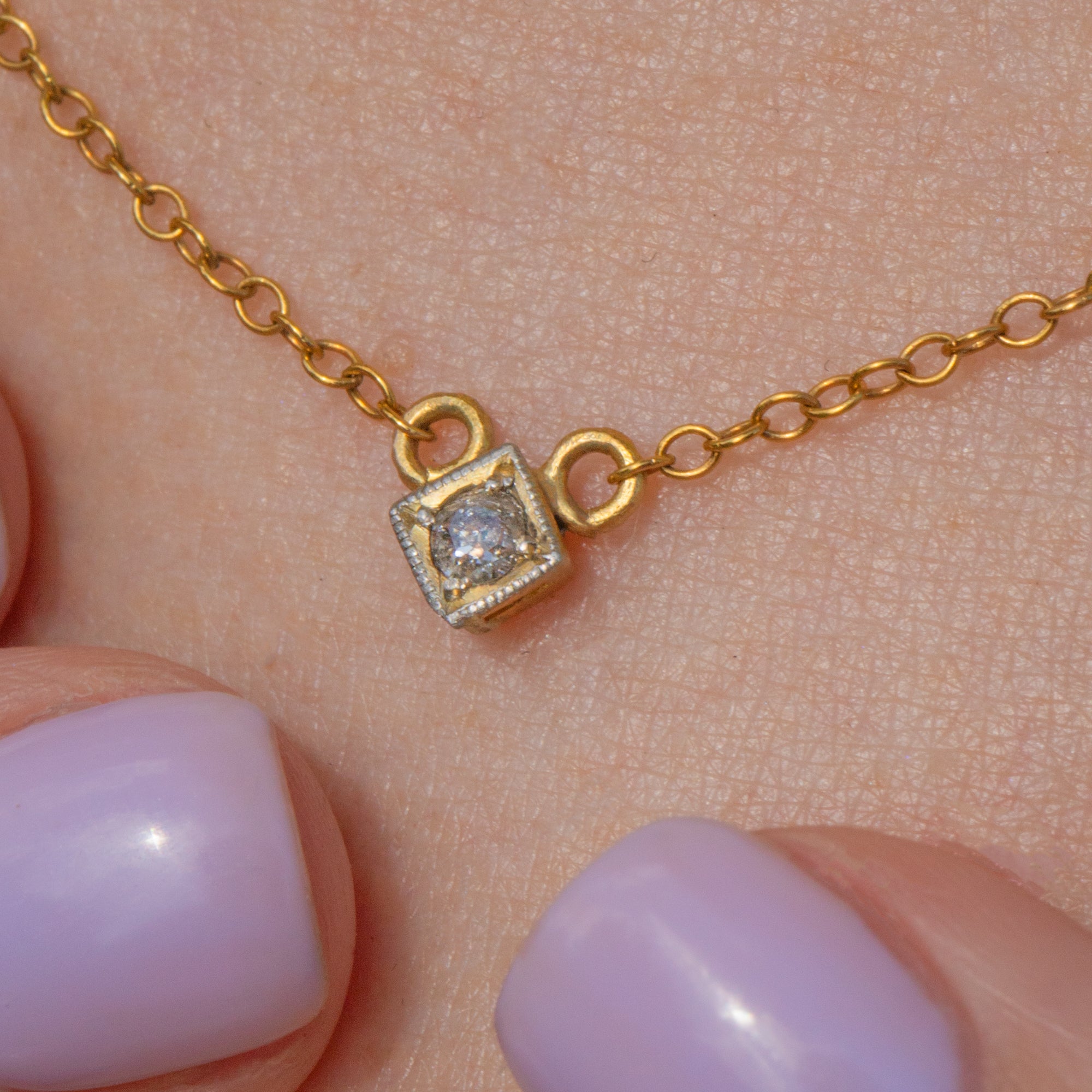 This elegant antique Diamond integral necklace will make a sweet addition to your collection! Crafted from 14ct Gold, this dainty integral necklace has an old-mine cut Diamond at its centre bringing a subtle sparkle to your décolletage.