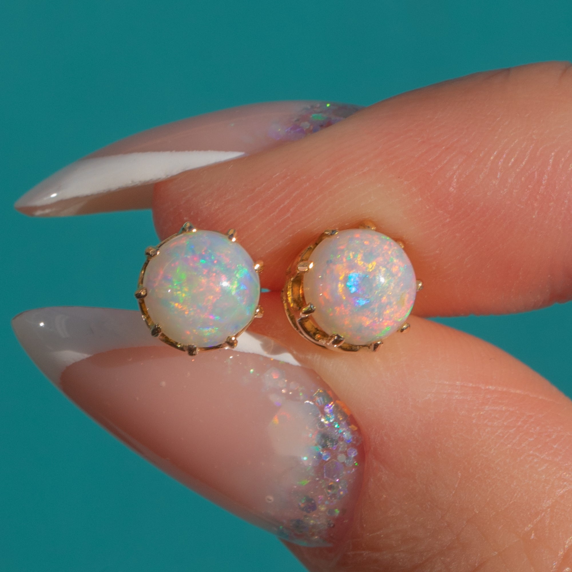 Luminous and full of colour-play, these Victorian Opal studs glow with soft pastels and flashes of neon fire in the light. Each cabochon sits proudly in a 15ct Gold crown setting, creating a timeless silhouette with a touch of antique romance.