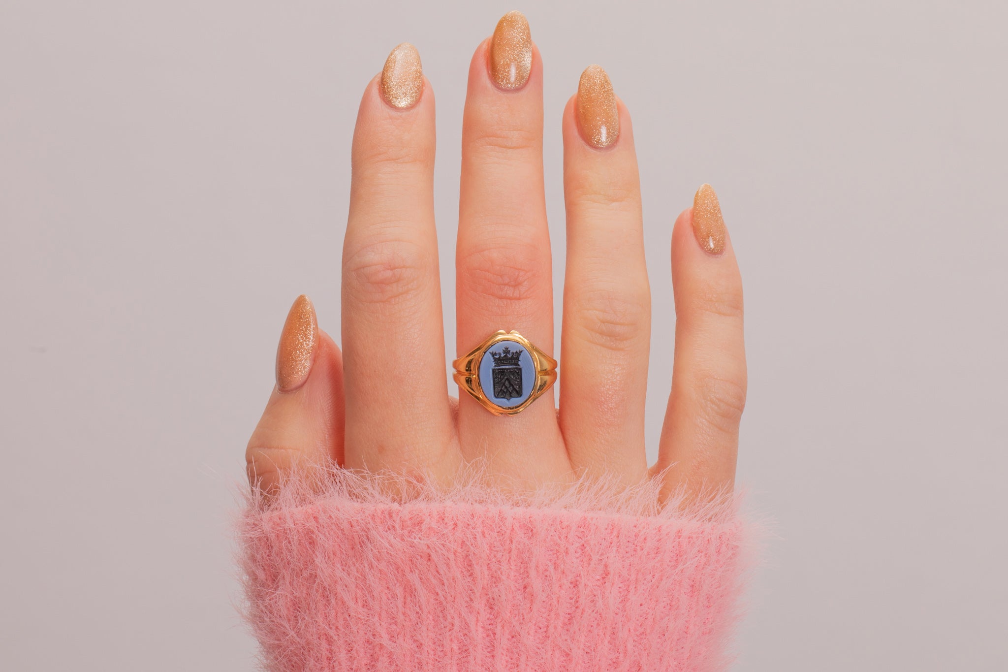 Her antique signet ring head is composed of a flint grey banded Agate with a royal heraldic intaglio carved into her hard stone, revealing her charcoal black colour underneath. We believe this would have been a family heirloom, with their family crest engraved into her Agate. A truly remarkable piece rich with history!