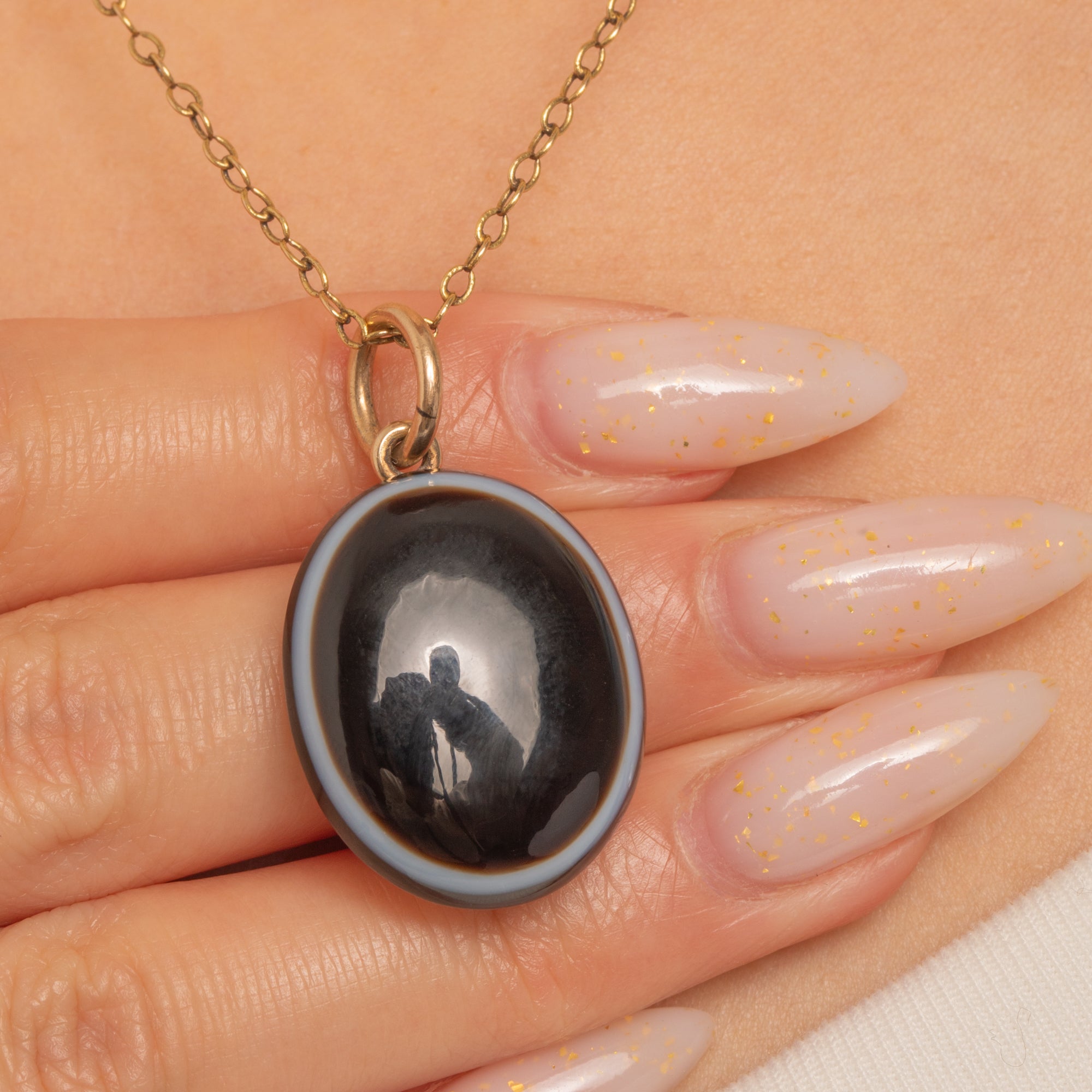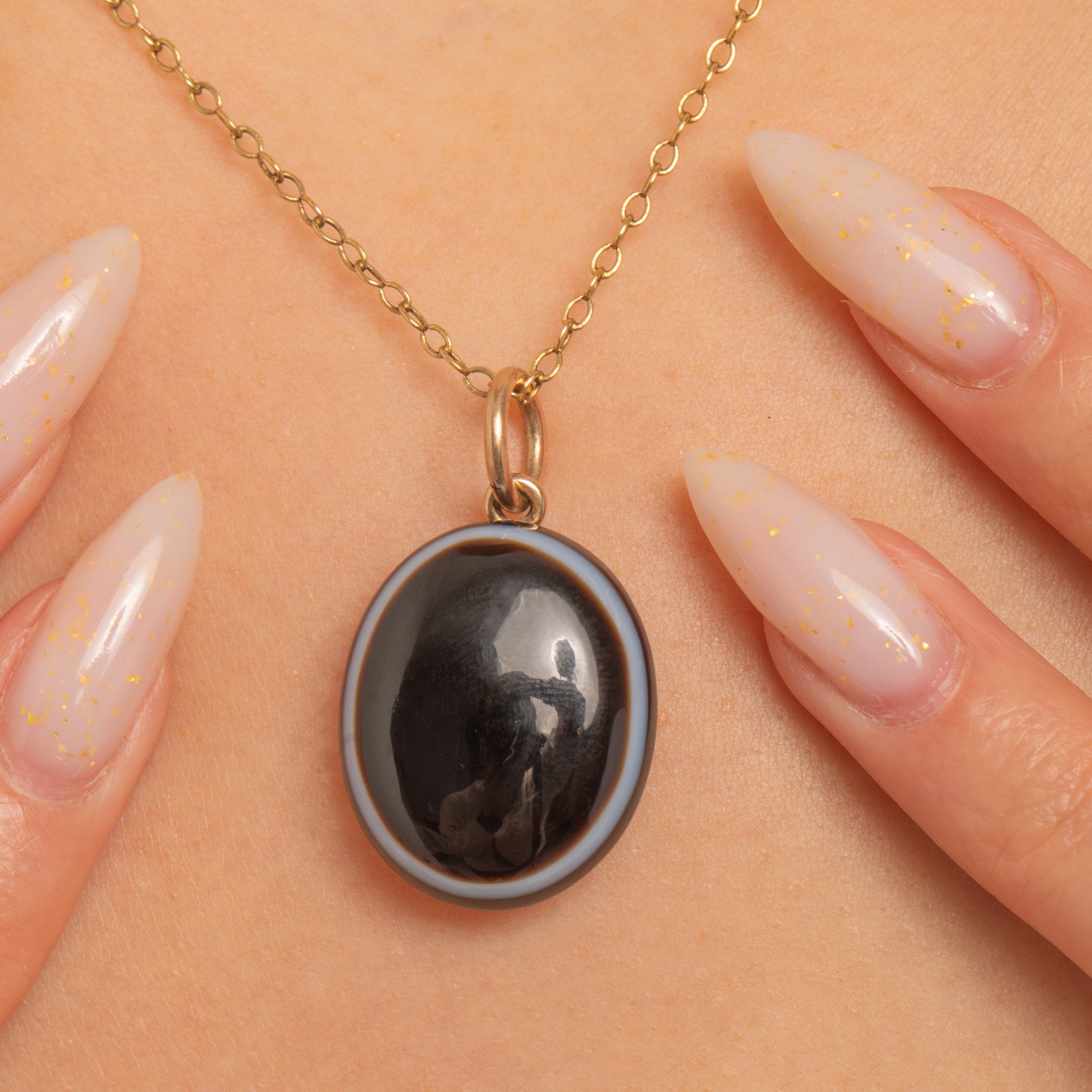 A beautifully classic Victorian locket back pendant, crafted in rich 15ct Gold and set with a striking Banded Agate, often known as Bull’s Eye Agate. The agate has a wonderfully glossy finish and those deep, natural bands that make this stone so endlessly collectible.