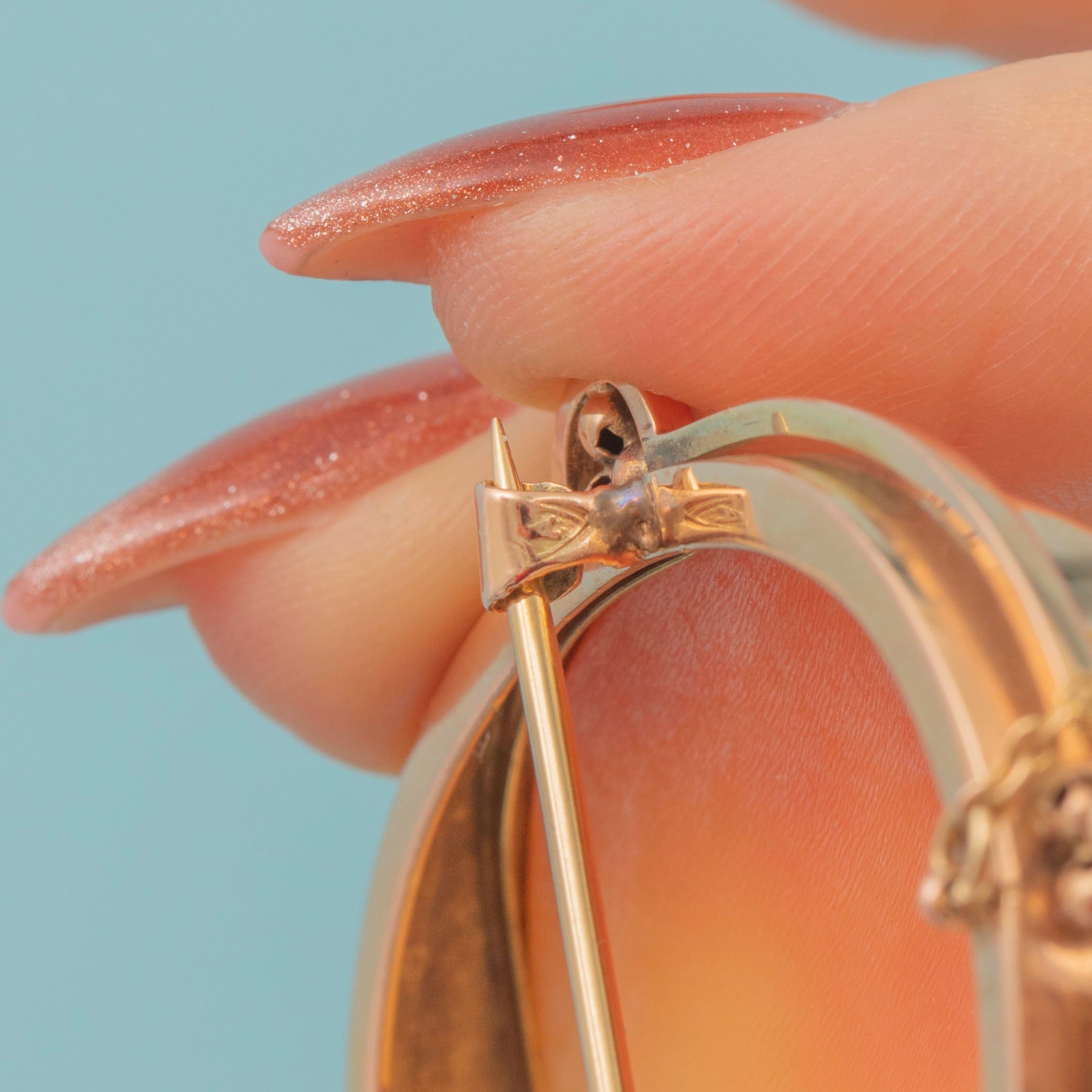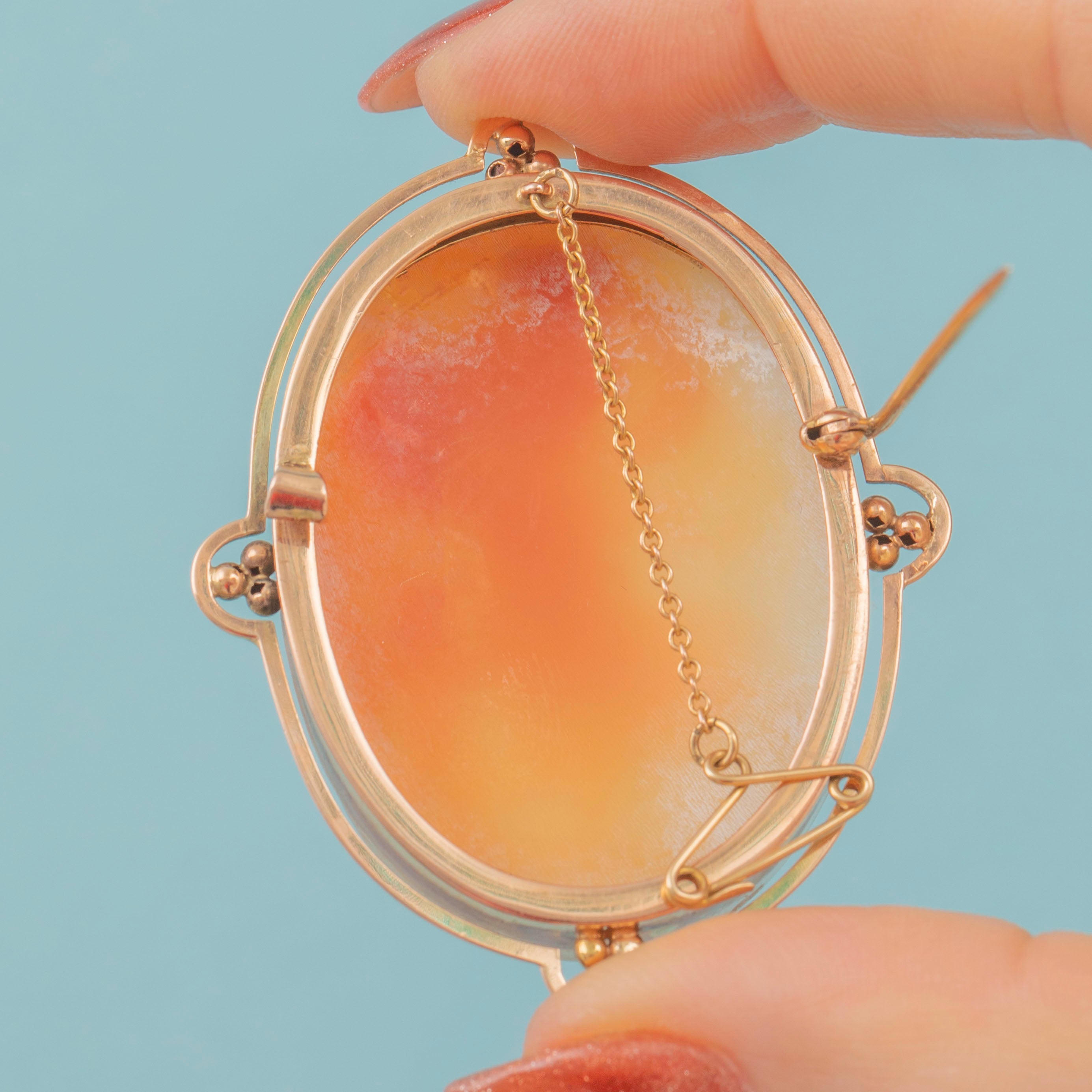 VERY GOOD: This antique 15ct Gold Cameo brooch is in overall very good condition for her age, with the cameo still retaining fine detail. There is some wear to the surface of the cameo, including slight signs of age-related wear to the carving. The 15ct Gold frame also shows some wear, with minor marks and light surface scratches consistent with her antique nature. The Gold frame is robust and the pin is sturdy so you can wear this Victorian cameo brooch confidently, with an added security chain. The brooch remains a beautiful and collectible piece.