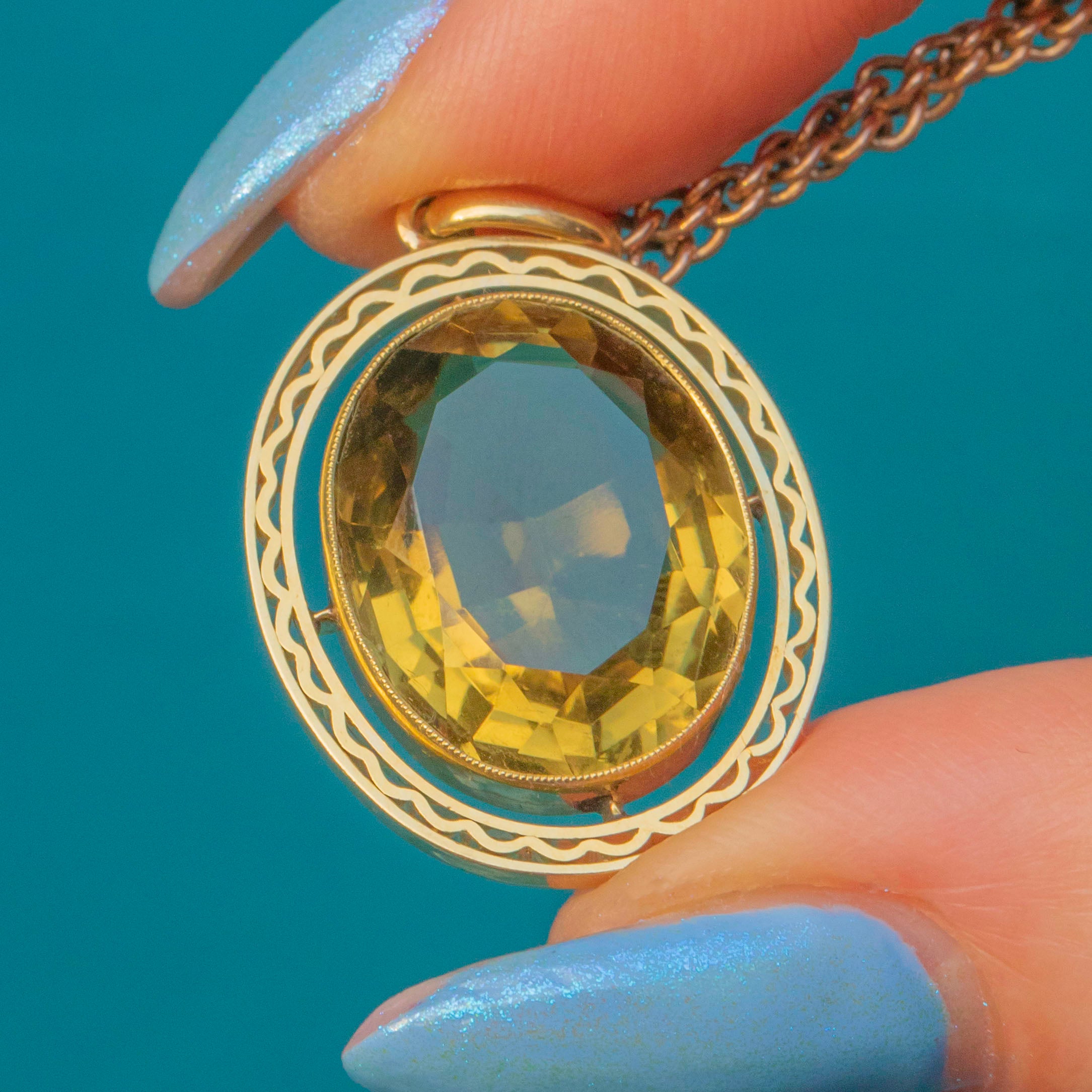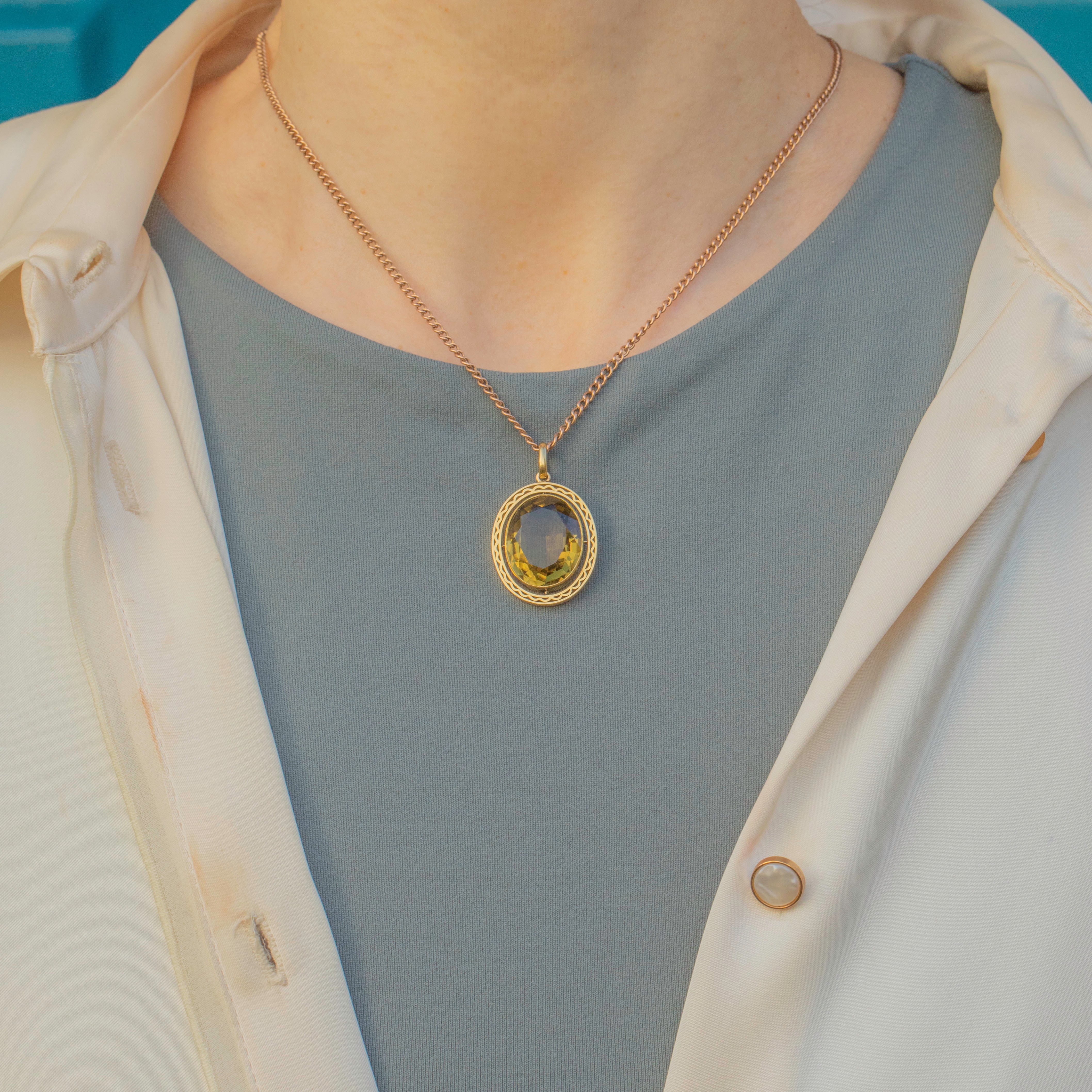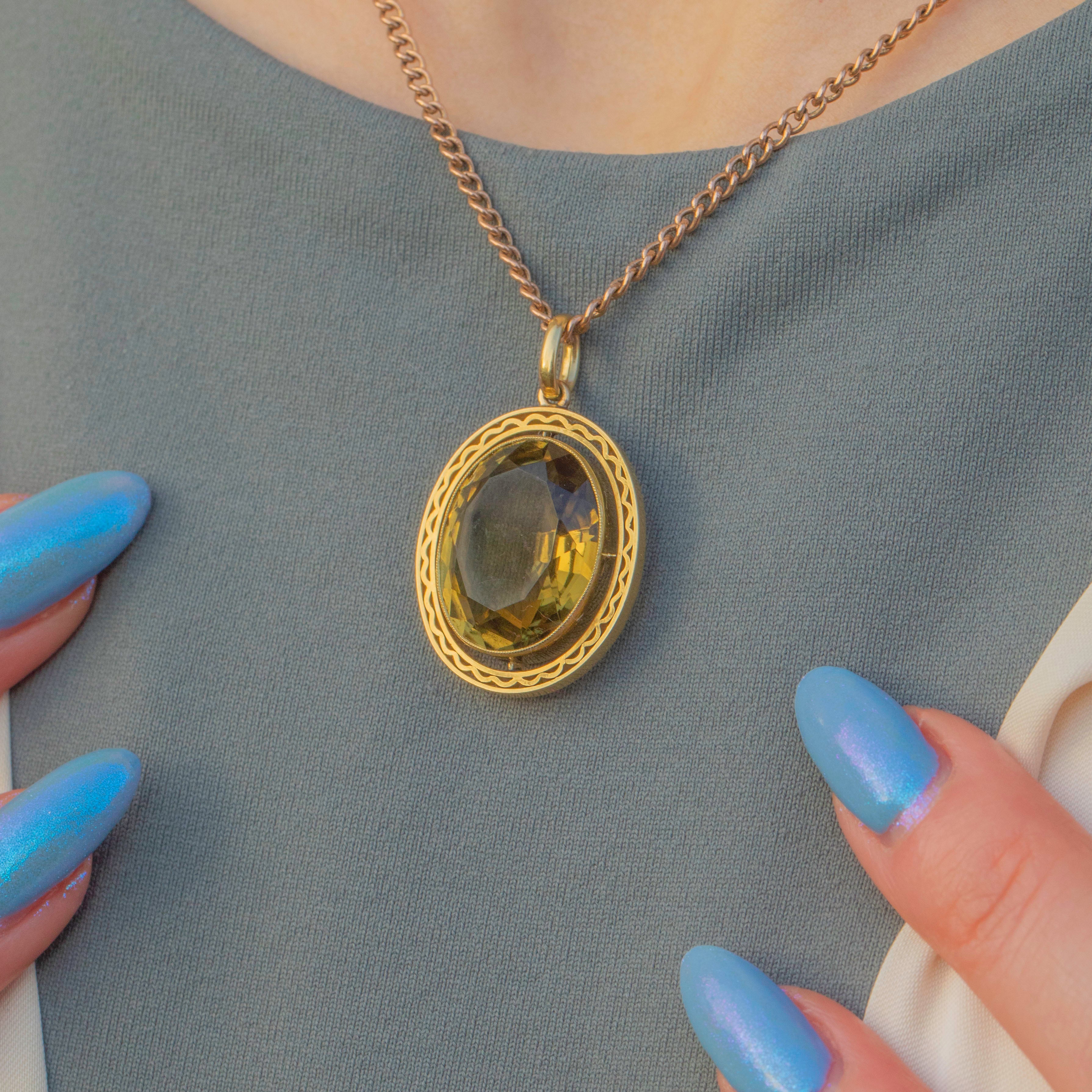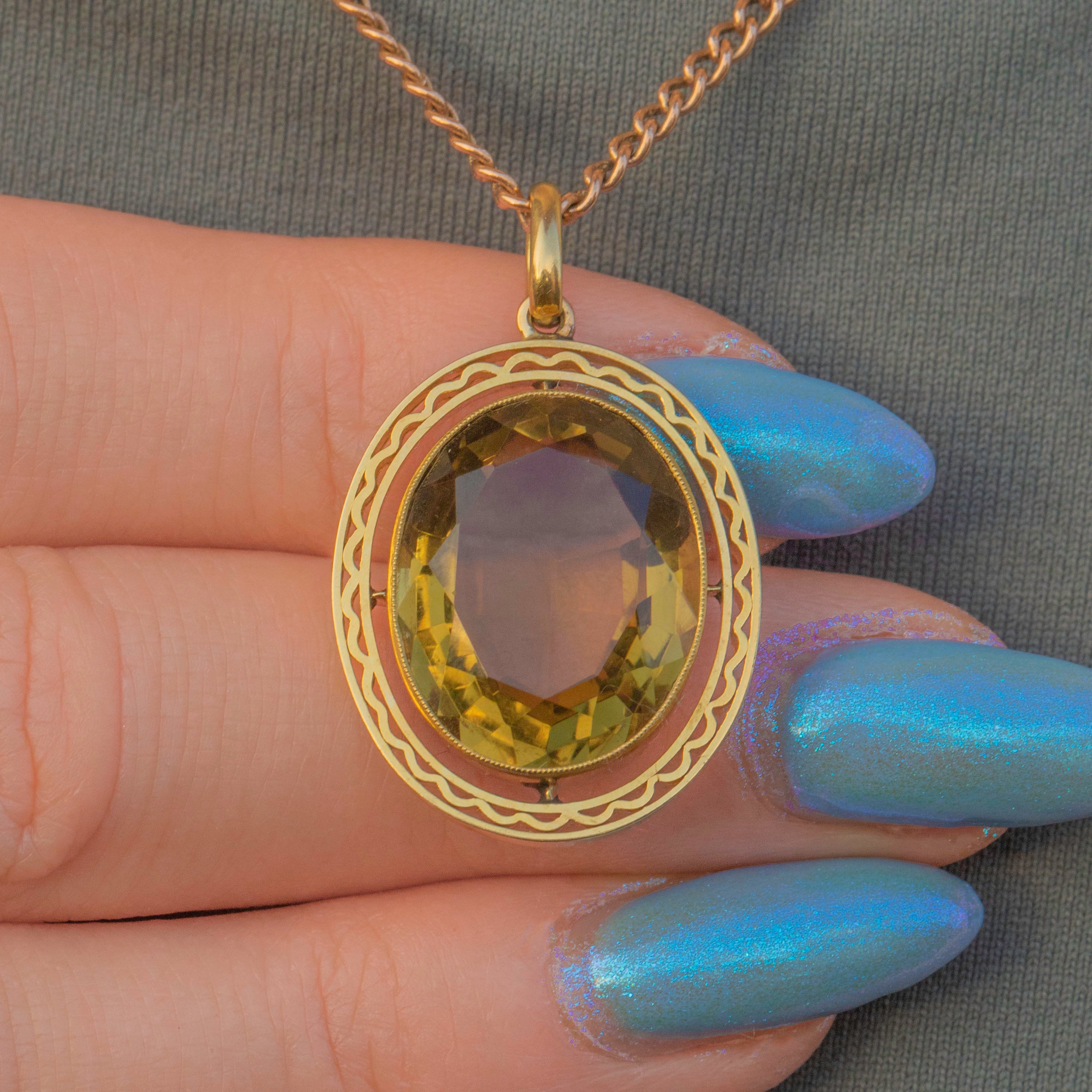 EXCELLENT. This antique 15ct Gold Citrine pendant is in excellent condition. The Citrine has crisp facets, free from chips or abrasions, and is securely held within its bezel setting. The details border is free from signs or wear and securely affixed. With a generously sized, chunky jump ring, you can wear this luminous piece of antique jewellery with absolute confidence!