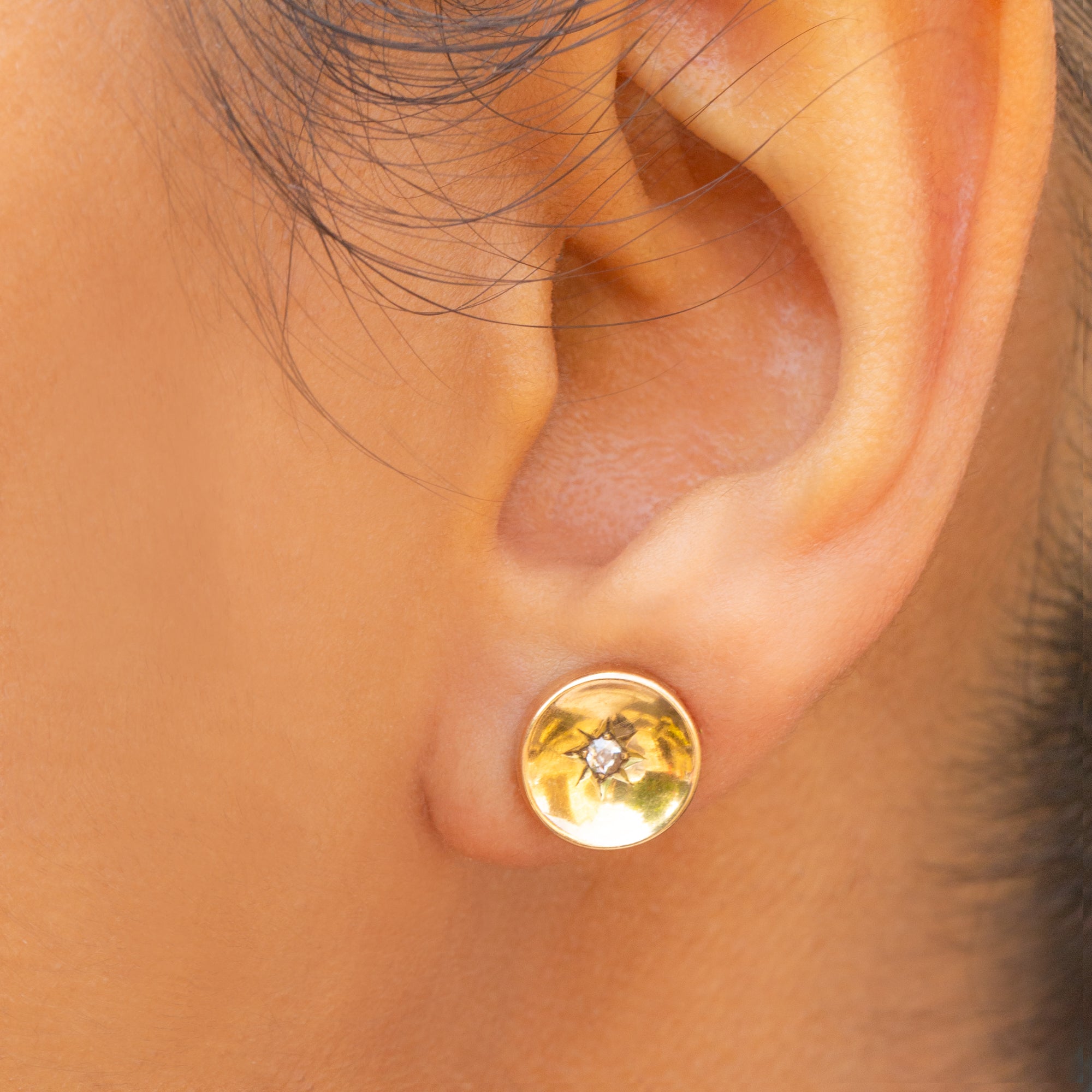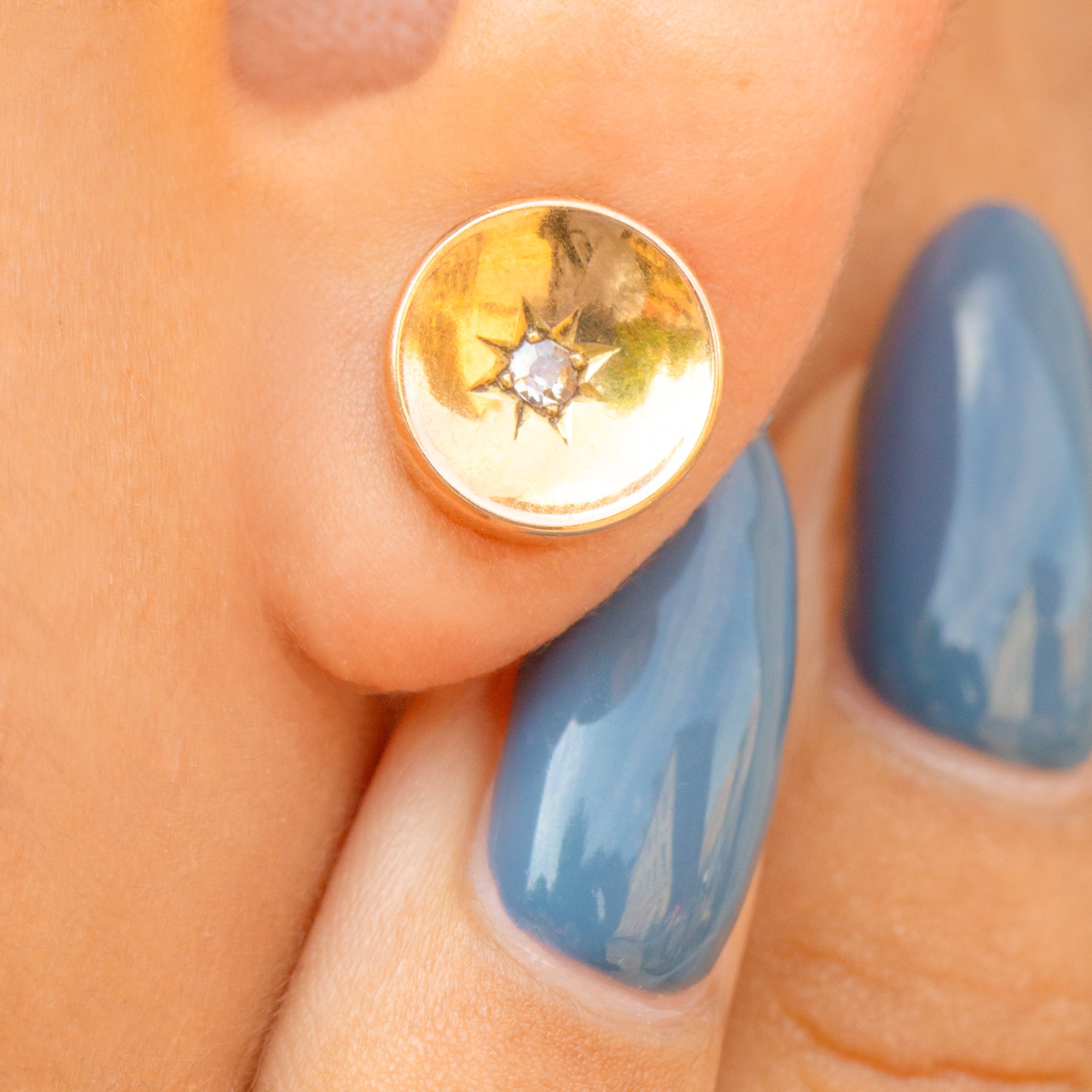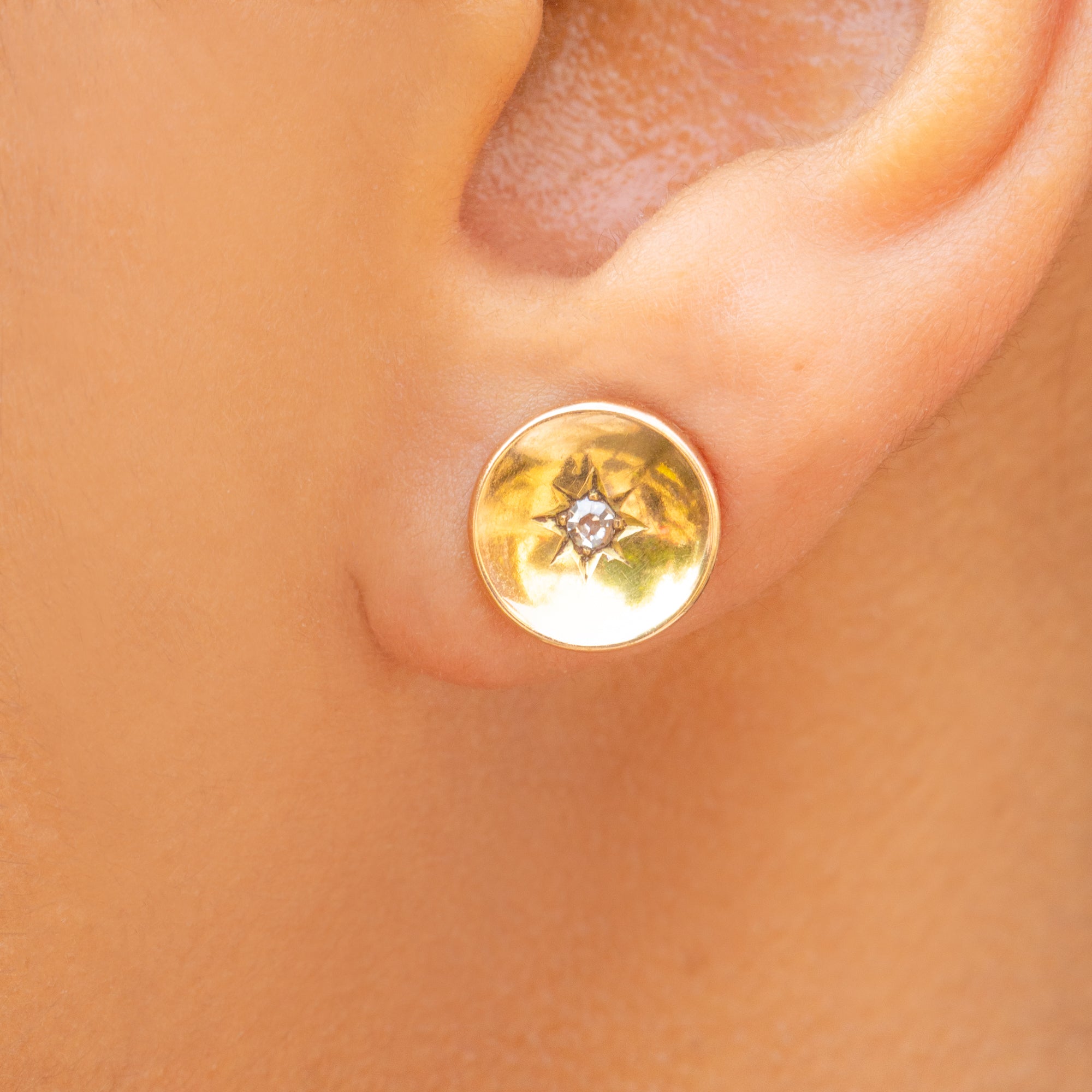 VERY GOOD. These antique 15ct Gold Diamond star set stud earrings are offered in very good condition. The Diamonds are sparkly and securely set within their setting. The 15ct Gold is buttery with only minor signs of wear, commensurate with age, but this does not impact its buttery glow. There is some wear on the back of the earrings which is not visible while the earrings are worn. The butterfly backs provide you with a secure and smooth closure, allowing you to wear these celestial beauties with absolute confidence. With proper care, these star-set stud earrings will last for generations to come!