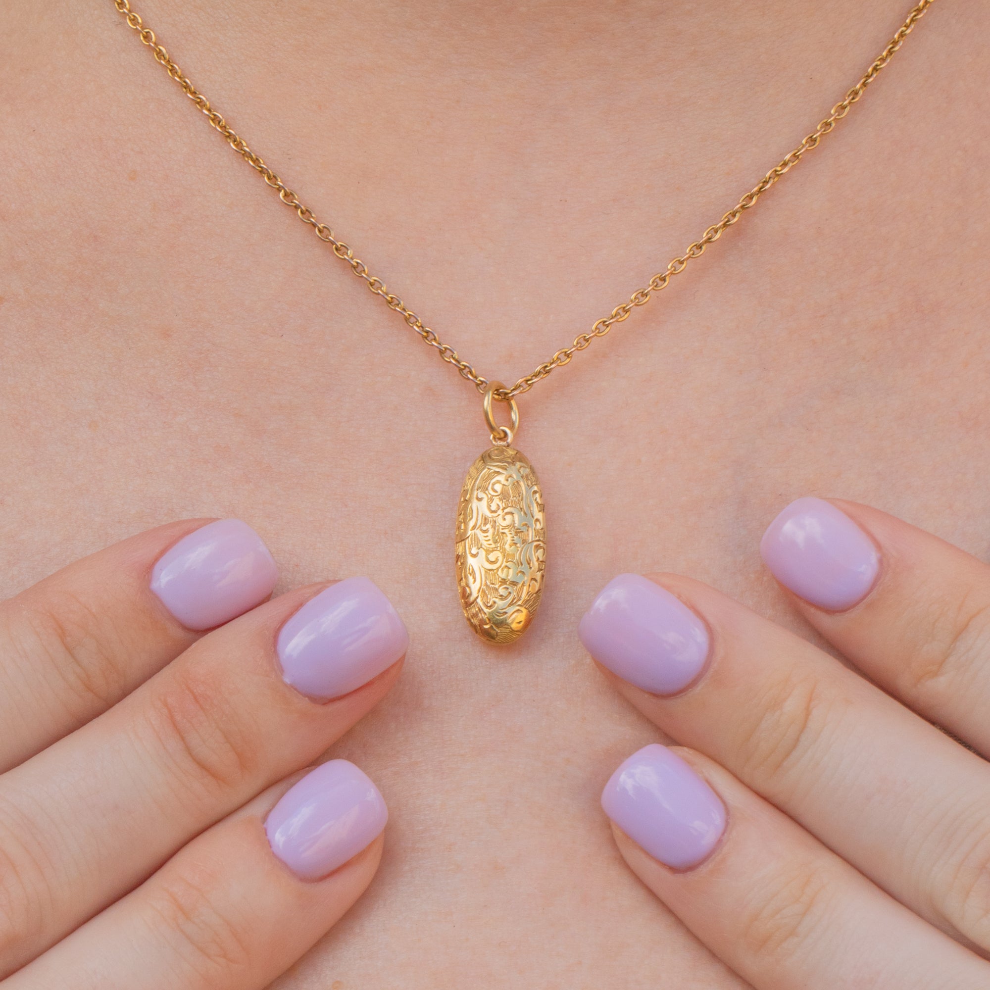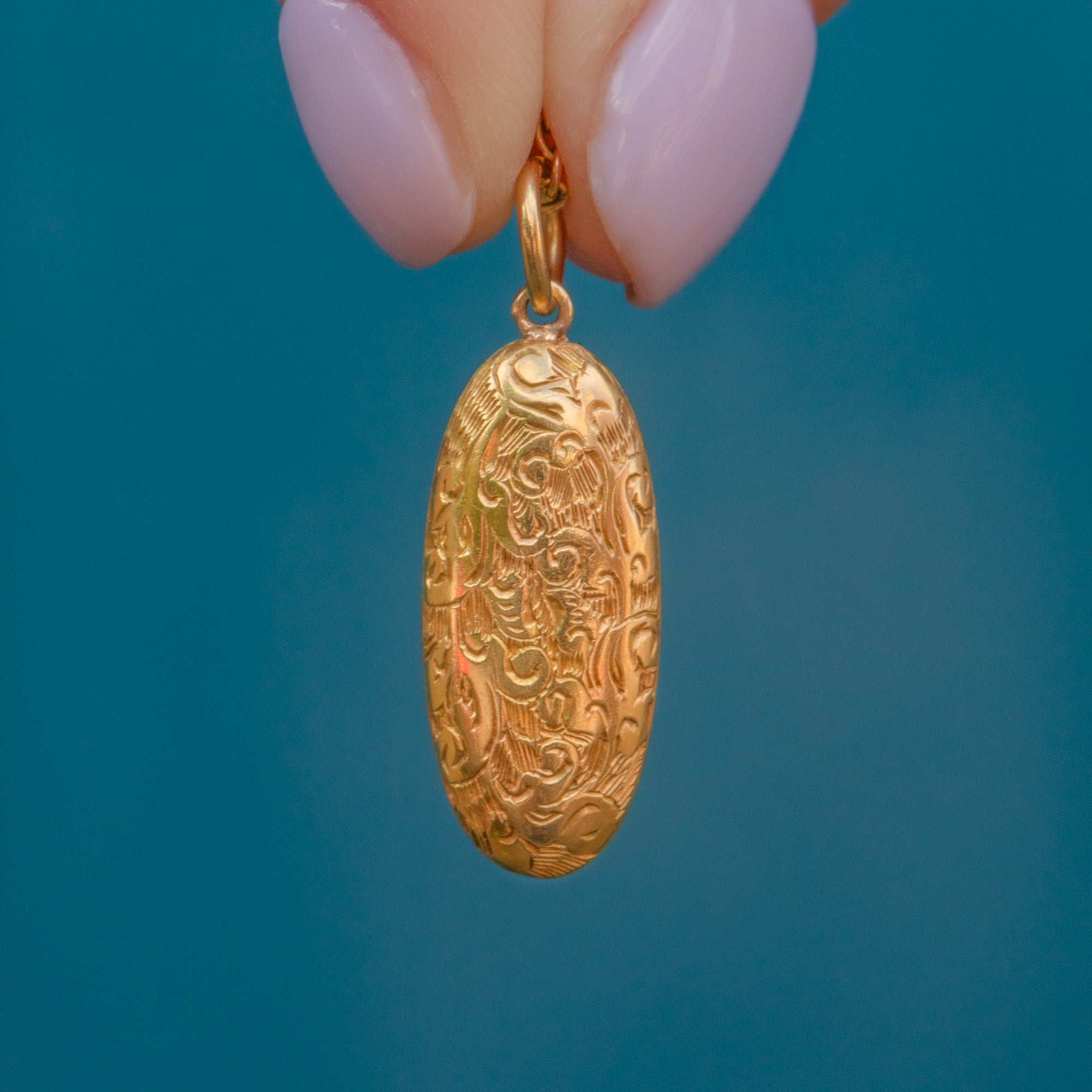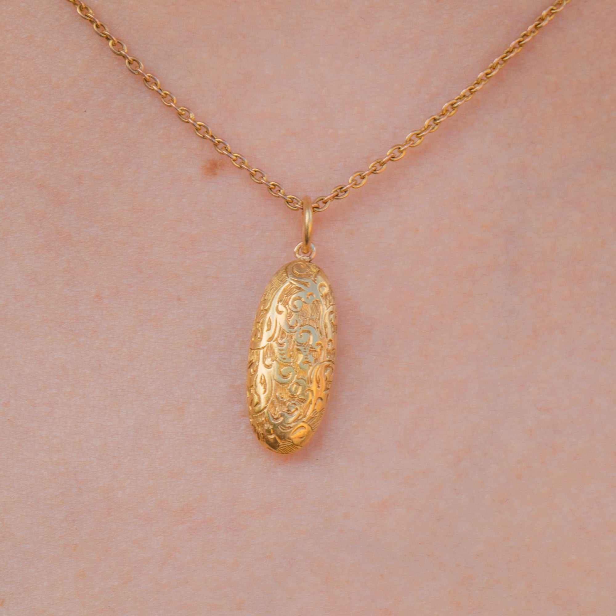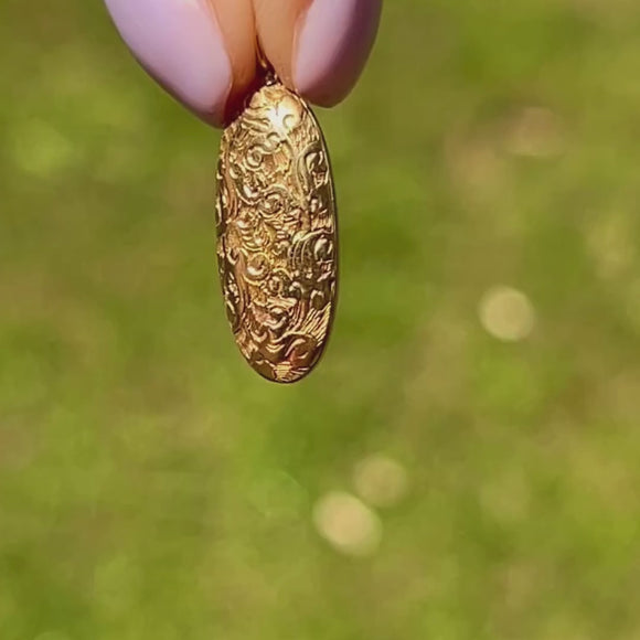 The front of this Edwardian pendant is inlaid with acanthus leaf engravings, a motif often used within antique jewellery. Crafted entirely from buttery 15ct Gold, the light shines across her glossy surface!