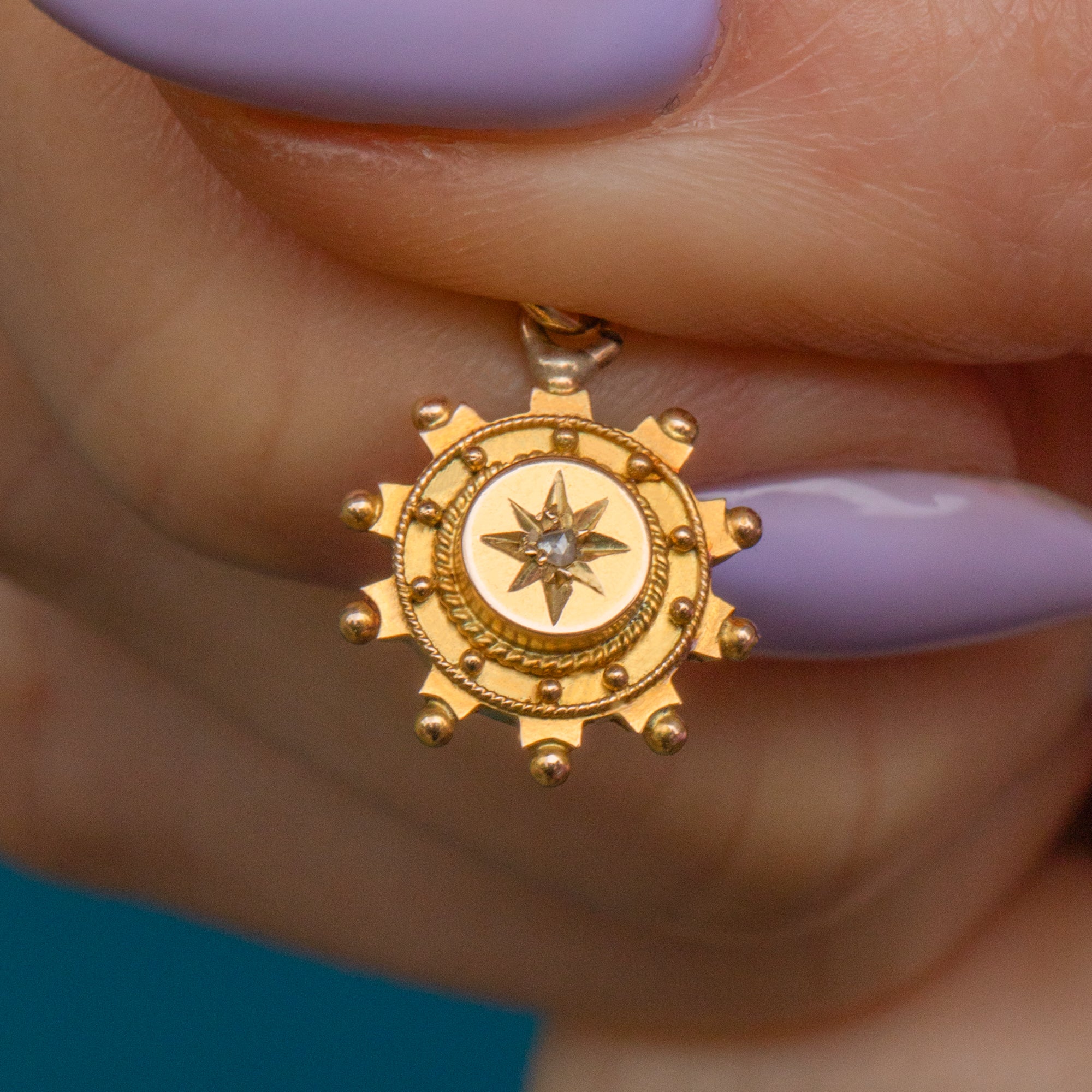 This antique 15ct Gold Etruscan round Diamond charm will throw some undeniable antique character into your repertoire! Fine rope borders, beaded detailing and star settings are what make this antique charm the epitome of Etruscan revival, crafted entirely from buttery 15ct Gold.