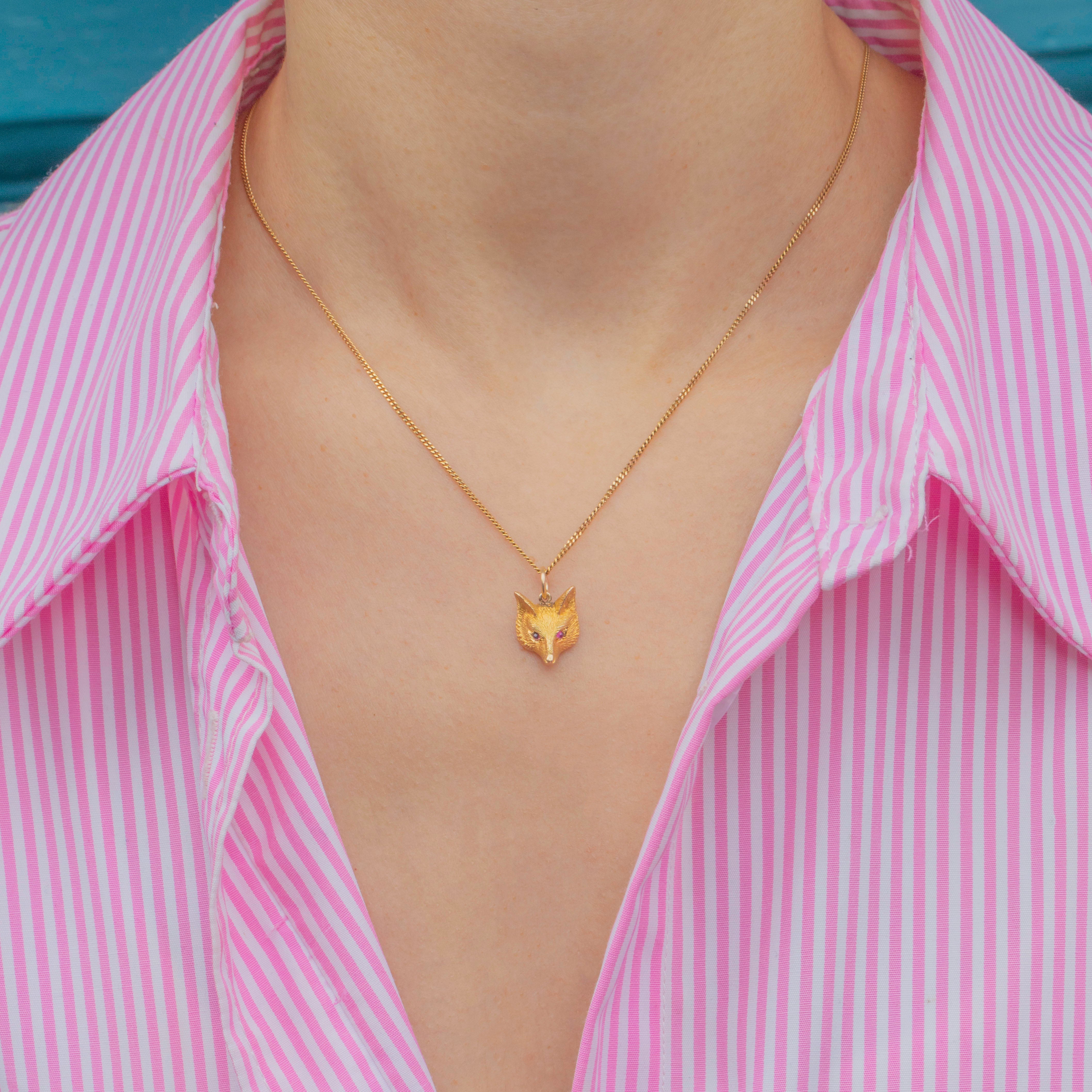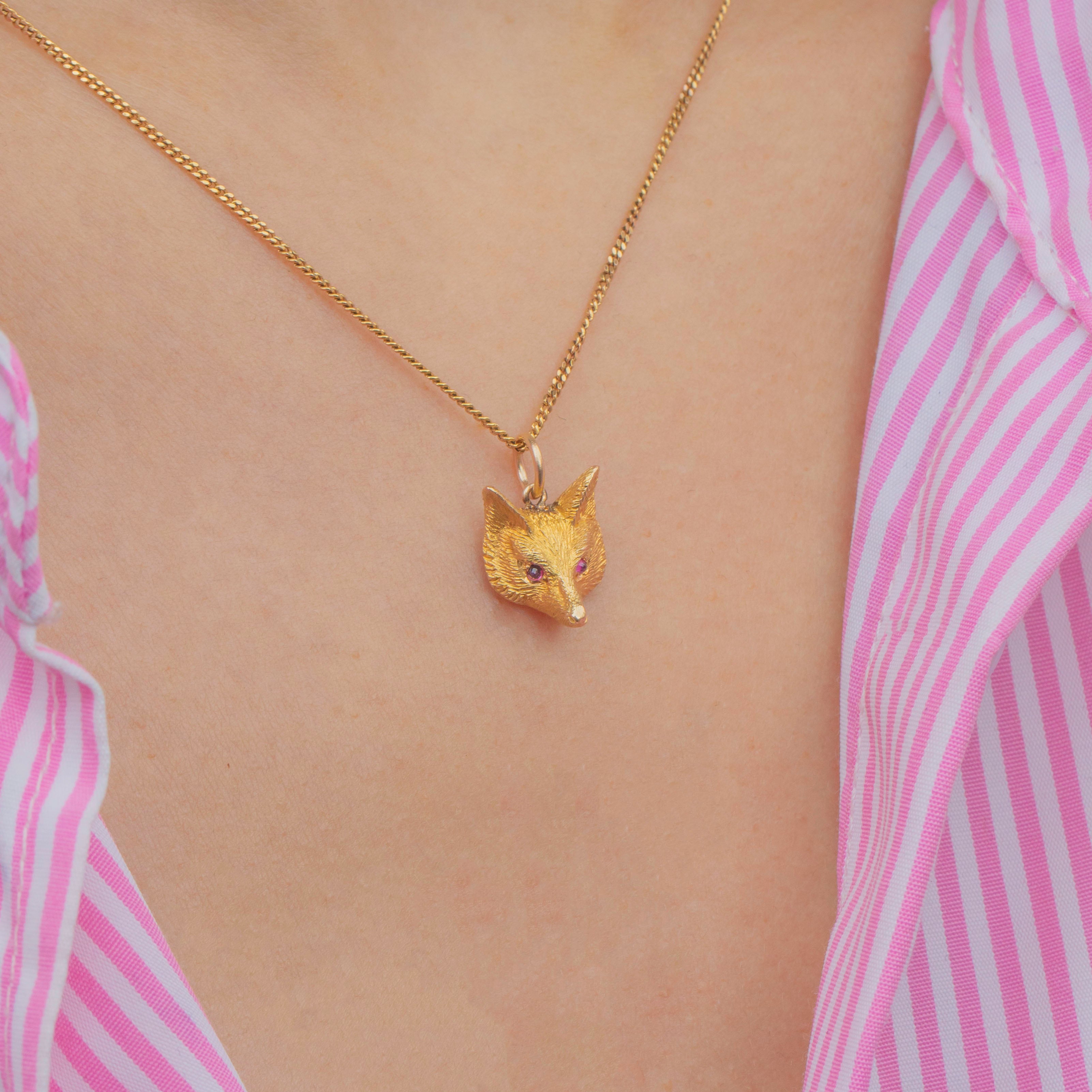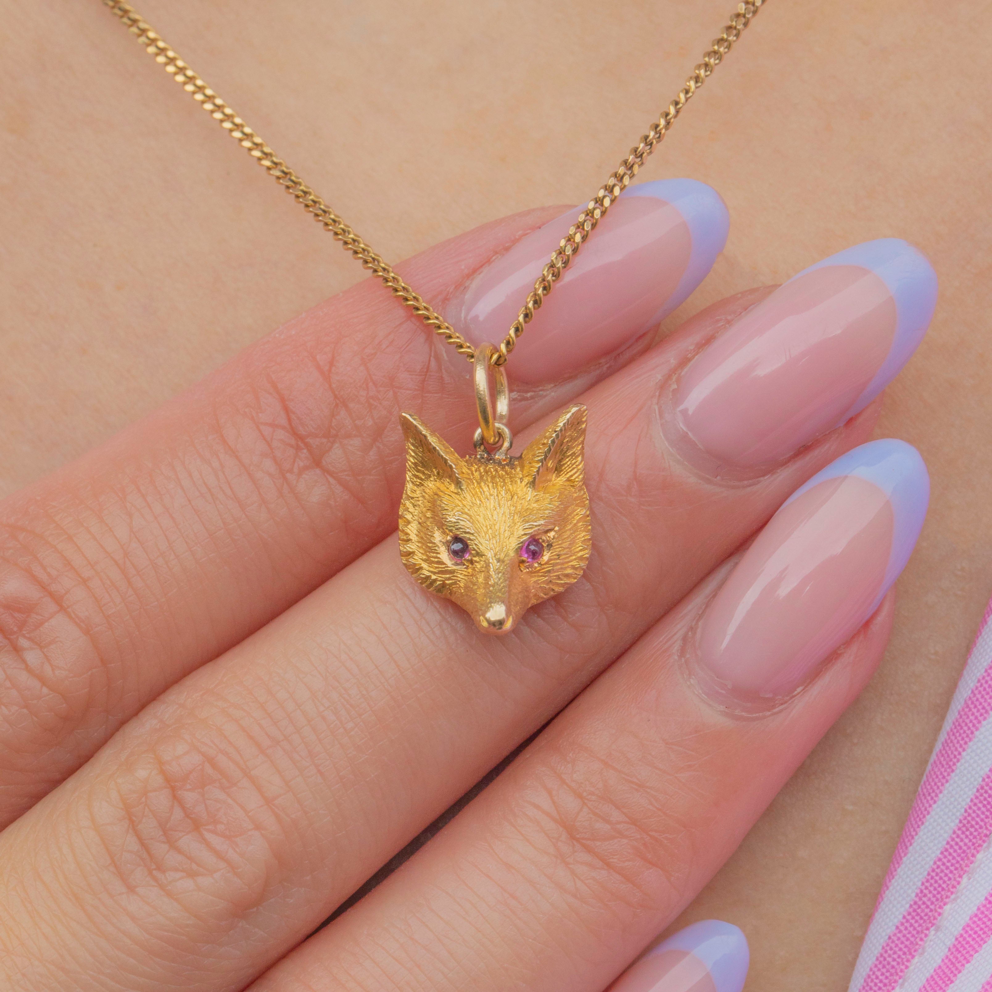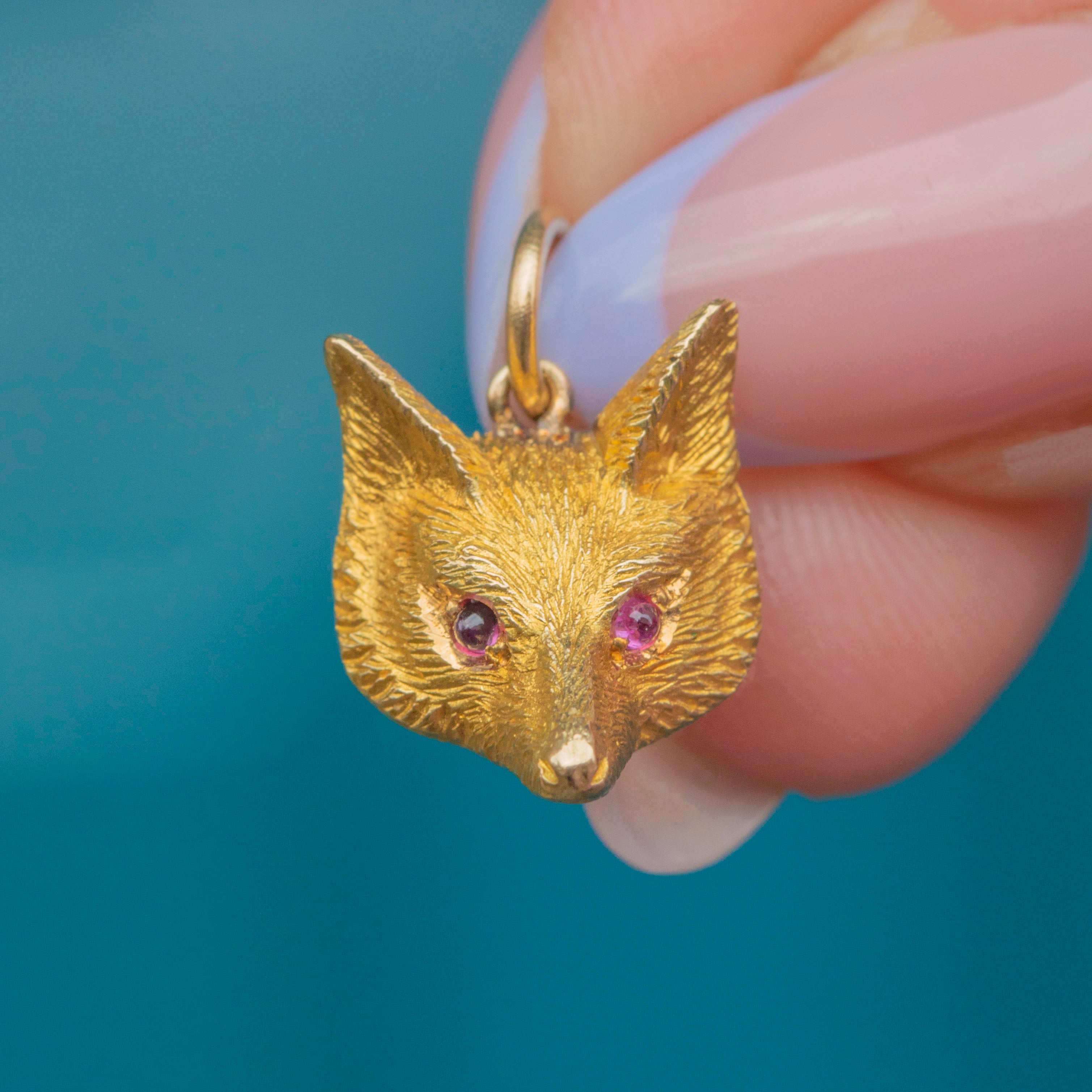 Bursting with character, this antique 15ct Gold fox head charm will add a playful accent to your necklace stack! The fox's head is beautifully detailed with finely engraved features, and two dazzling Ruby eyes that twinkle mischievously in the light.