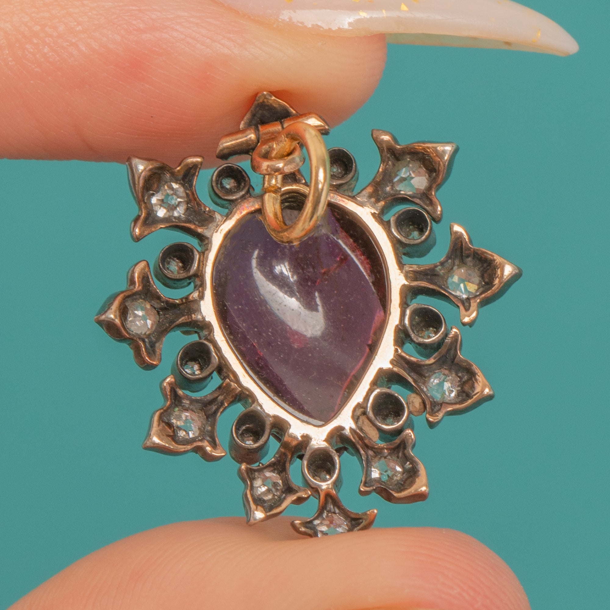 A sumptuous Victorian heart pendant set with a richly hued Garnet cabochon, encircled by a sparkling Diamond cluster. The gem’s glossy dome is framed by delicately set tiny round Diamonds for a beautiful play of light and texture, creating a romantic, starry halo around the vivid centre.