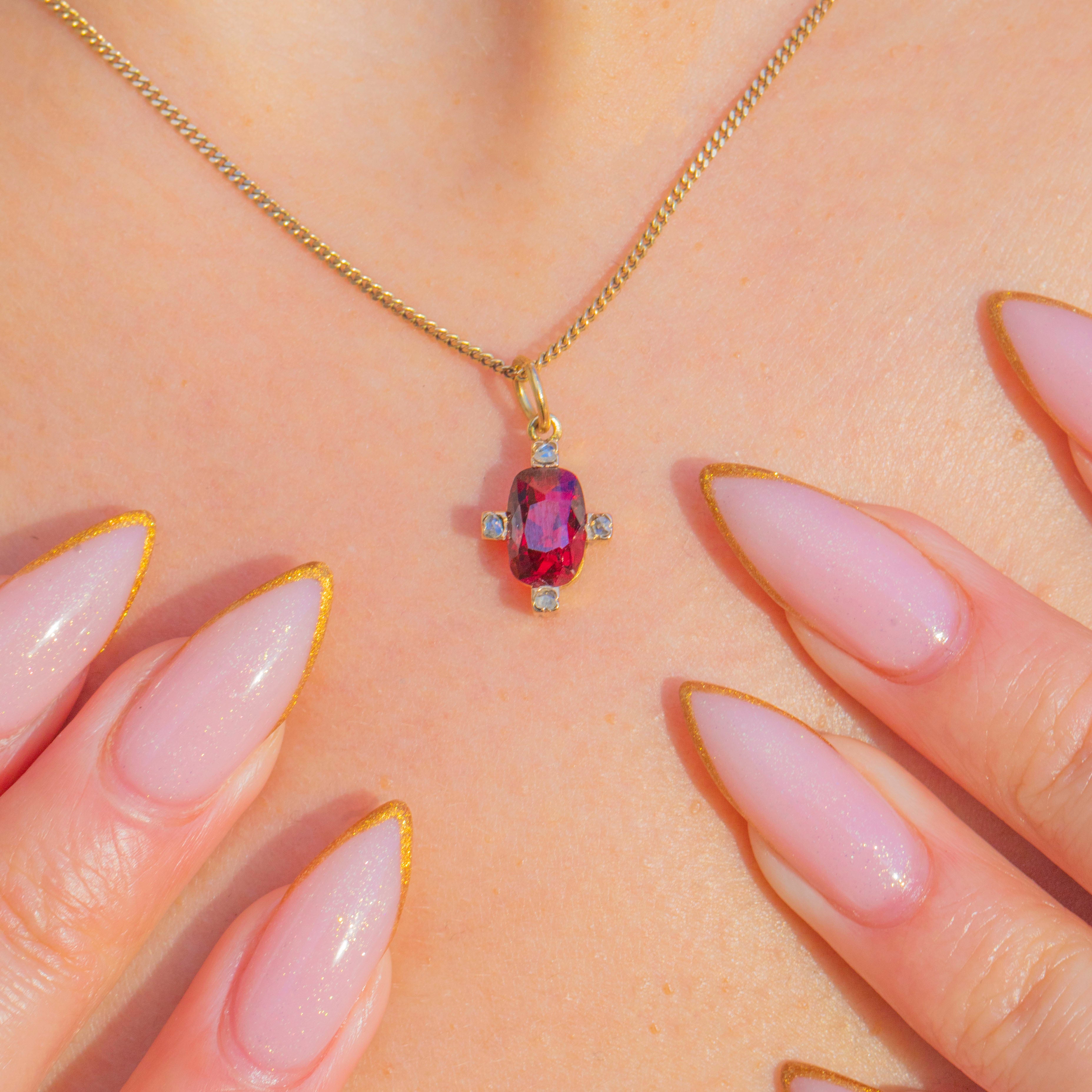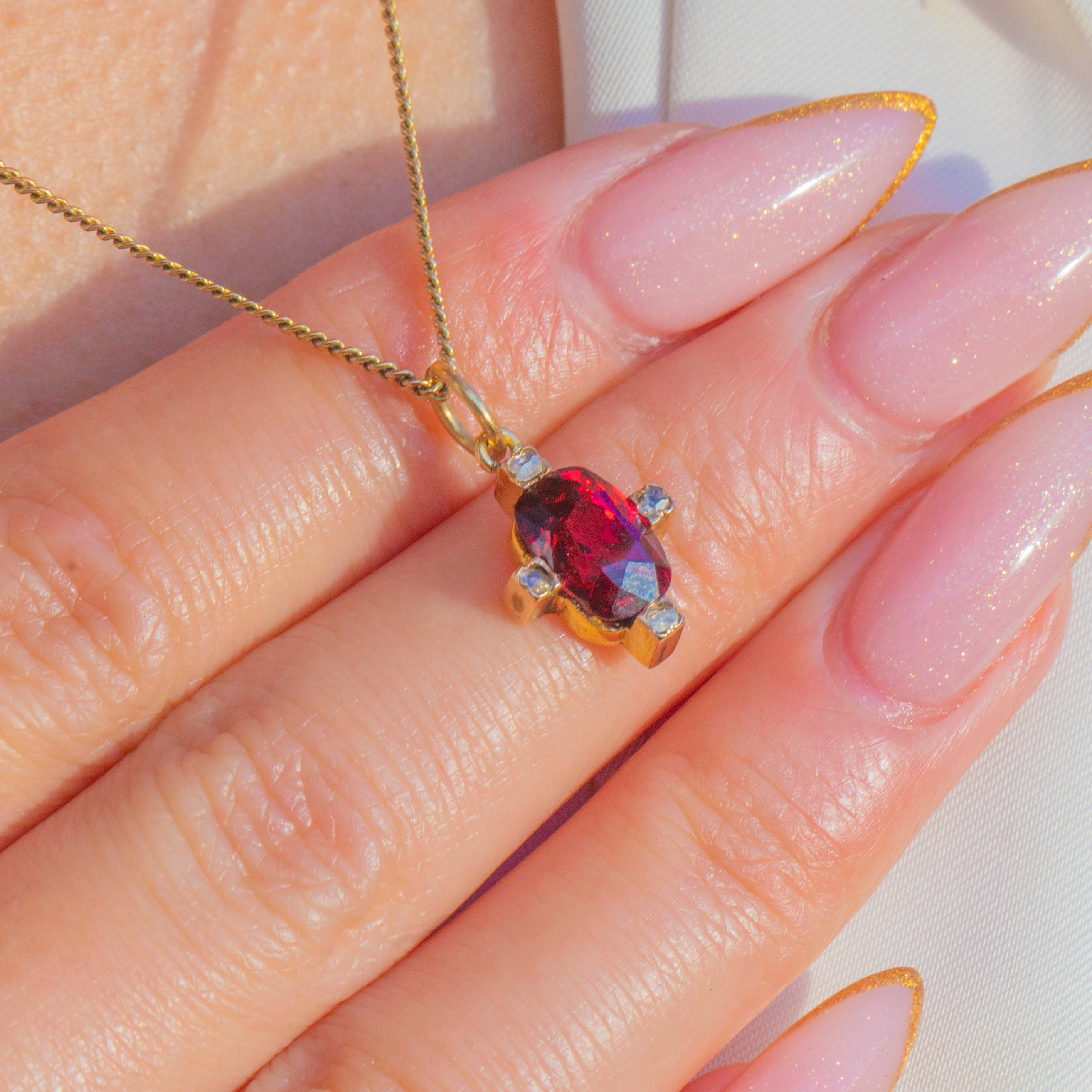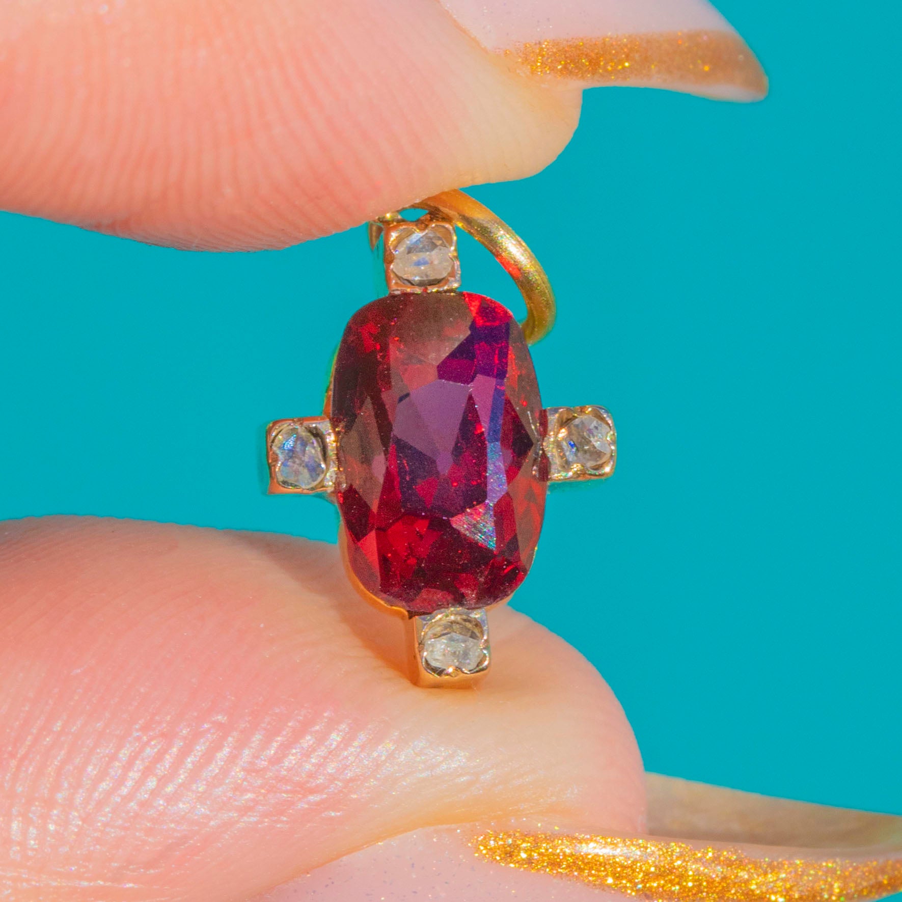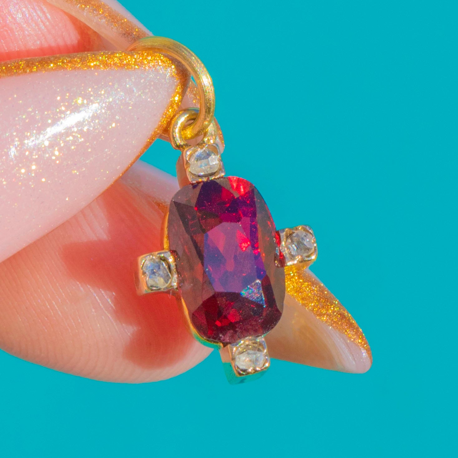 EXCELLENT: The Garnet is bright with minimal surface wear, and the Diamonds are lively with no chips or abrasions noted. The Gold setting is strong and well-preserved with only light antique patina. A beautifully kept Victorian charm.