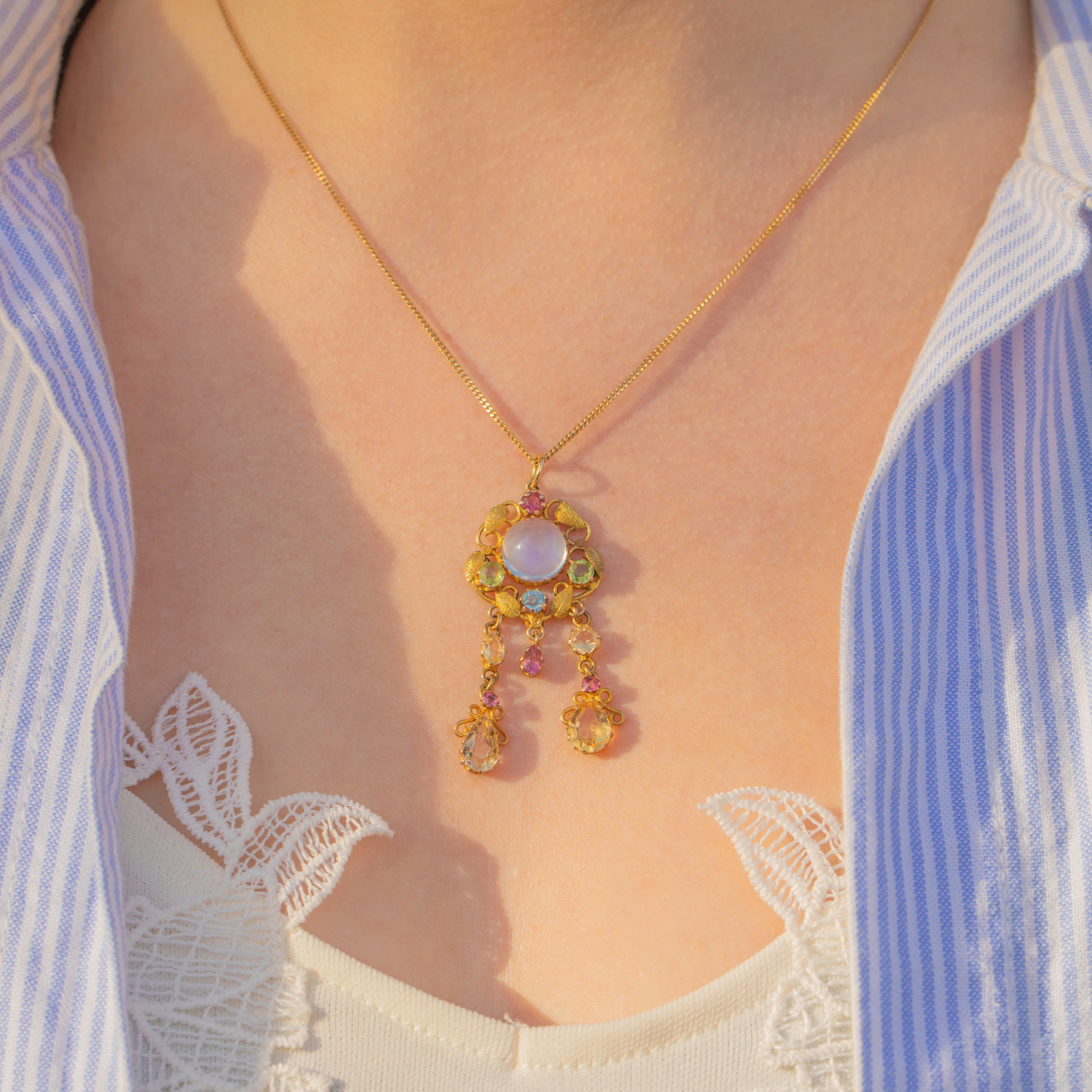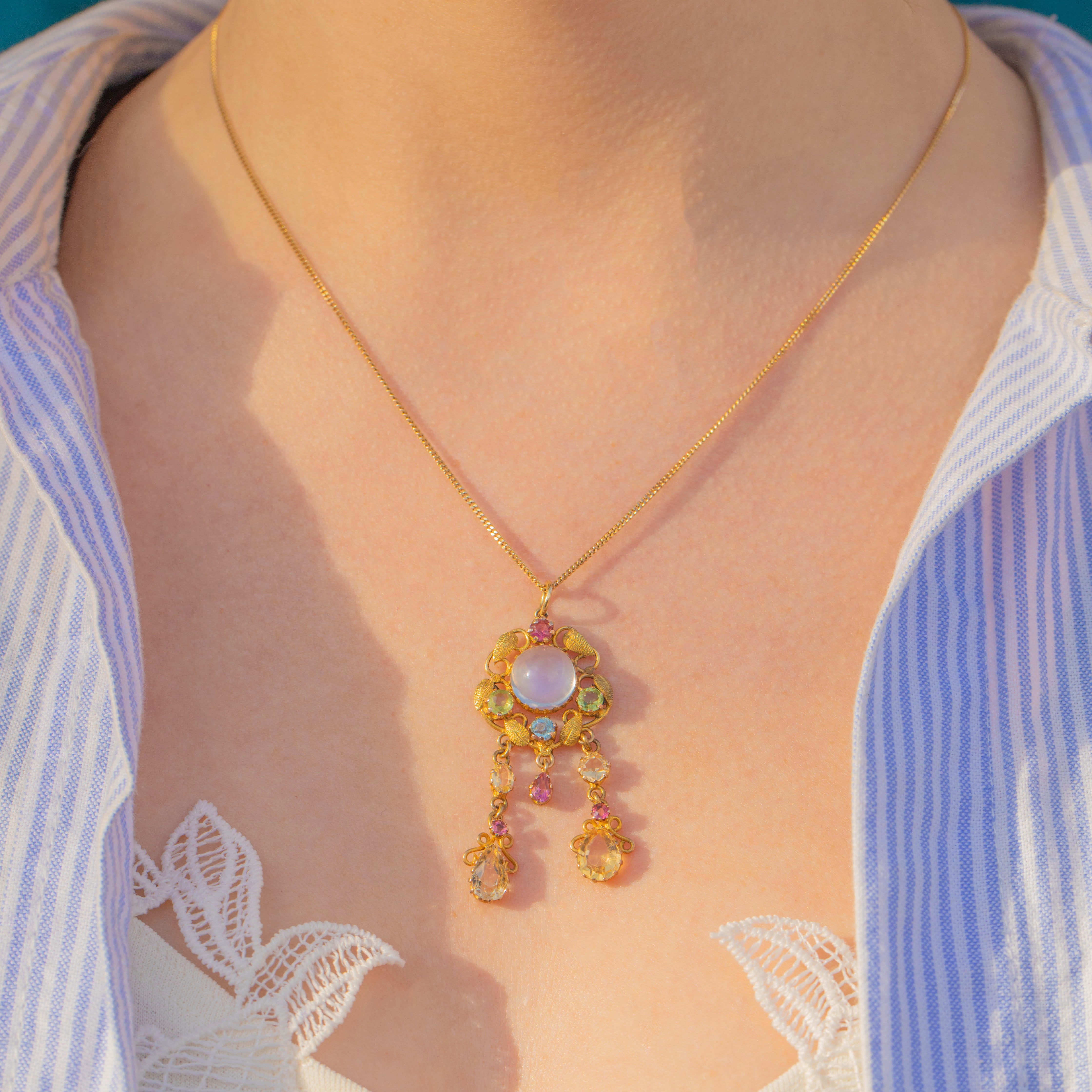 Antique 15ct Gold Moonstone Drop Pendant with Pink Tourmaline & Topaz