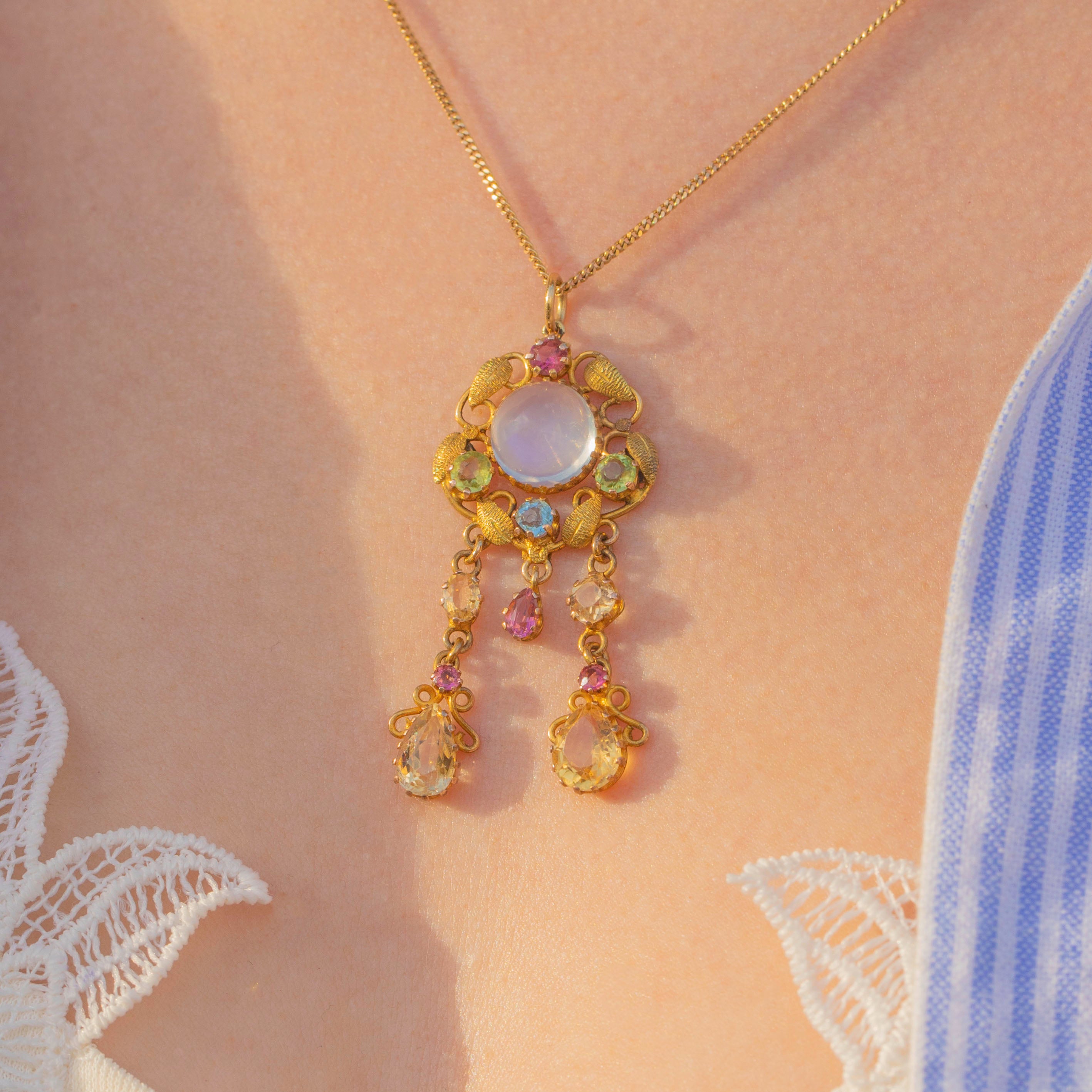 We adore this stunning Victorian 15ct Gold Moonstone, Pink Tourmaline and Topaz pendant!