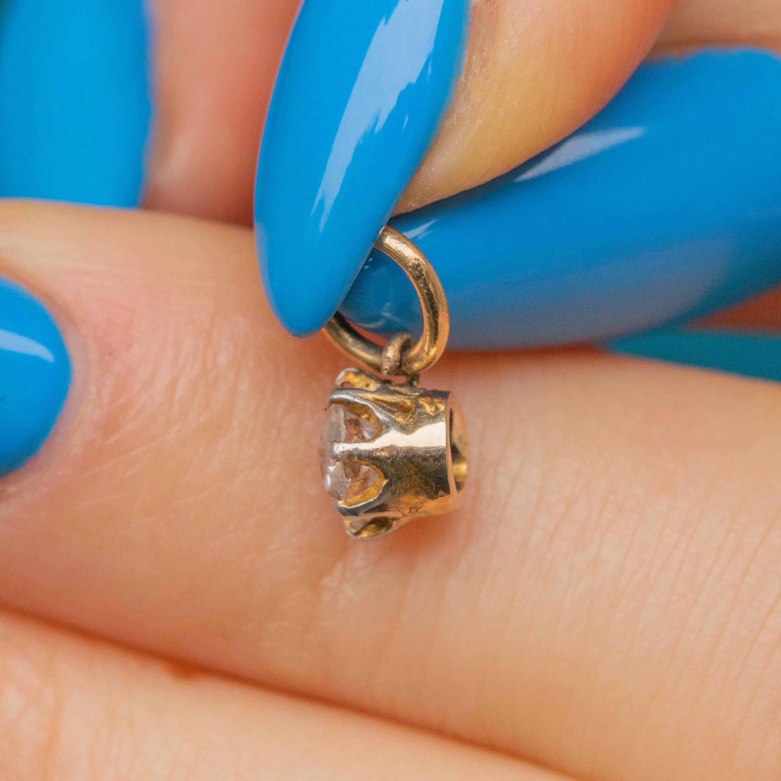 VERY GOOD-EXCELLENT. This antique 15ct Gold old-mine-cut Diamond charm is in wonderful condition. The Diamond is crisp and bright, securely held within its setting. The Diamond does have a small scuff on its surface, however, this is minuscule and only visible under the inspection of a loupe and doesn't affect the overall impact of the piece. The jump ring is soldered shut allowing for confident wear. A truly versatile and chic charm, you'll want to wear this pendant every day!