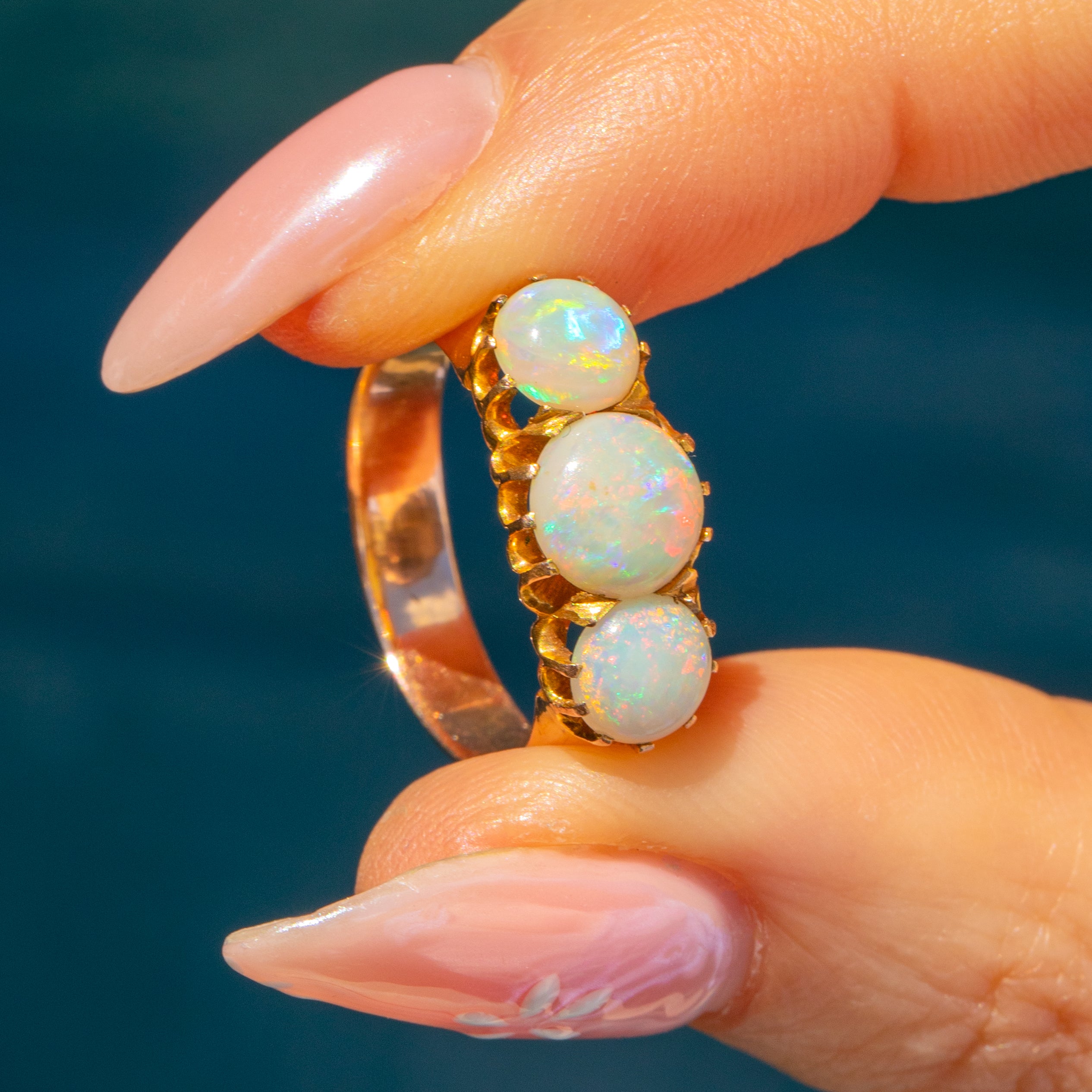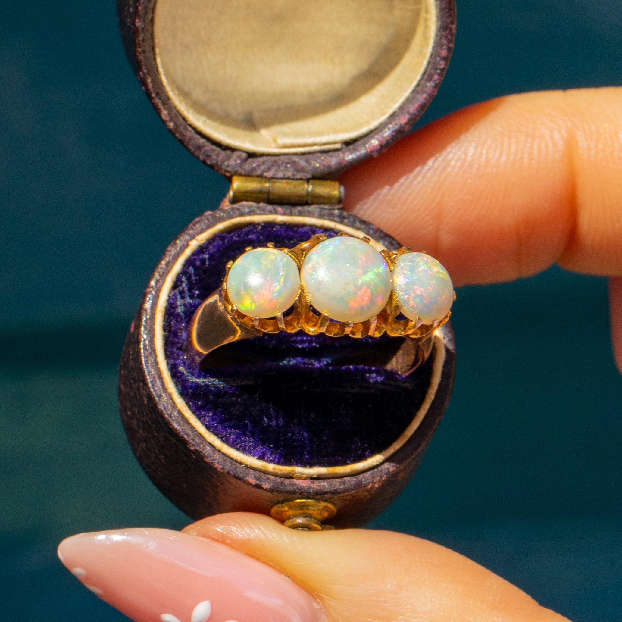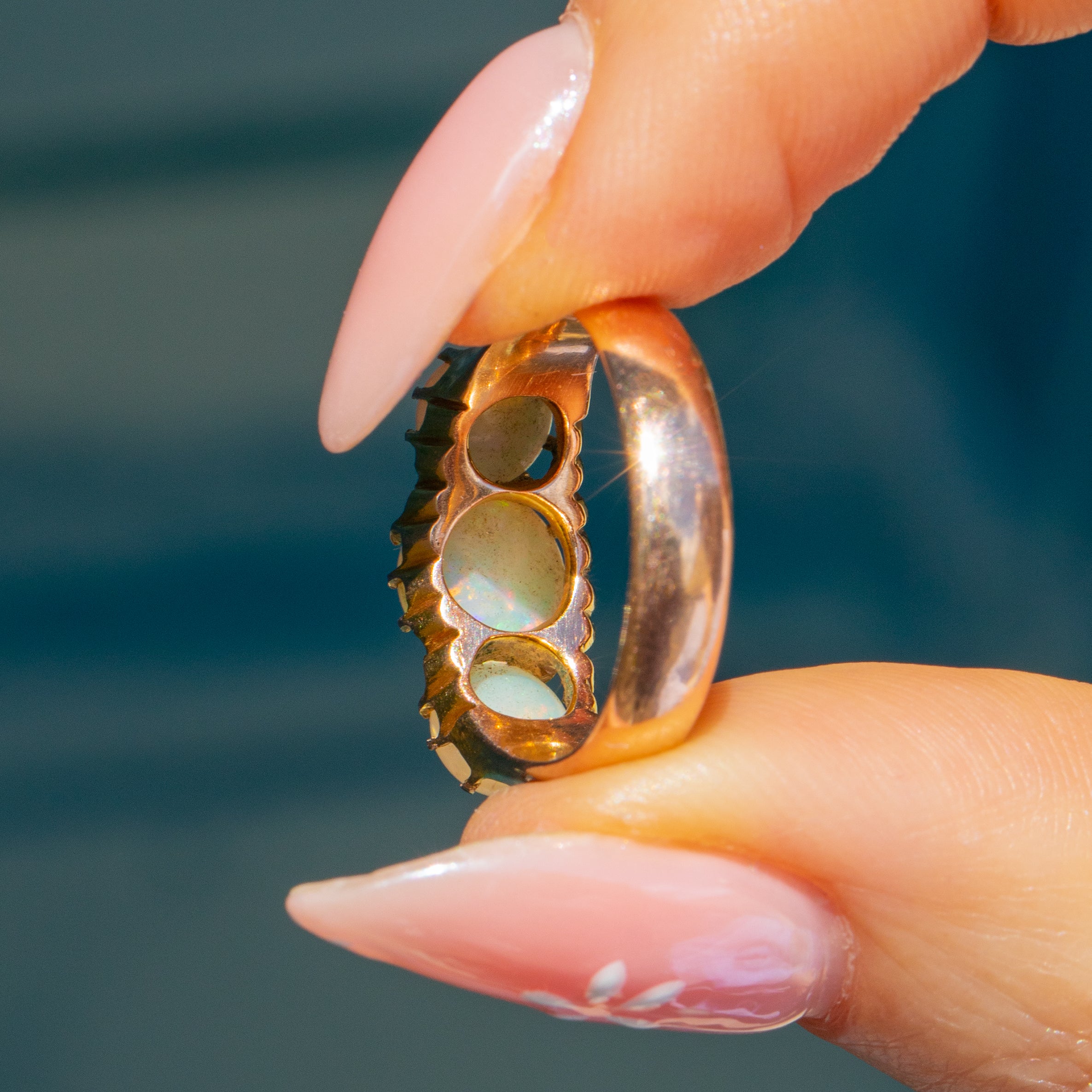EXCELLENT. This Victorian Opal trilogy ring is in great antique condition. The band is bright with very little signs of wear and the settings are all present and intact keeping the Opals securely held in place.  A wonderful piece of antique jewellery!