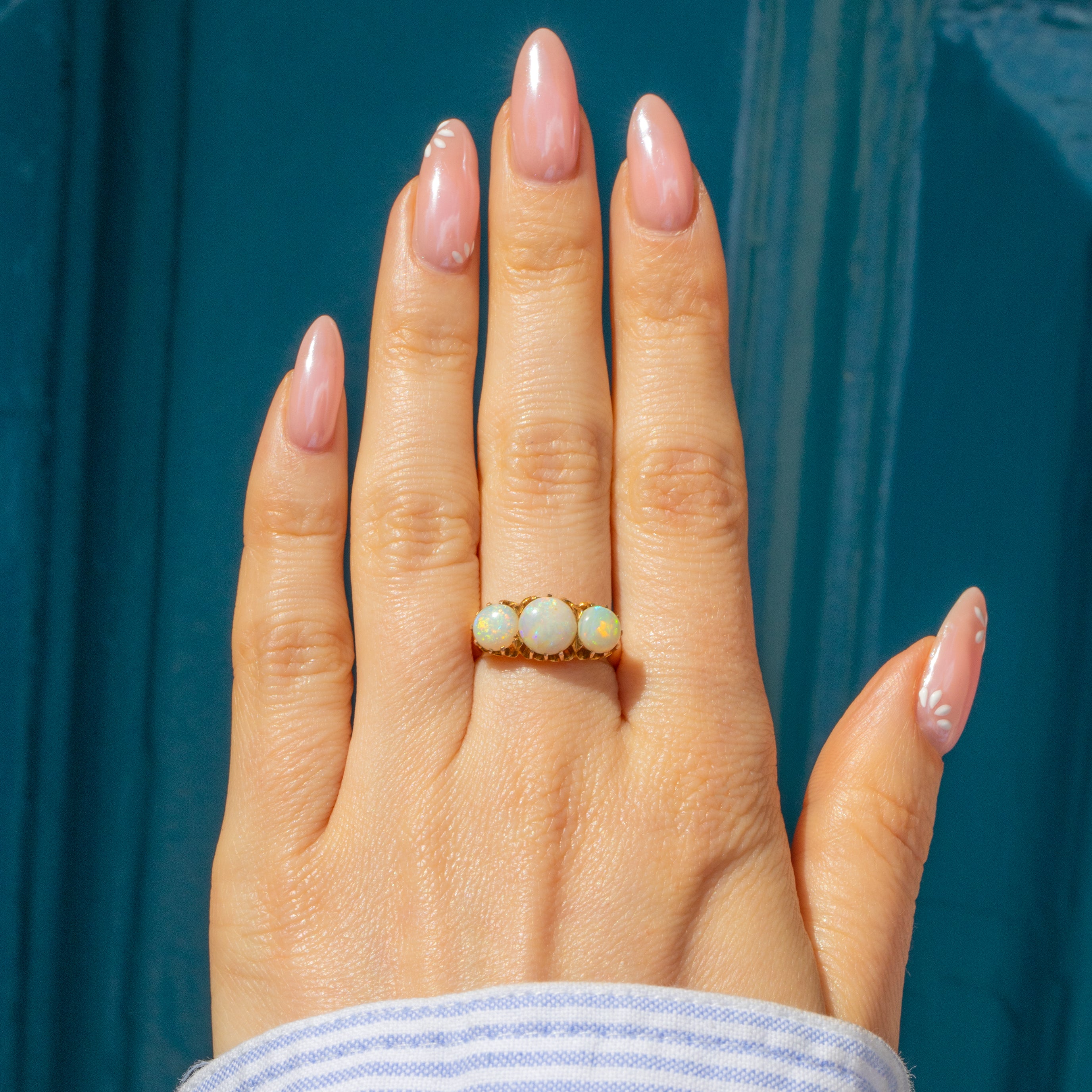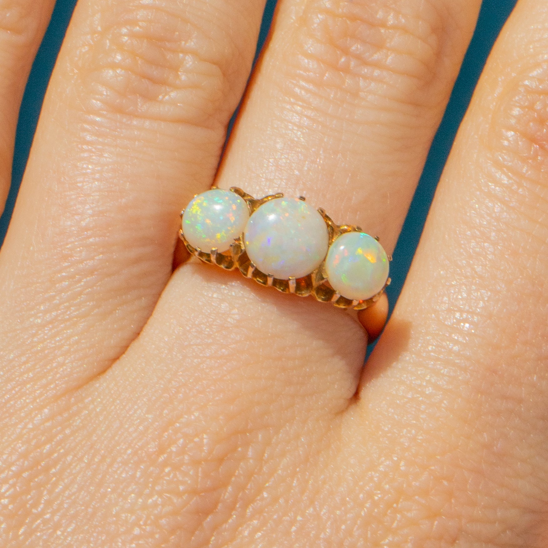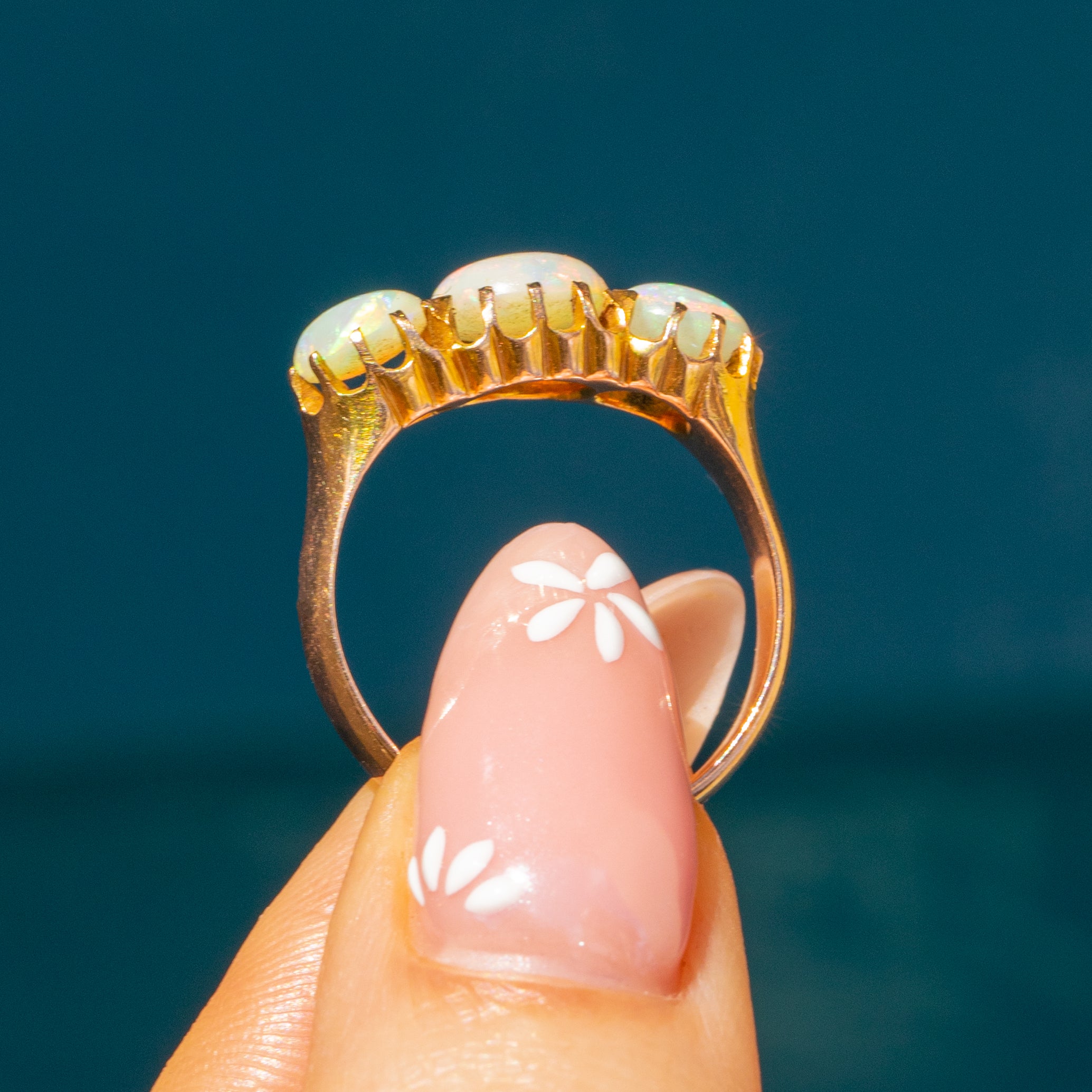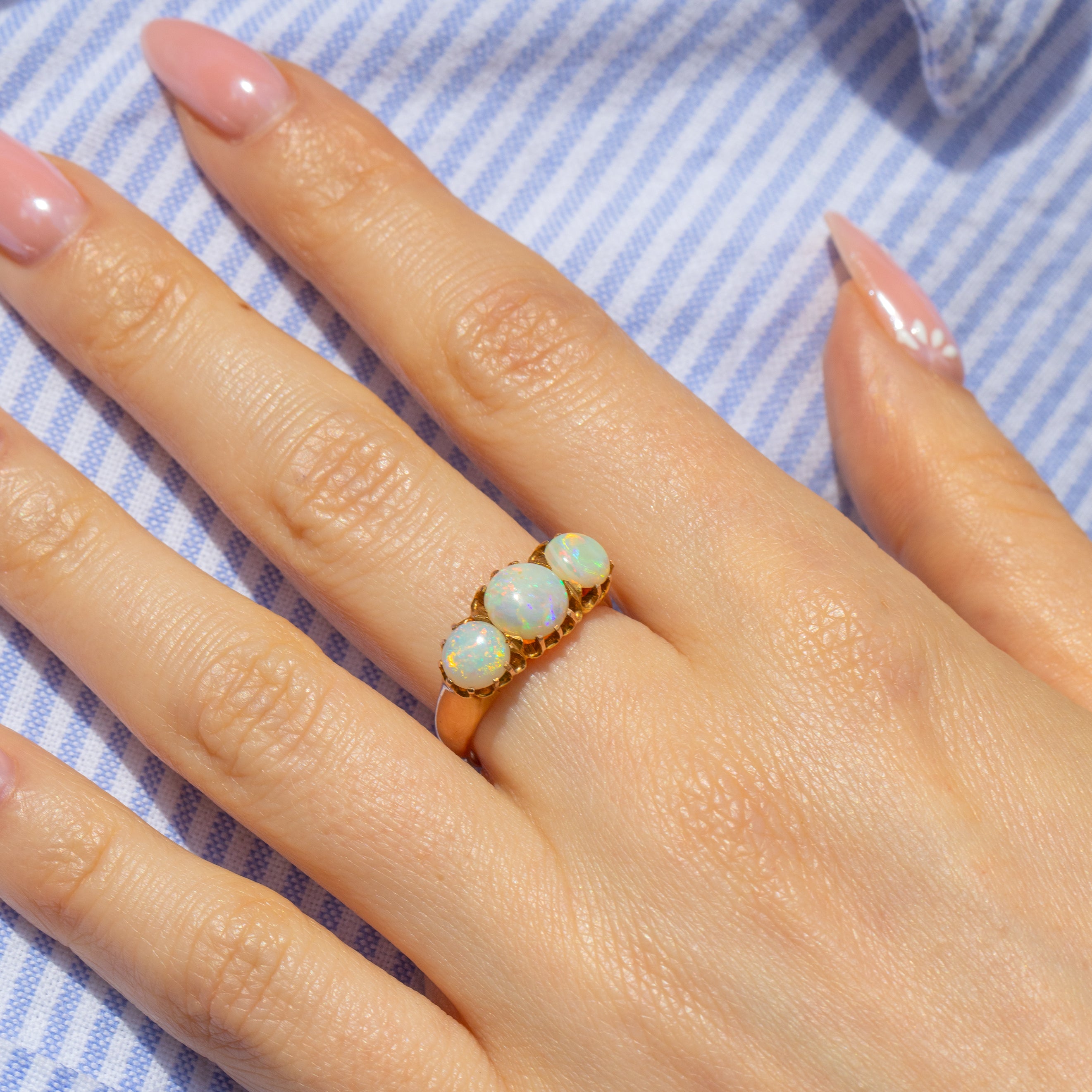 EXCELLENT. This Victorian Opal trilogy ring is in great antique condition. The band is bright with very little signs of wear and the settings are all present and intact keeping the Opals securely held in place.  A wonderful piece of antique jewellery!