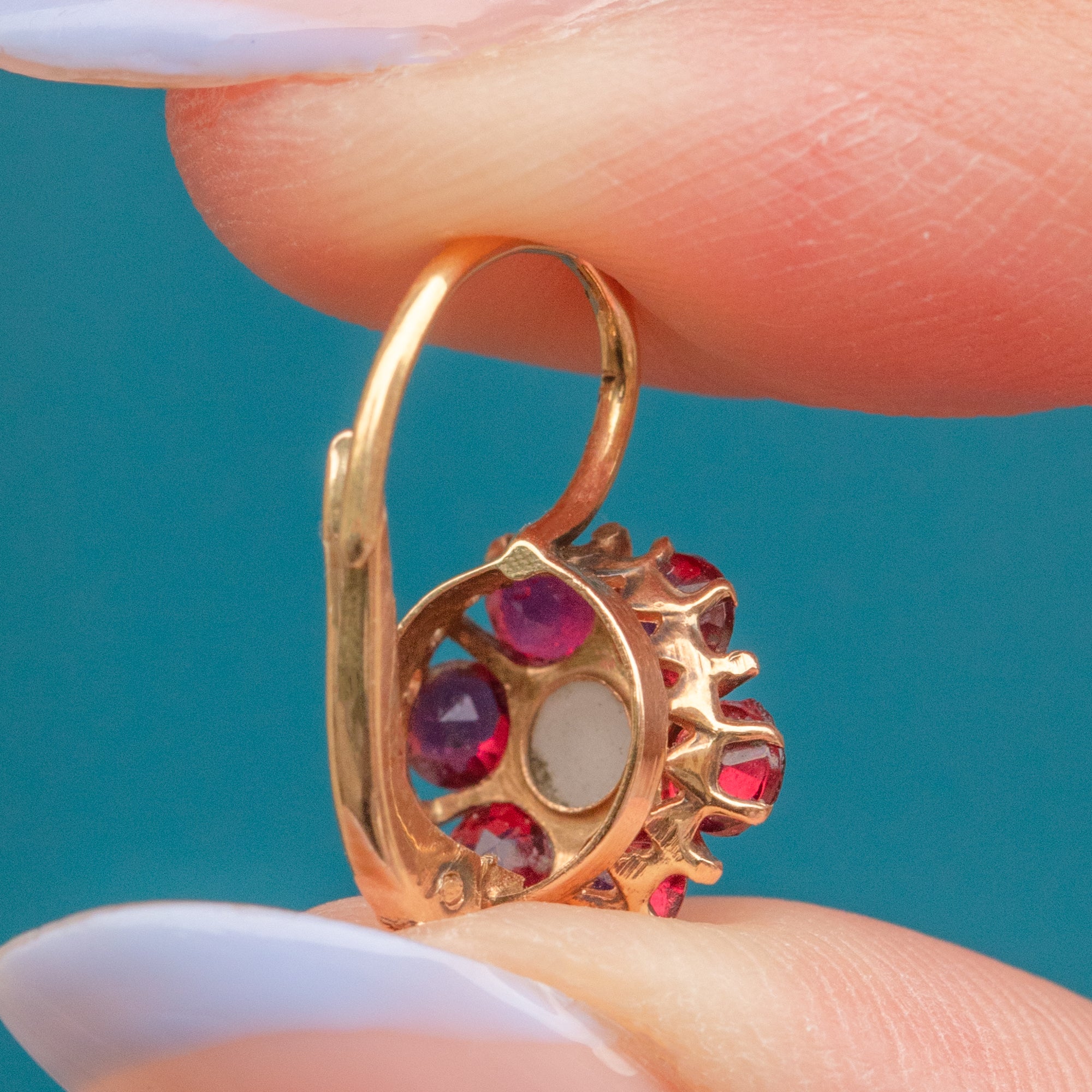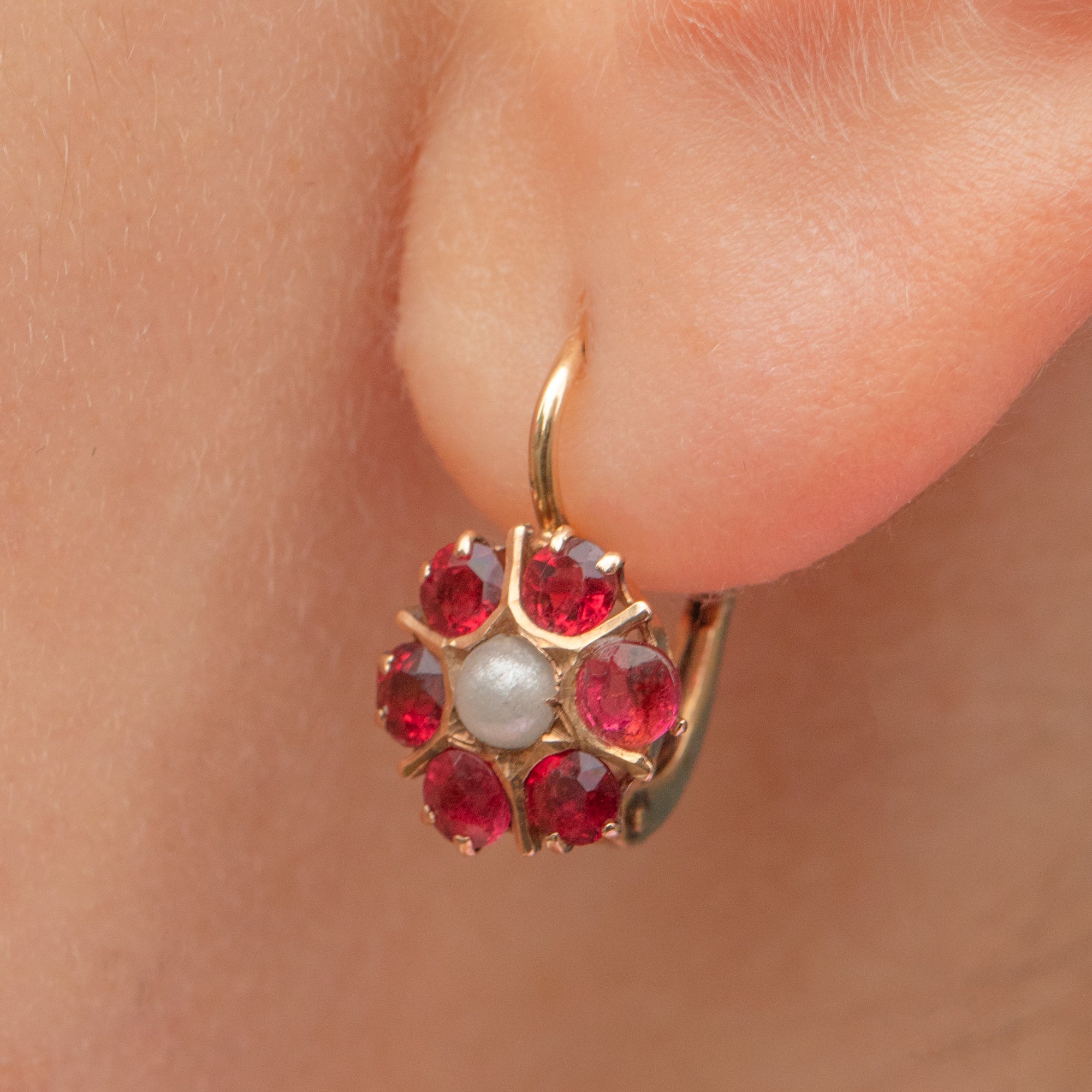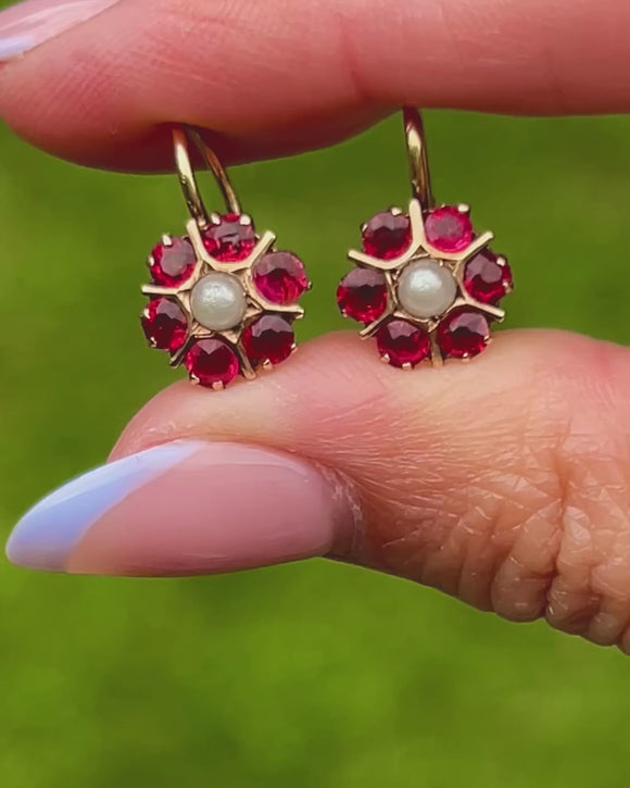 VERY GOOD-EXCELLENT: These antique 15ct Gold Paste Pearl lever back earrings are in great condition! Each gemstone is set securely and the earrings have been crafted meticulously. There is some light surface wear to the 9ct Gold, though this is expected with age. With secure lever backs, these Austro-Hungarian floral earrings can be worn with confidence.