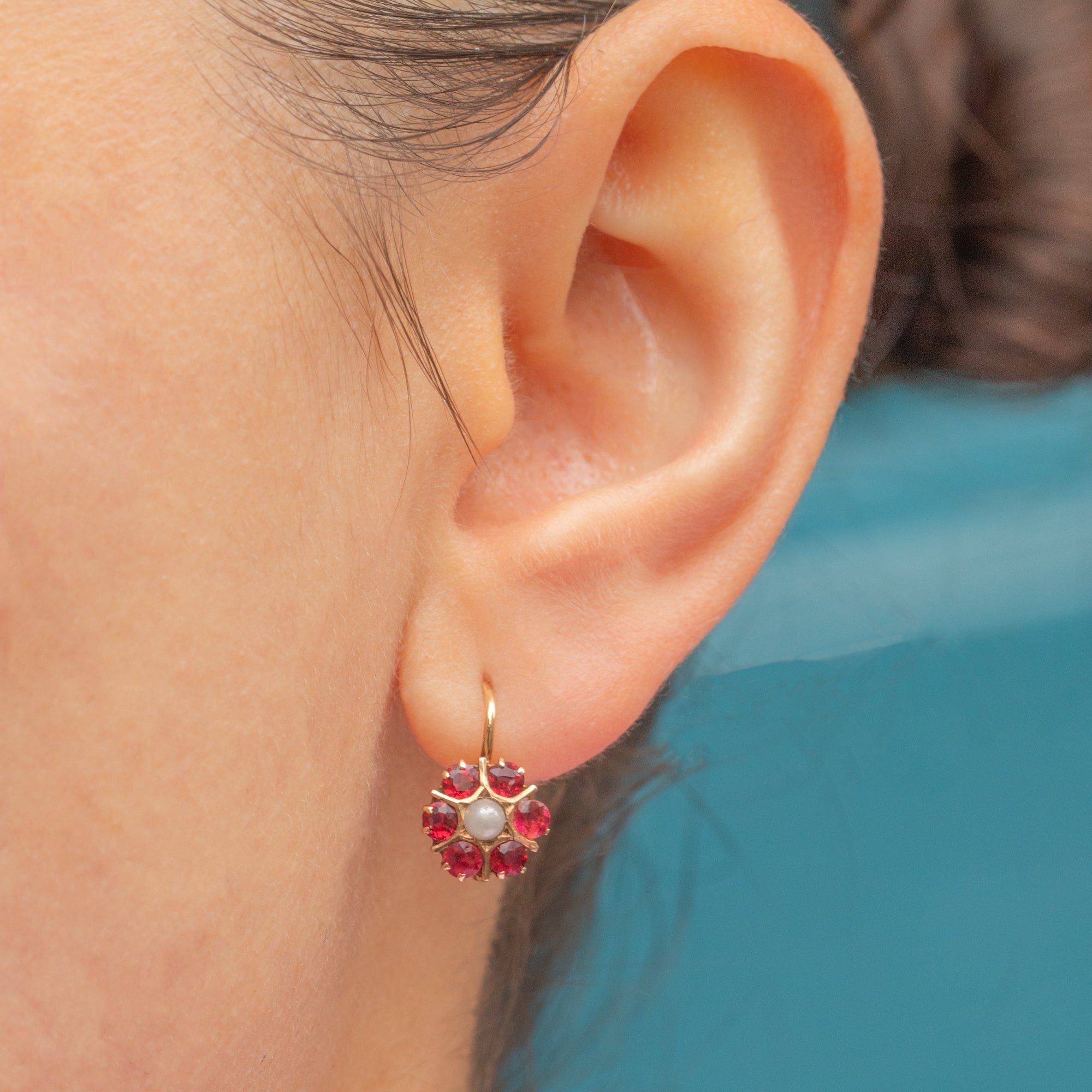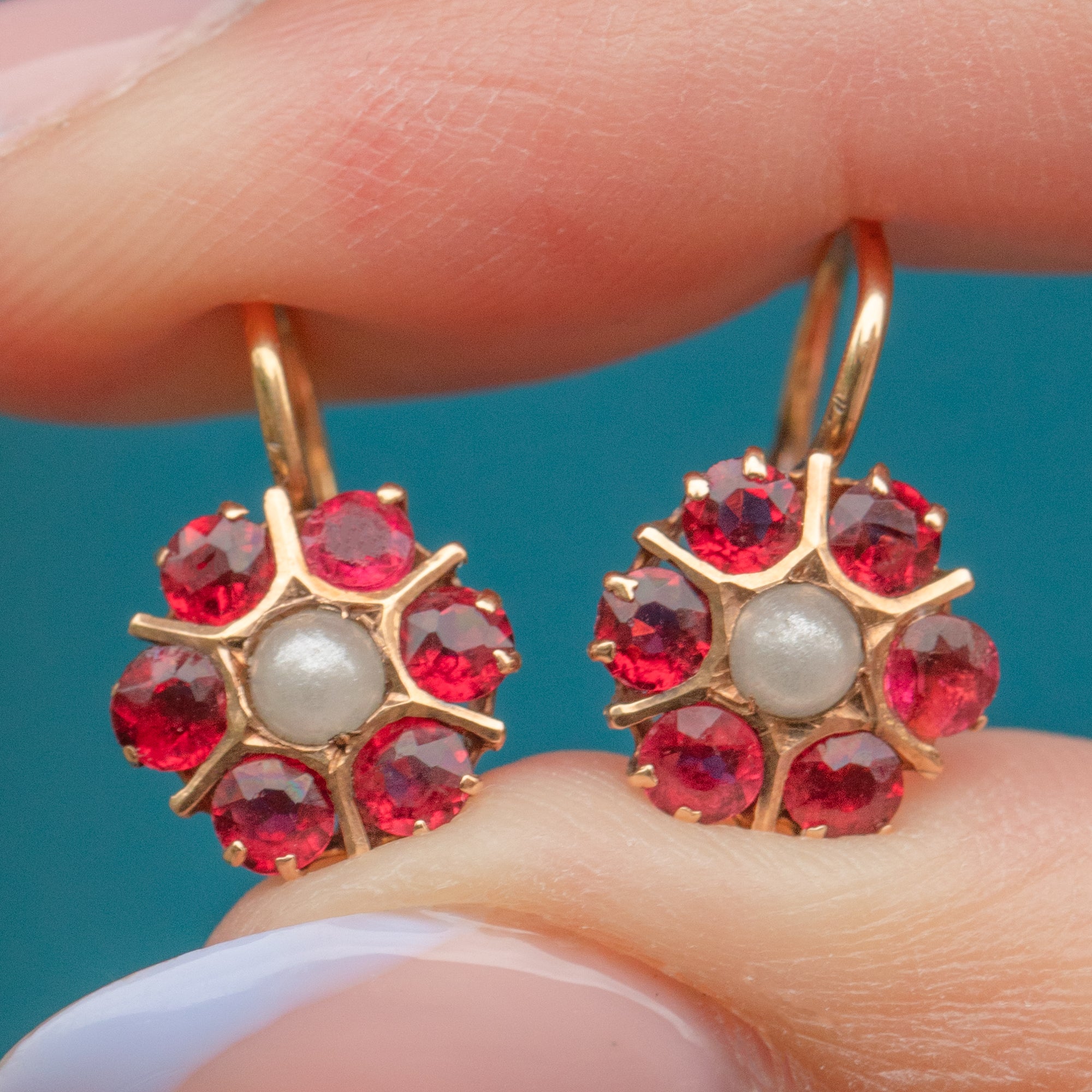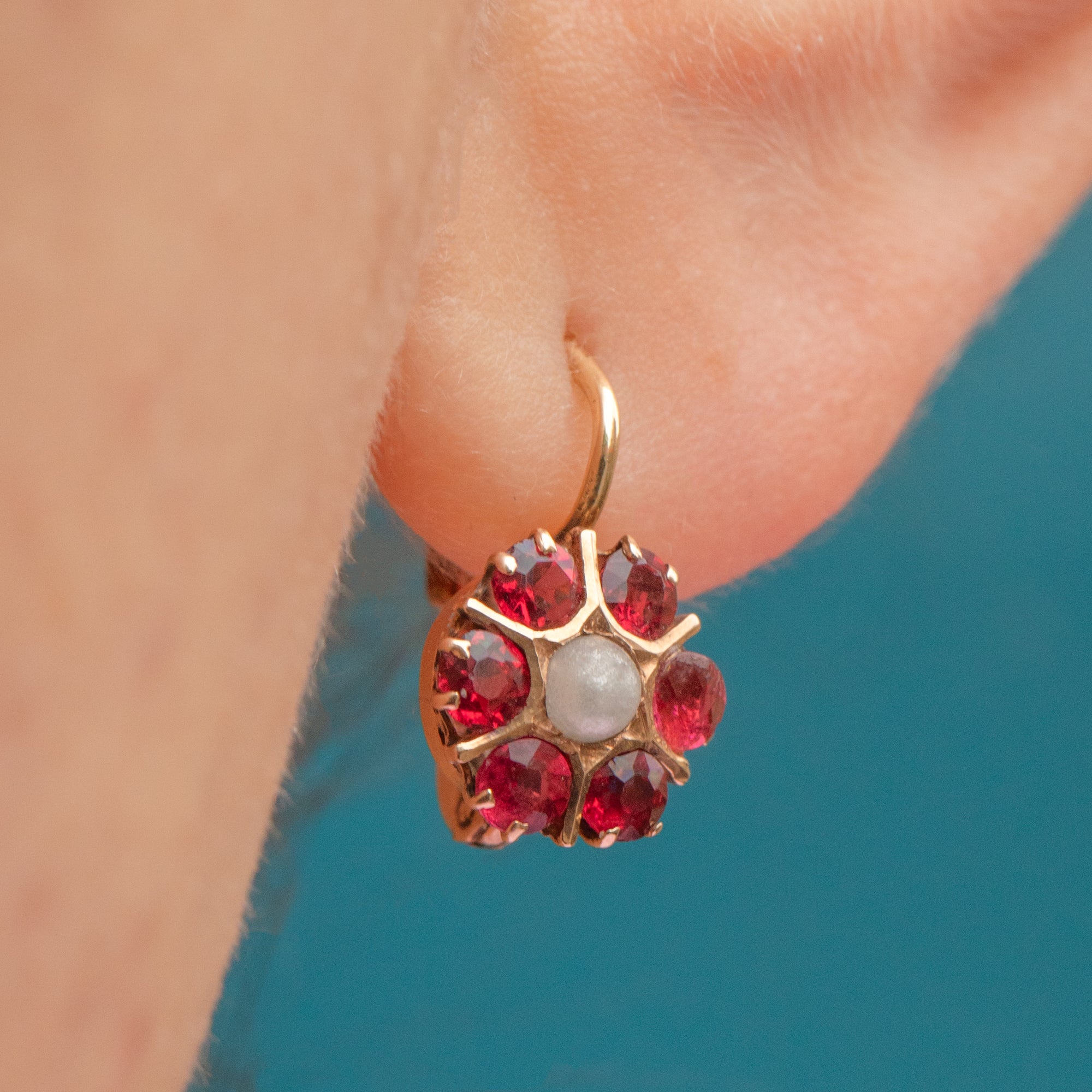 VERY GOOD-EXCELLENT: These antique 15ct Gold Paste Pearl lever back earrings are in great condition! Each gemstone is set securely and the earrings have been crafted meticulously. There is some light surface wear to the 9ct Gold, though this is expected with age. With secure lever backs, these Austro-Hungarian floral earrings can be worn with confidence.