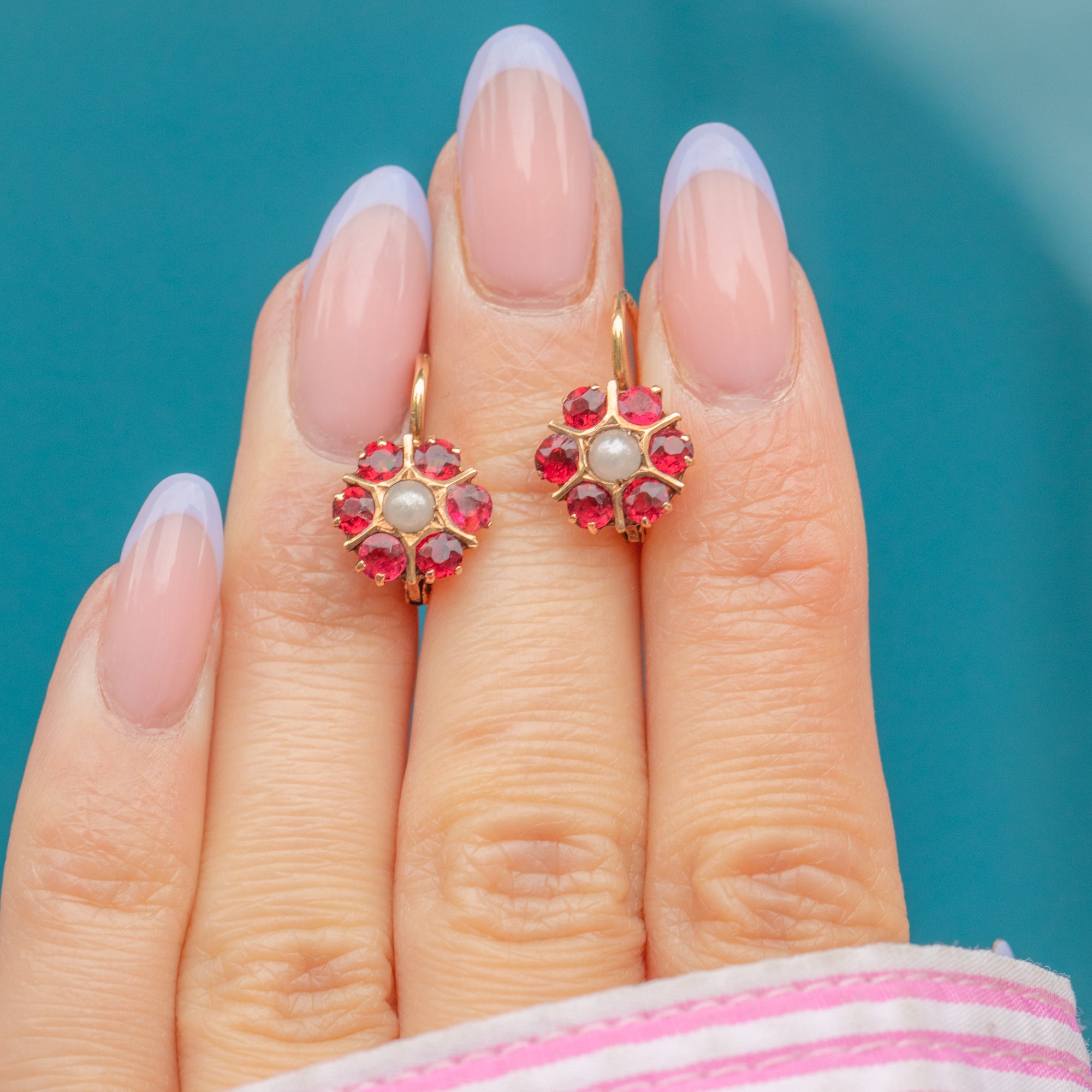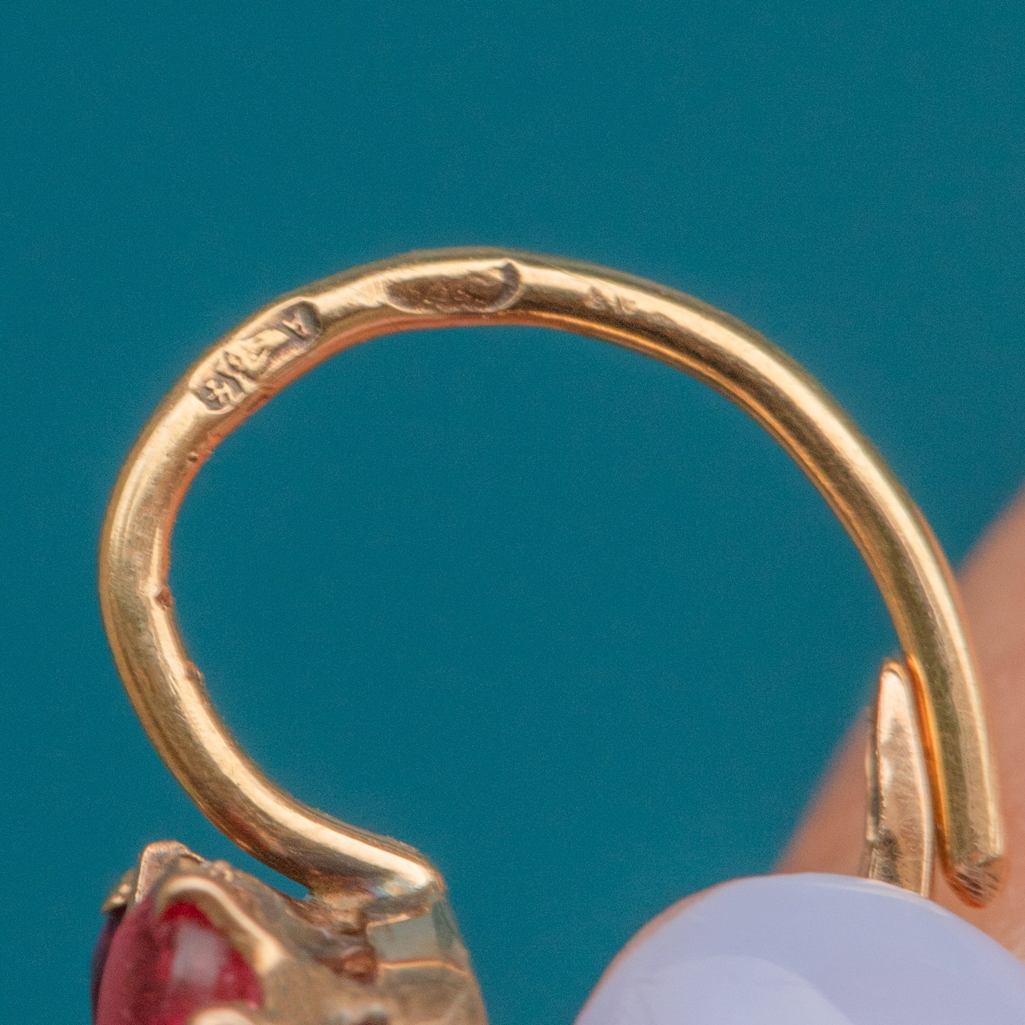 Each petite lever back earring akin to a bright petunia, they are crafted from vibrant fuchsia Paste and adorned with an iridescent Pearl. Their lever backs allow you to wear this lightweight pair with comfort and elegance, and with each complete with an Austro-Hungarian 'A' Dog's Head indicative of Austrian origin, these buttery 15ct Gold earrings are full of antique charm.