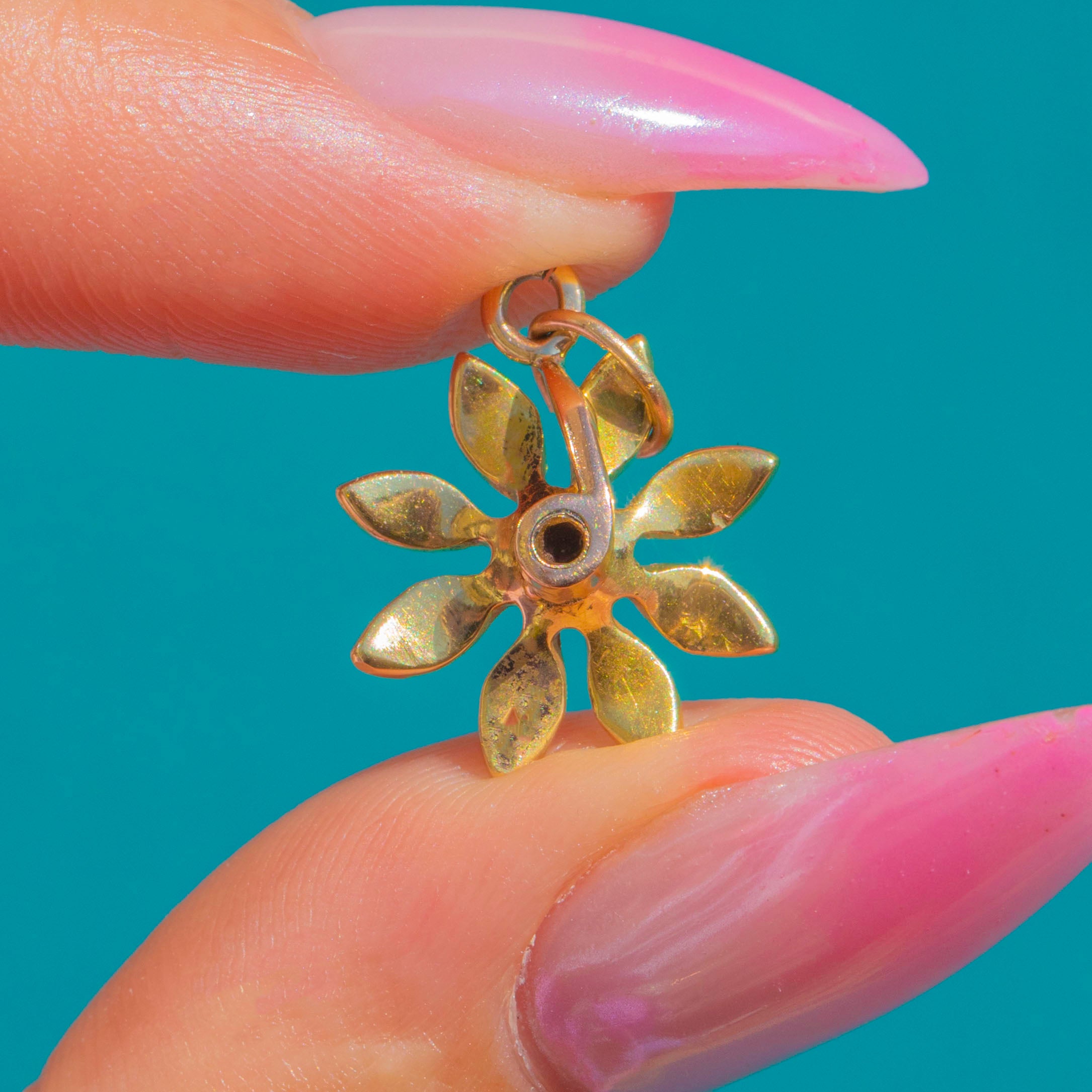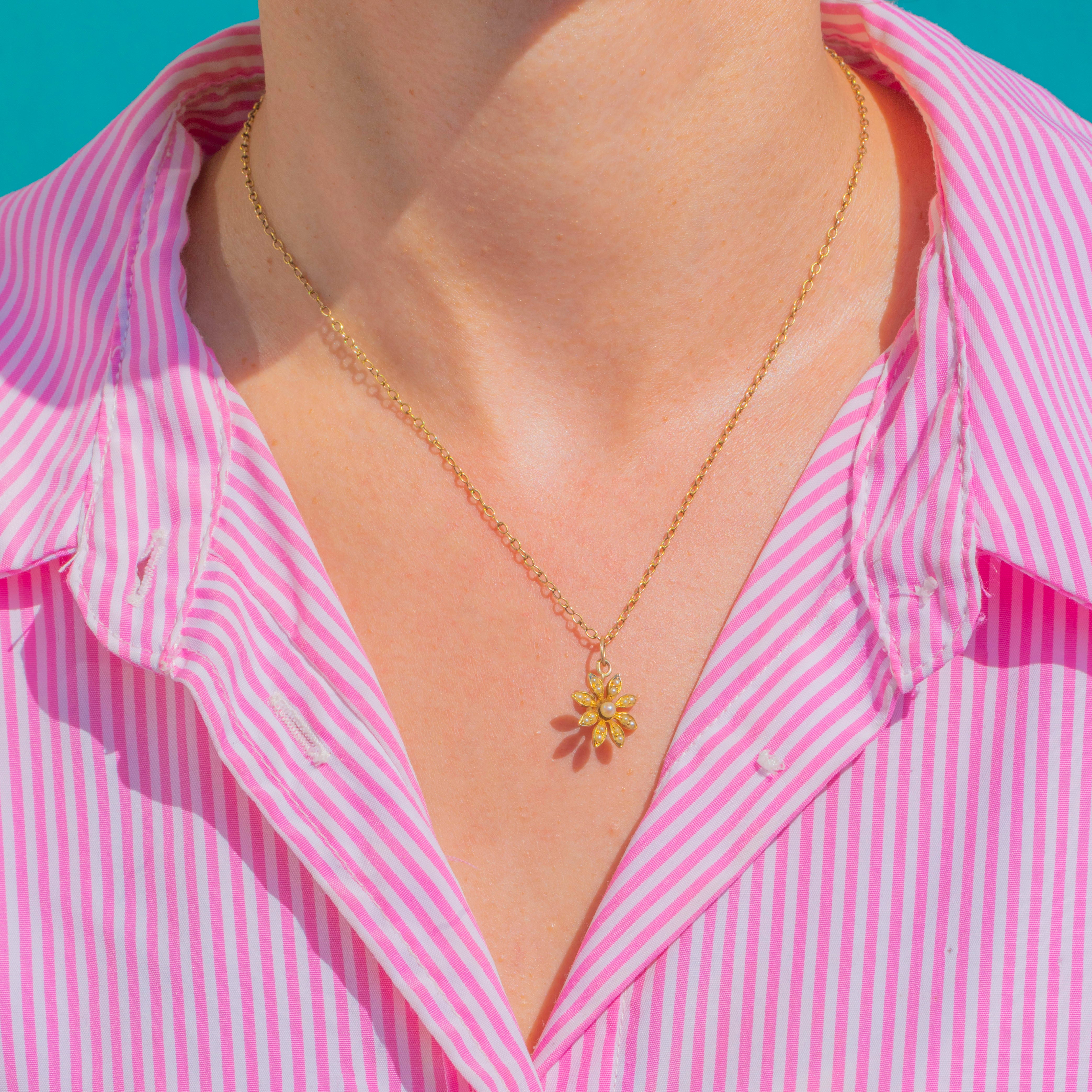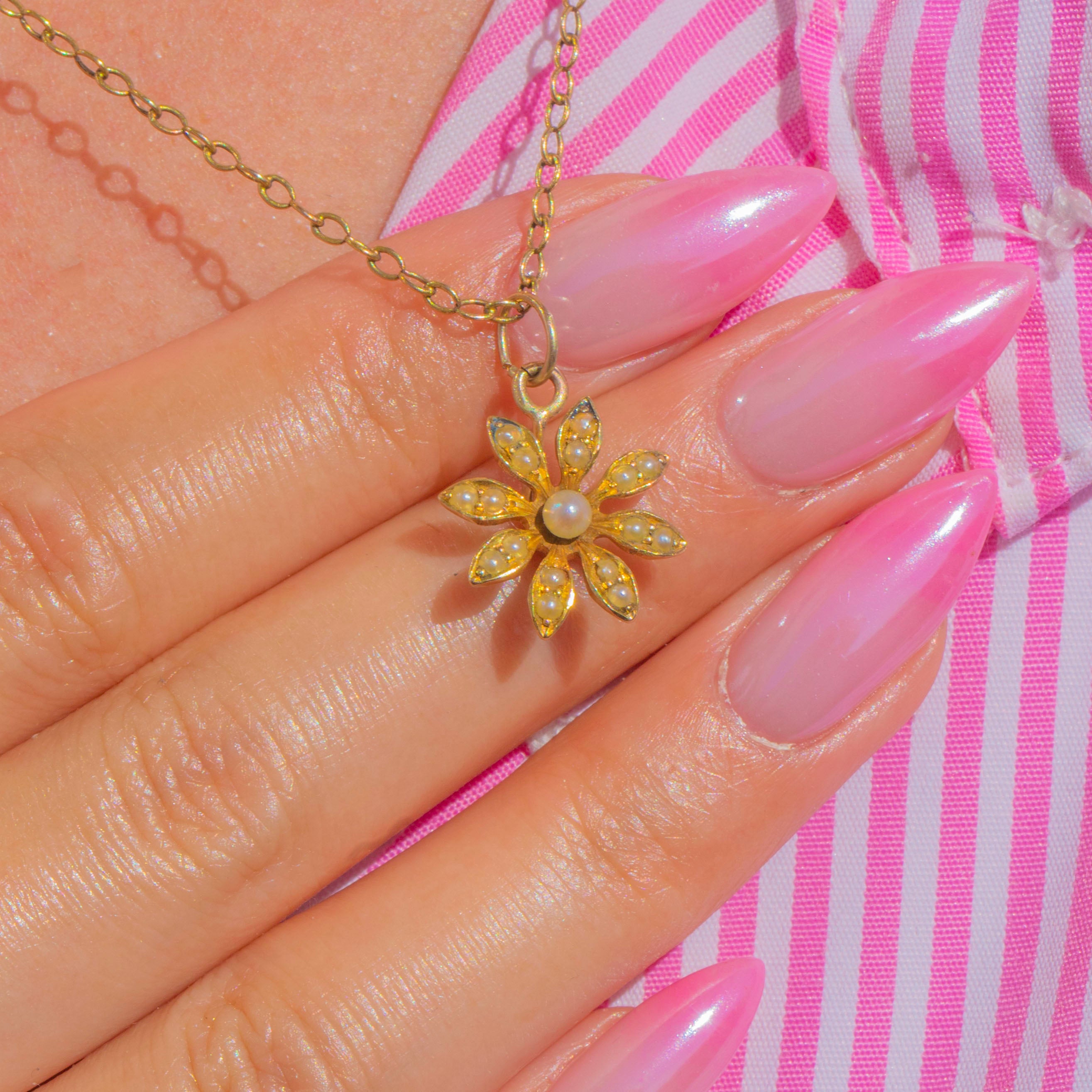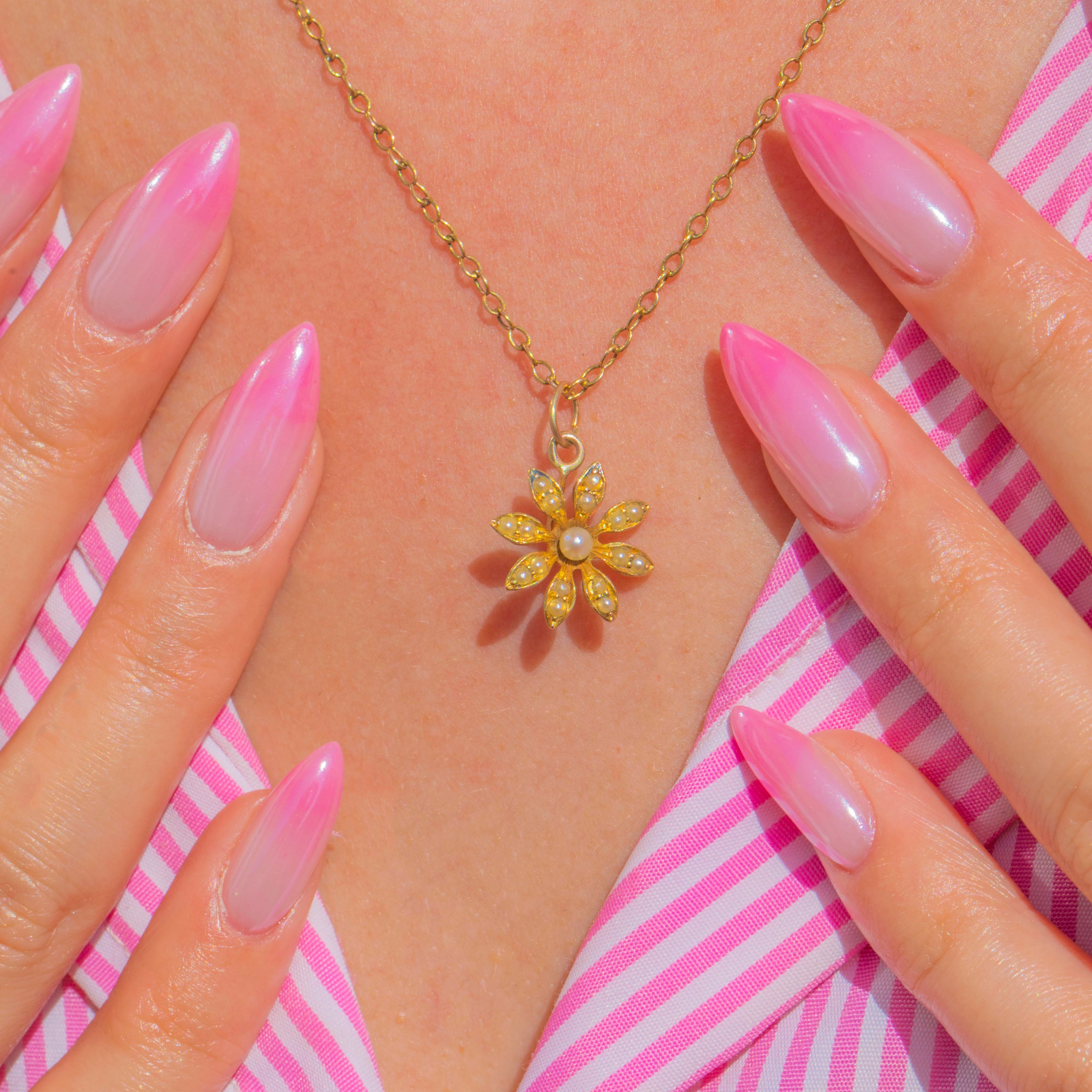 Delicately formed in rich 15ct Gold, this Victorian flower charm blooms with luminous Pearls. A central Pearl rests at the heart of the motif, with fine seed Pearls accenting each petal to create a timeless, romantic silhouette.