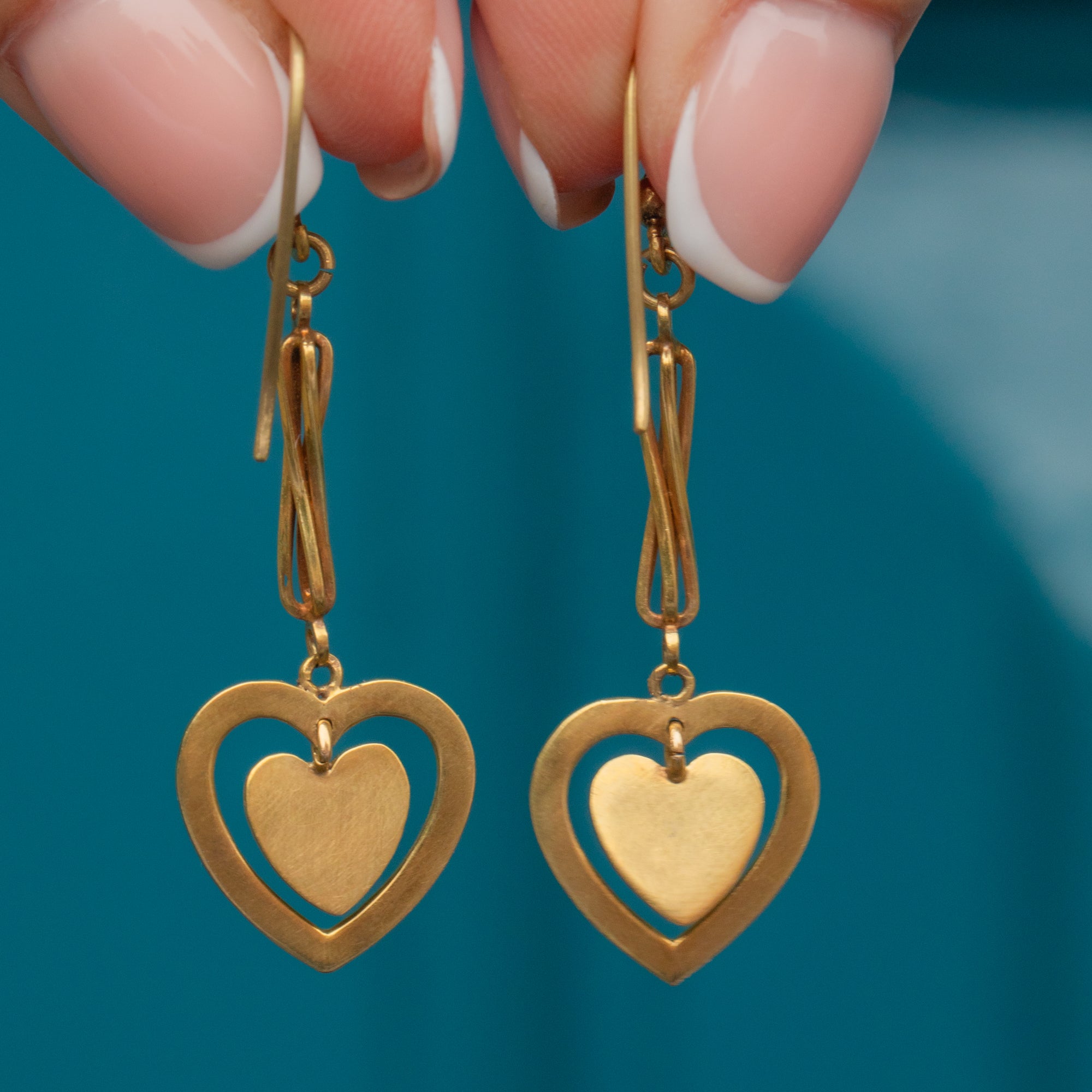 Their heart drops are suspended from perfectly interlinked knots, creating a lovely fluidity as they dance beside your cheeks. Crafted entirely from saturated 15ct Gold, these Victorian Gold earrings will glow beneath the light, sure to catch the eyes of onlookers whether you style your hair up or down!