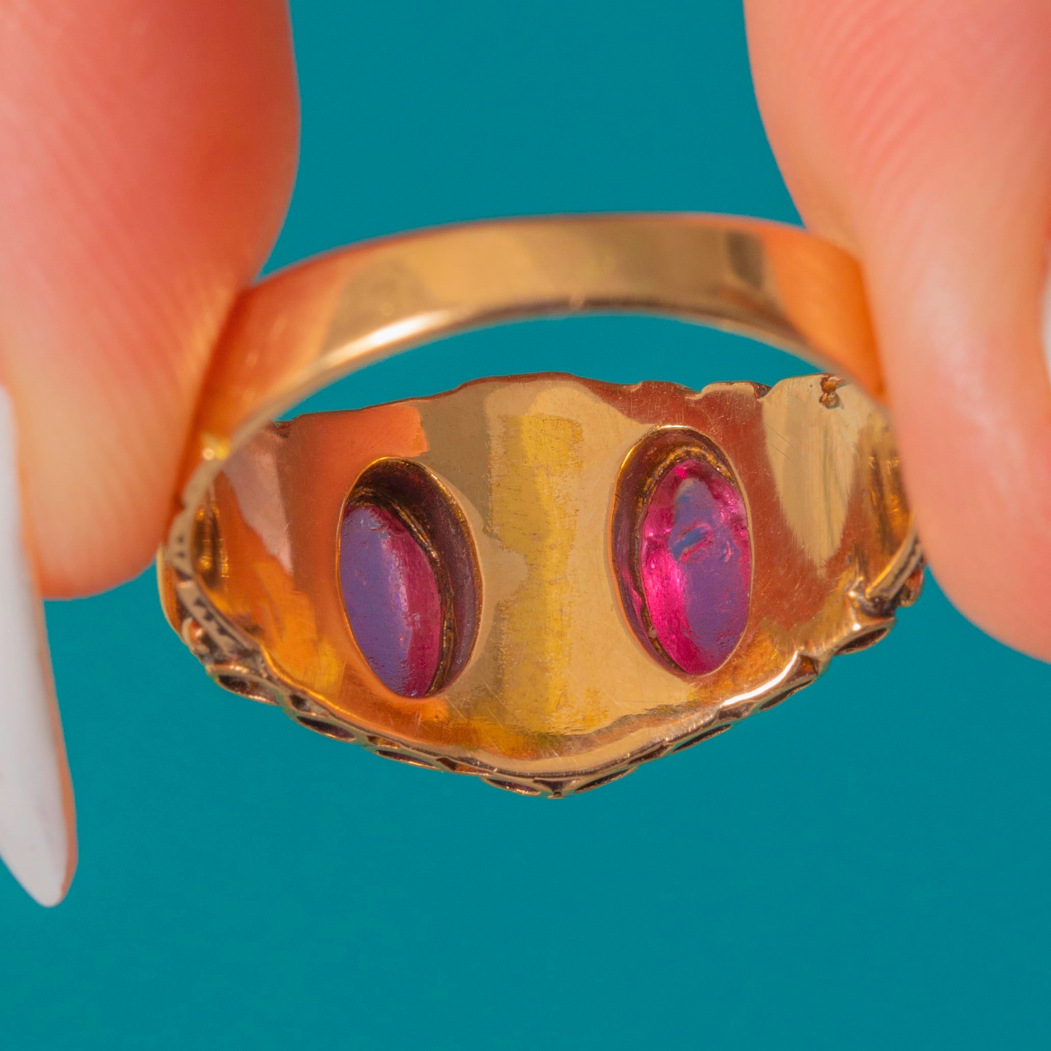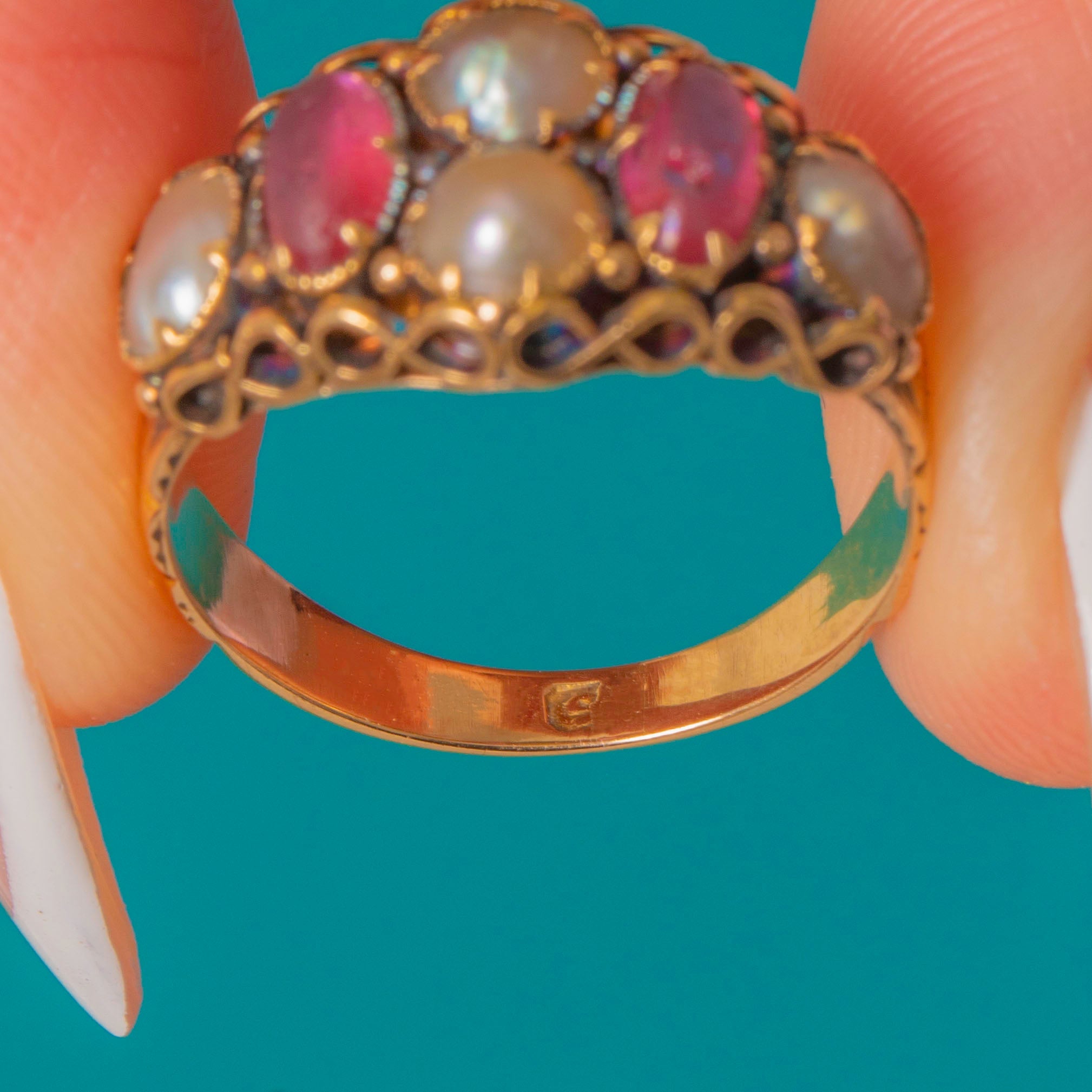 VERY GOOD: This antique 15ct Gold pink Paste Pearl cluster ring is in very good condition. Each of her gemstones is securely set, and the 15ct Gold is bright and buttery. There are some signs of wear, including nibbles to the Paste and light scratches to the Gold, though this is difficult to spot without a jeweller's loupe. The band is robust and feels comfortable to wear, promising many more years of enjoyment!