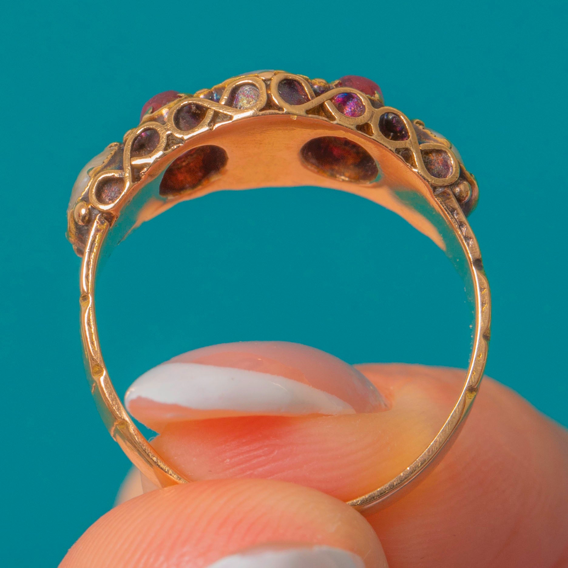 This antique ring is an exemplar of Victorian craftsmanship, formed from buttery 15ct Gold throughout with ornate settings and engraved shoulders providing her with a lovely texture. A brilliant piece to stack or wear alone, this antique Paste and Pearl ring is a must-have!