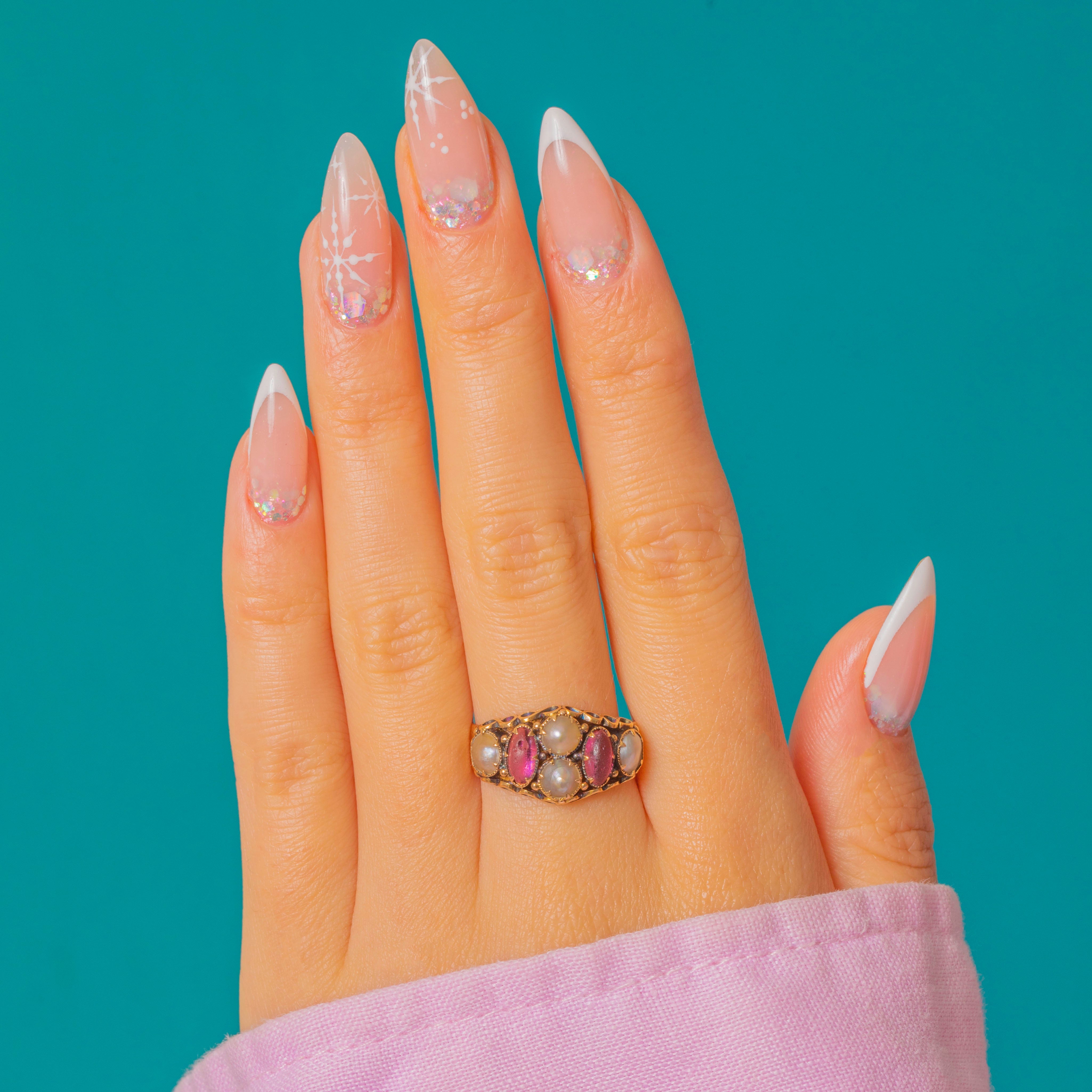 Radiating Victorian charm, this six stone ring flaunts two vibrant fuchsia pink Paste stones flanked by four iridescent Pearls, giving this ring a decadent and feminine appeal.